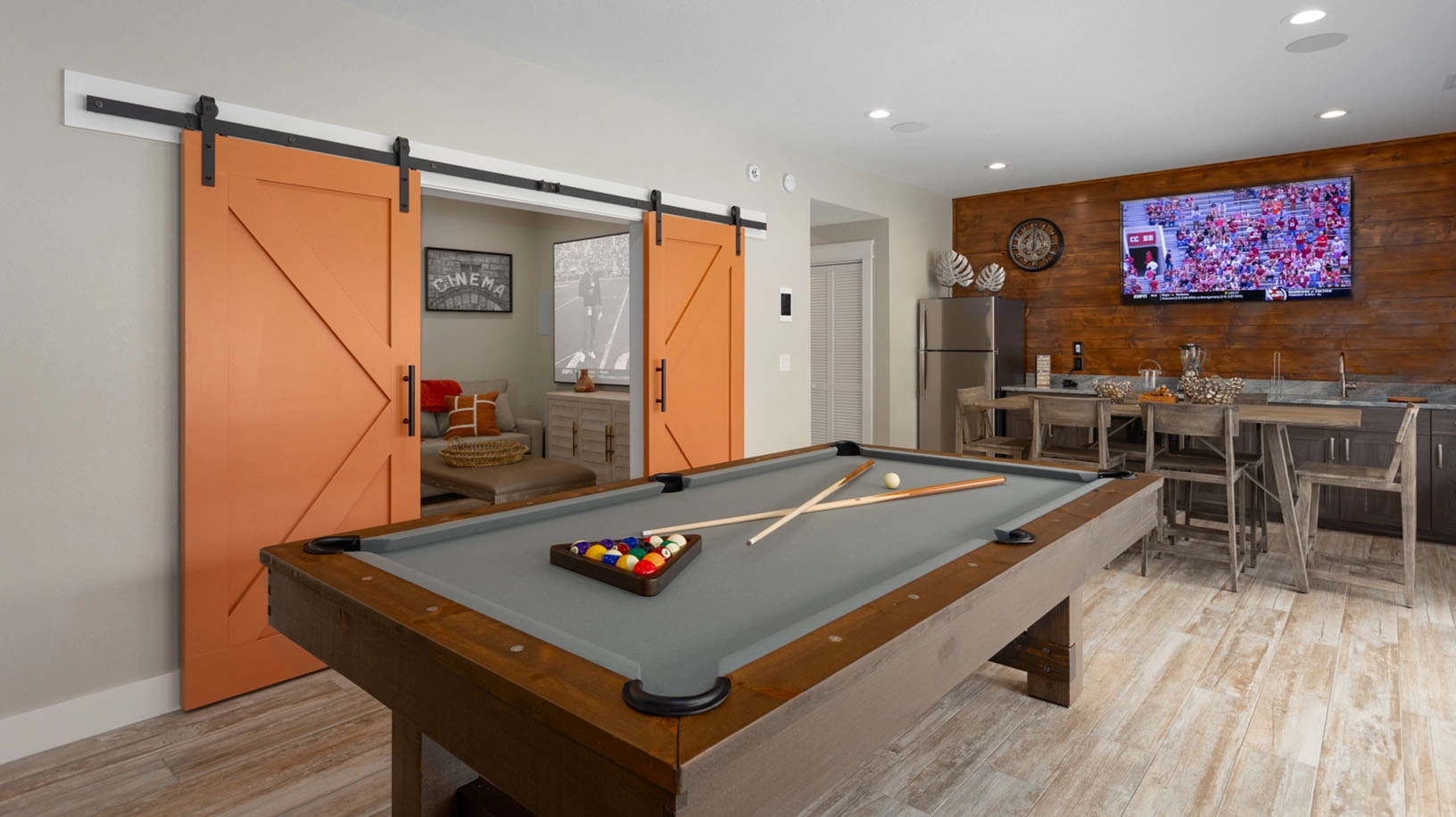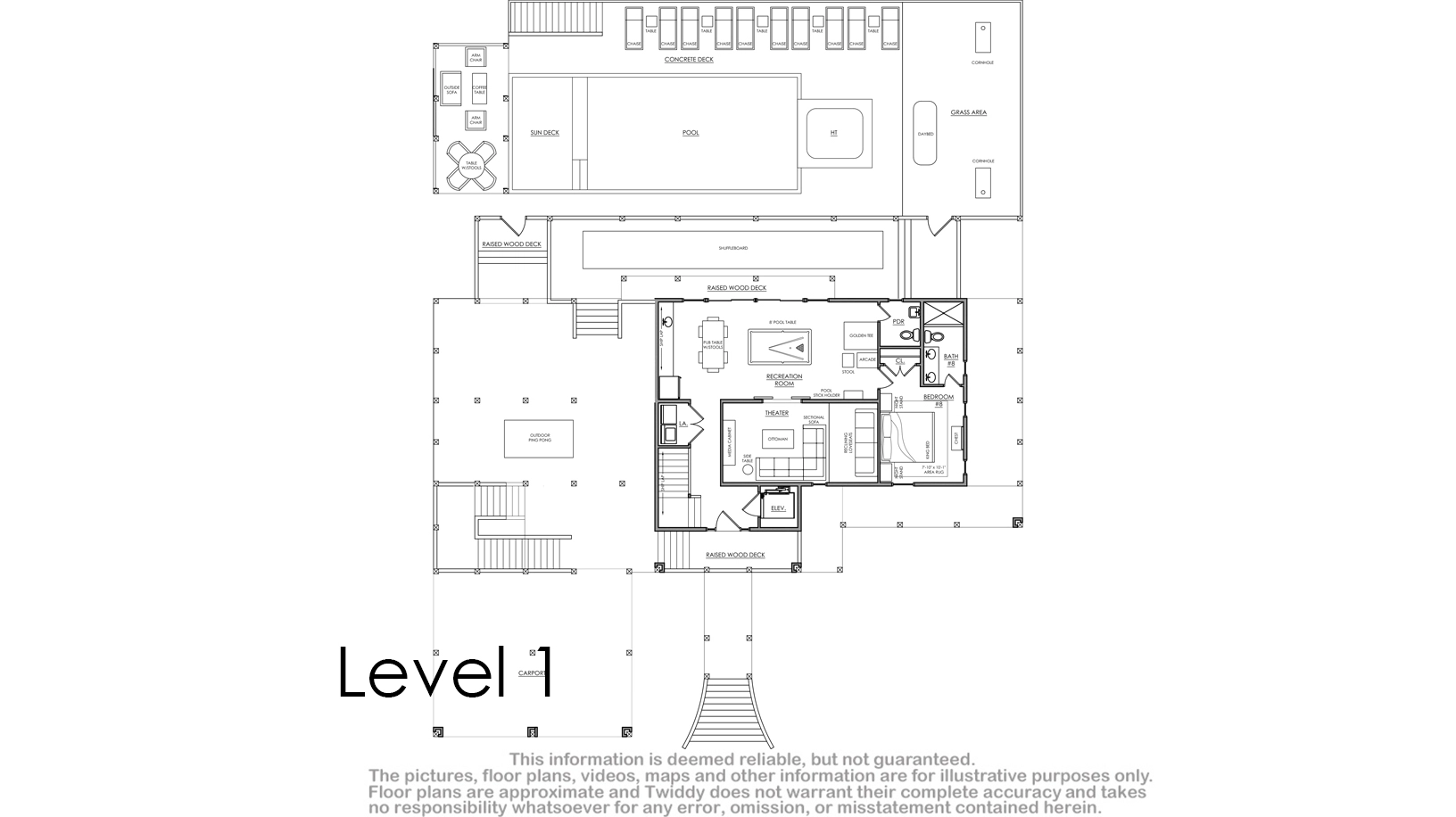 Theater room; rec room with pool table, arcade game, and wet bar with refrigerator and stand-alone ice machine; laundry.