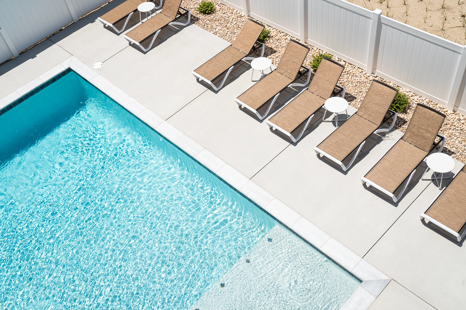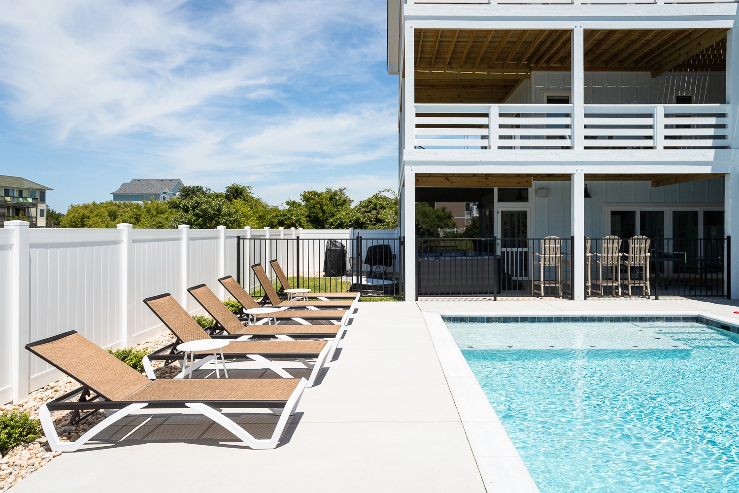 The great room on the home's top floor is as functional as it is attractive. Large, ocean-facing windows allow natural light to fill the space, which features modern coastal decor. The living area includes multiple sitting areas, offering an area to relax no matter what you are doing. Chat with loved ones and watch TV on the large sofa. A small table and chairs nearby allows you to be included in the conversation while enjoying a cup of coffee or afternoon tea. Outside on the deck, soak in the sunshine while checking out the ocean across the street. Back inside, an additional sitting area is in the center of the great room, adjacent to the wet bar. Stock the wet bar with your family’s favorite beverages for easy access to drinks throughout your stay. Up the small set of stairs, the ship’s watch is a great place to sneak away with a good book. The cooks in your group will love the kitchen, which includes two gas stoves, two refrigerators, and plenty of counter space, all in a thoughtfully designed layout. When it’s time to clean up, the two dishwashers in the kitchen come in handy. Eat, drink, and be merry in the large dining area nearby, which includes a large dining table and barstool seating at the kitchen island. Or choose to dine outdoors on the covered portion of the deck. Additional seating options are available in the sunshine on the deck that overlooks the pool area. A half bathroom is conveniently located on the third floor of the home.
