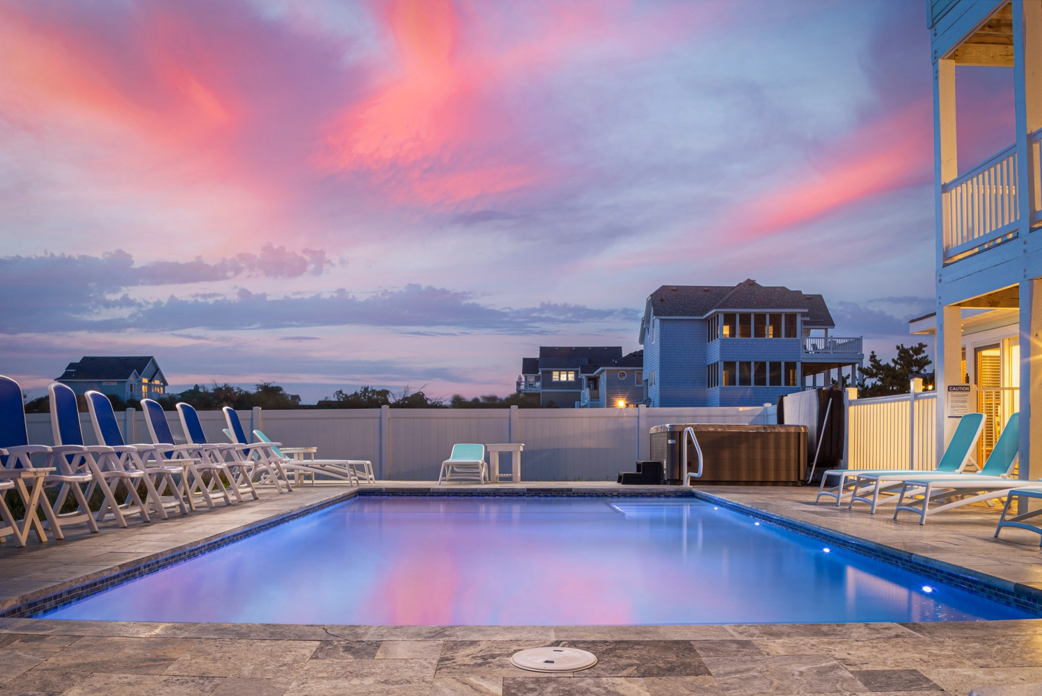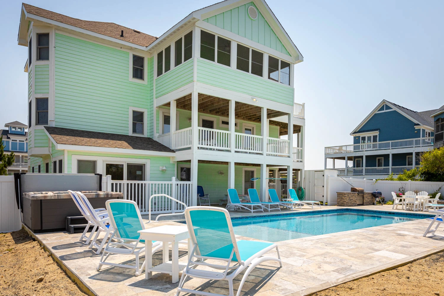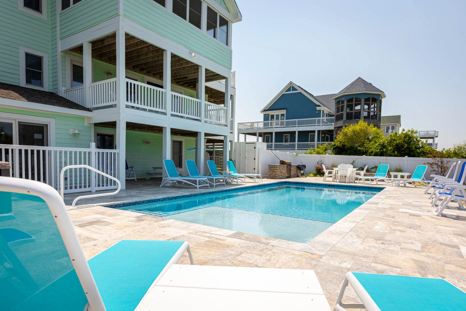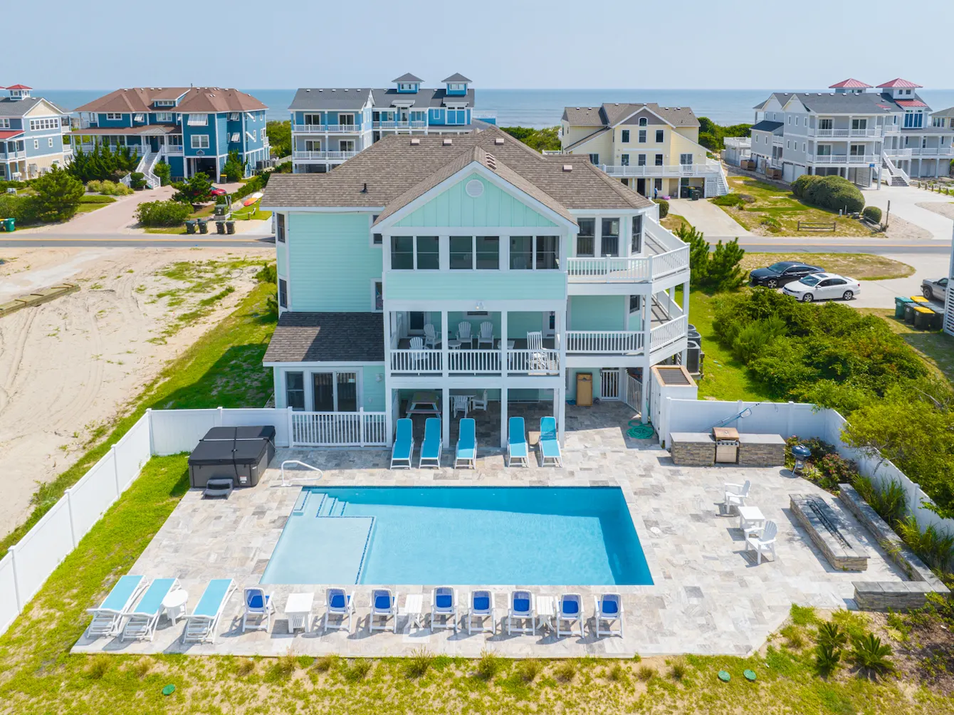 "This is a great house in a great location! We had a group of 18 and had plenty of space for all of us in the house. But what really sold it online was the pool area and it did not disappoint in person! With that many people, you need a little breathing room and that pool area delivered. Also we loved the neighborhood feel in Whalehead. We allowed our younger teens to rent bikes to give them a little freedom and we didn’t worry about them going on main roads since the streets connected to the nearest shopping plaza. Lastly, the beach access was a very short walk, so not being directly on the beach wasn’t an issue. My only complaint was that some of the bathrooms were tiny with limited counter space. Also, there was no direct access from the balconies down to the pool area.good for security, not for convenience."