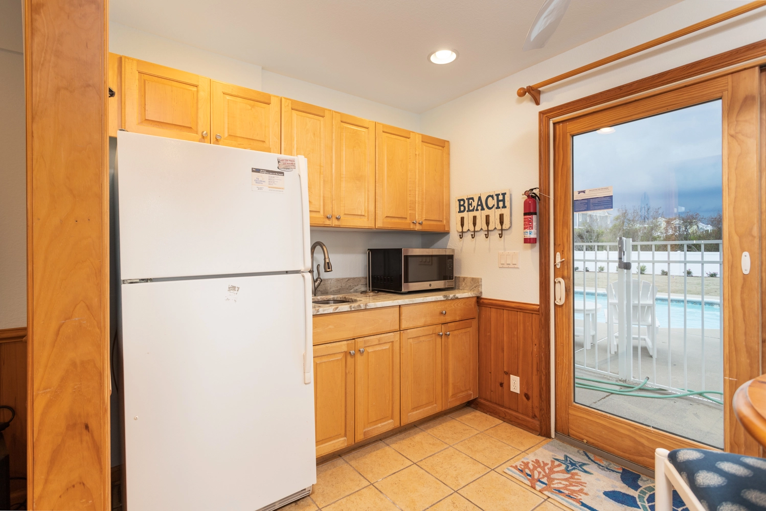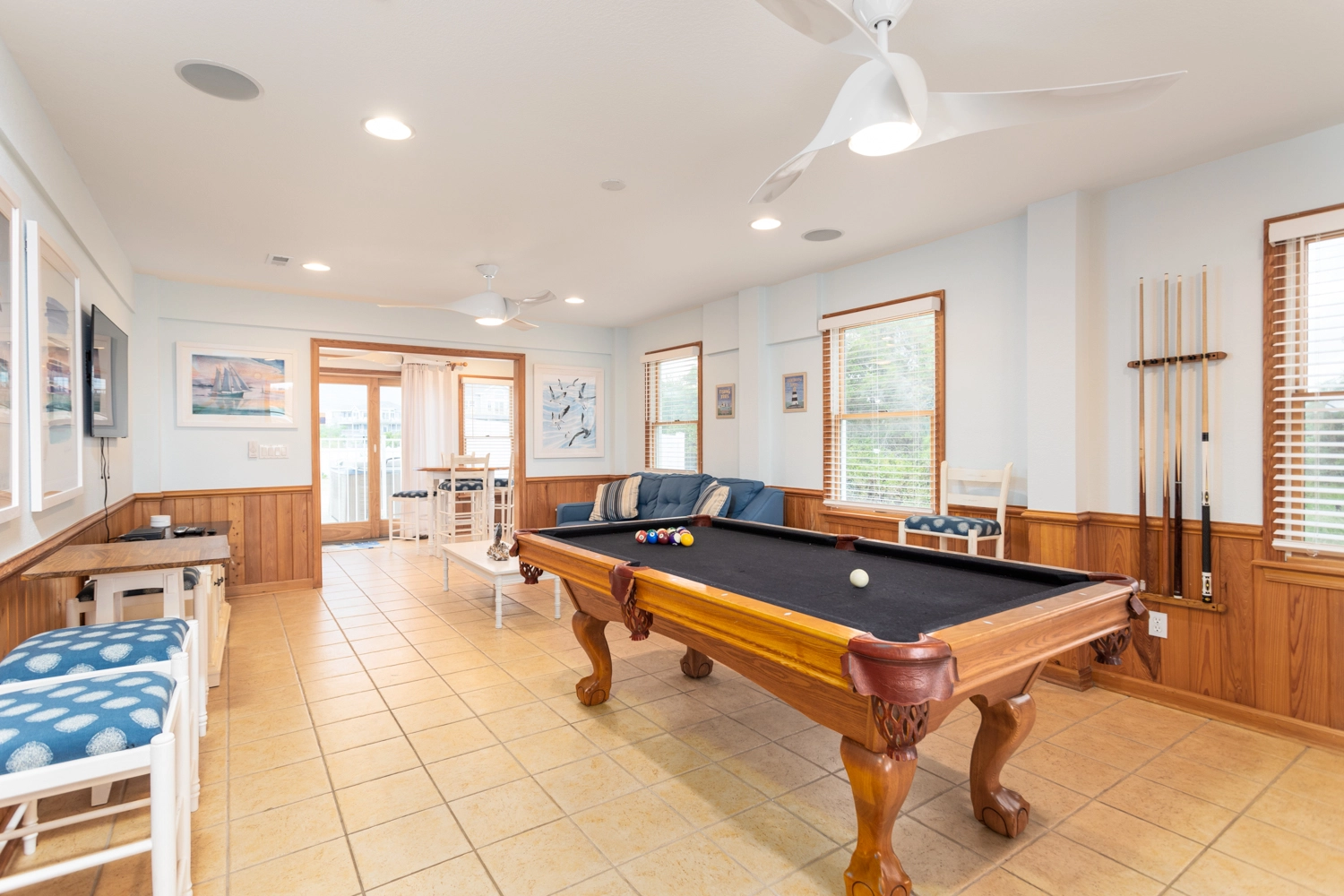 Rec room with pool table, surround sound, wet bar and kitchenette with refrigerator; access to gated private pool.