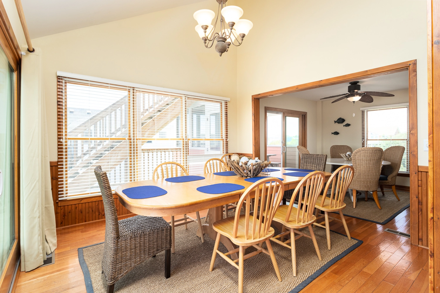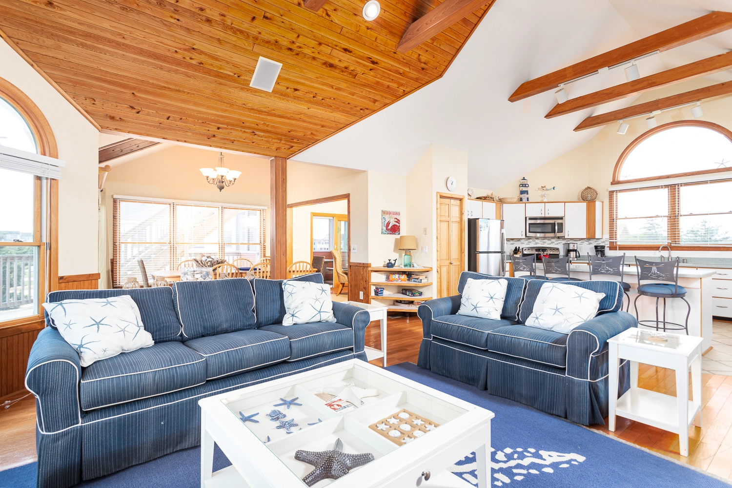 Great room with ocean views; kitchen with breakfast bar; dining room.