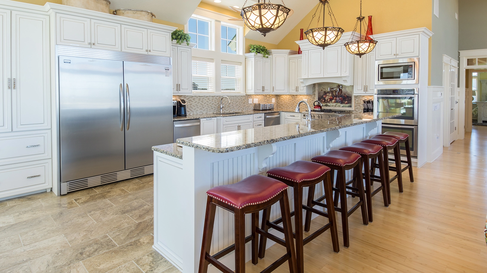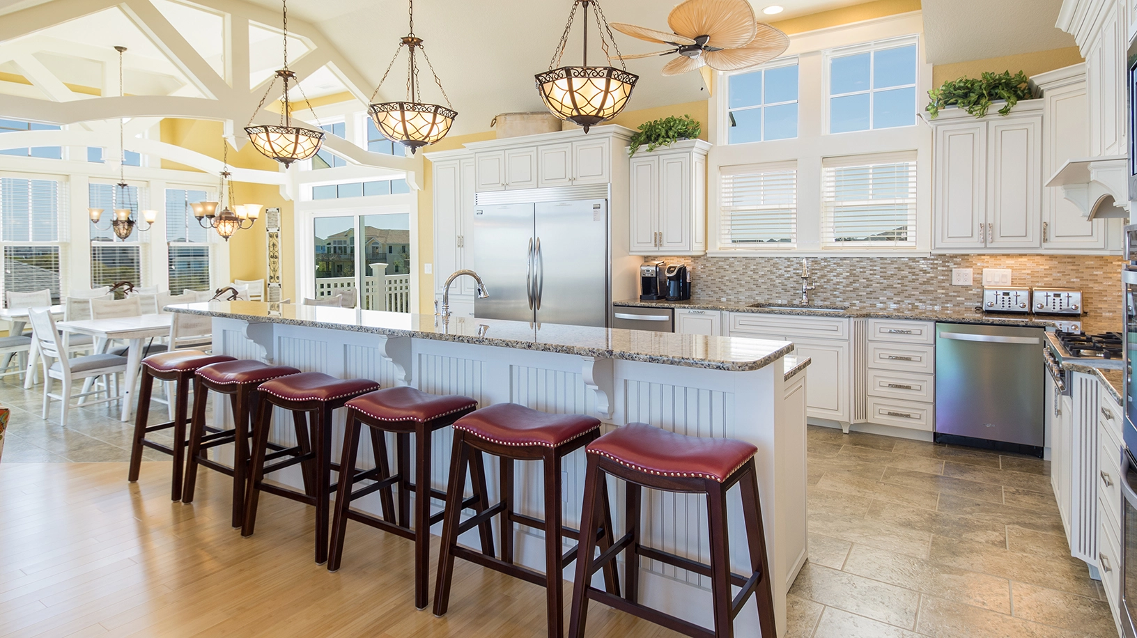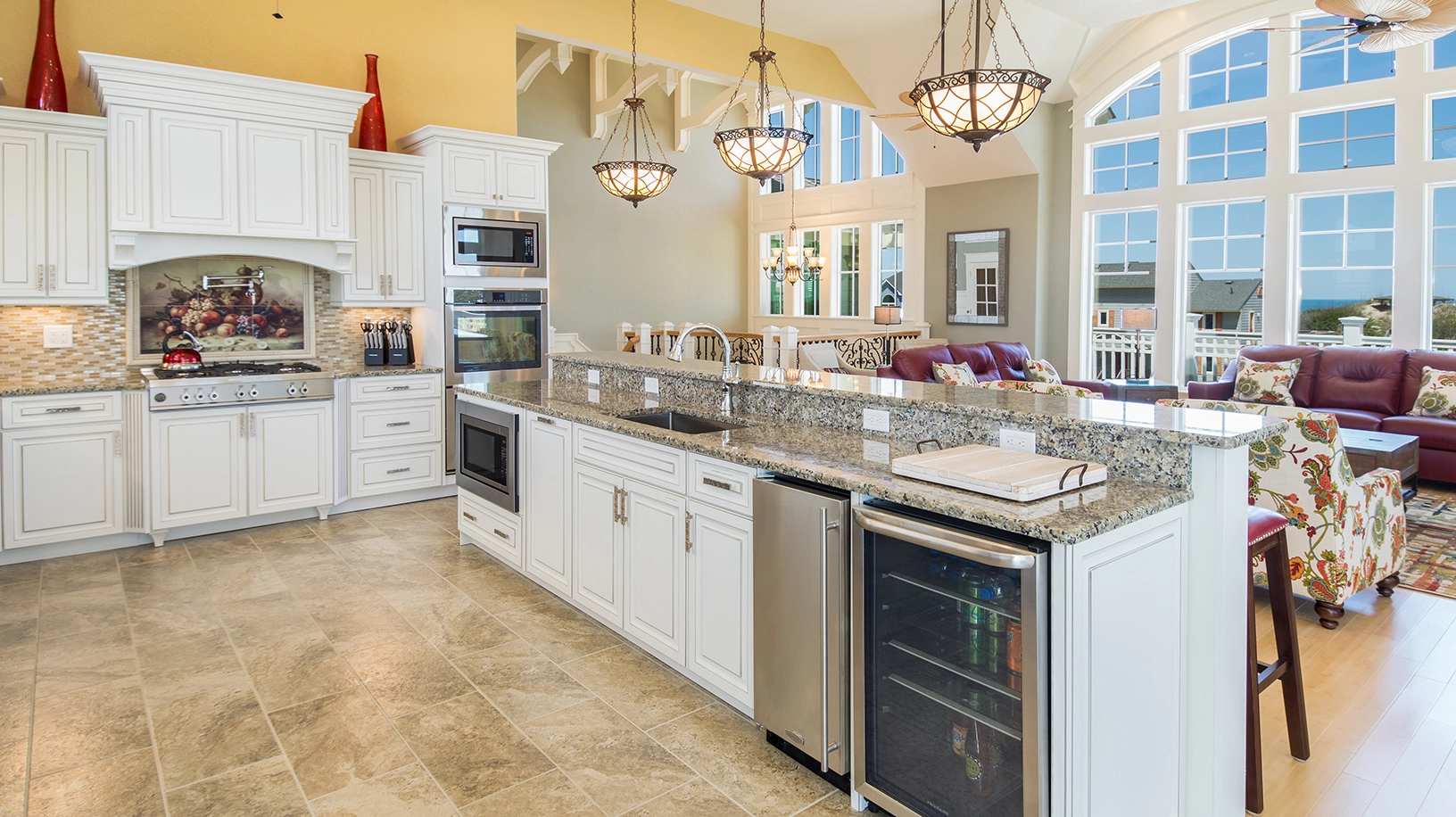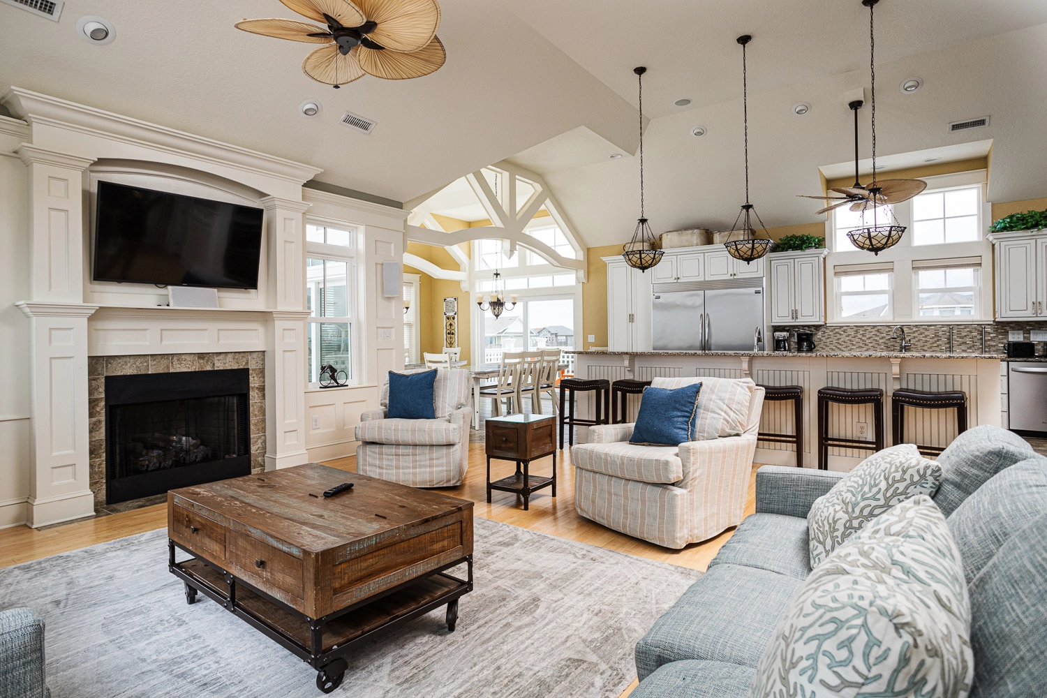 Great room with gas fireplace; dining area; gourmet kitchen with two ovens, two dishwashers, two microwaves and gas cooktop.