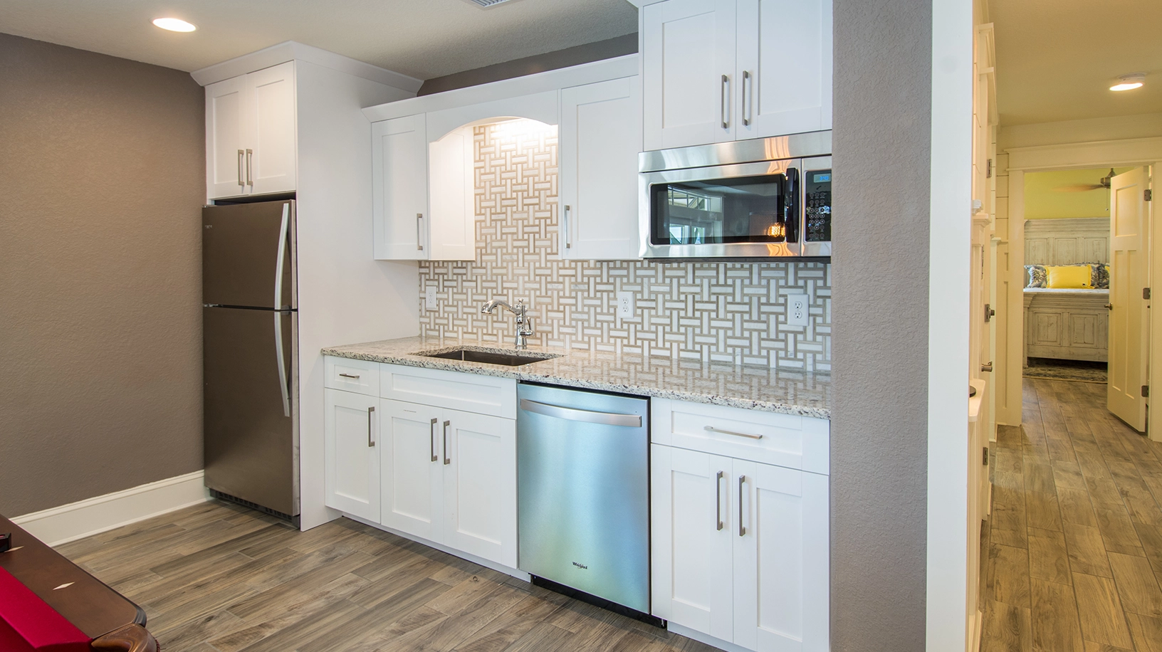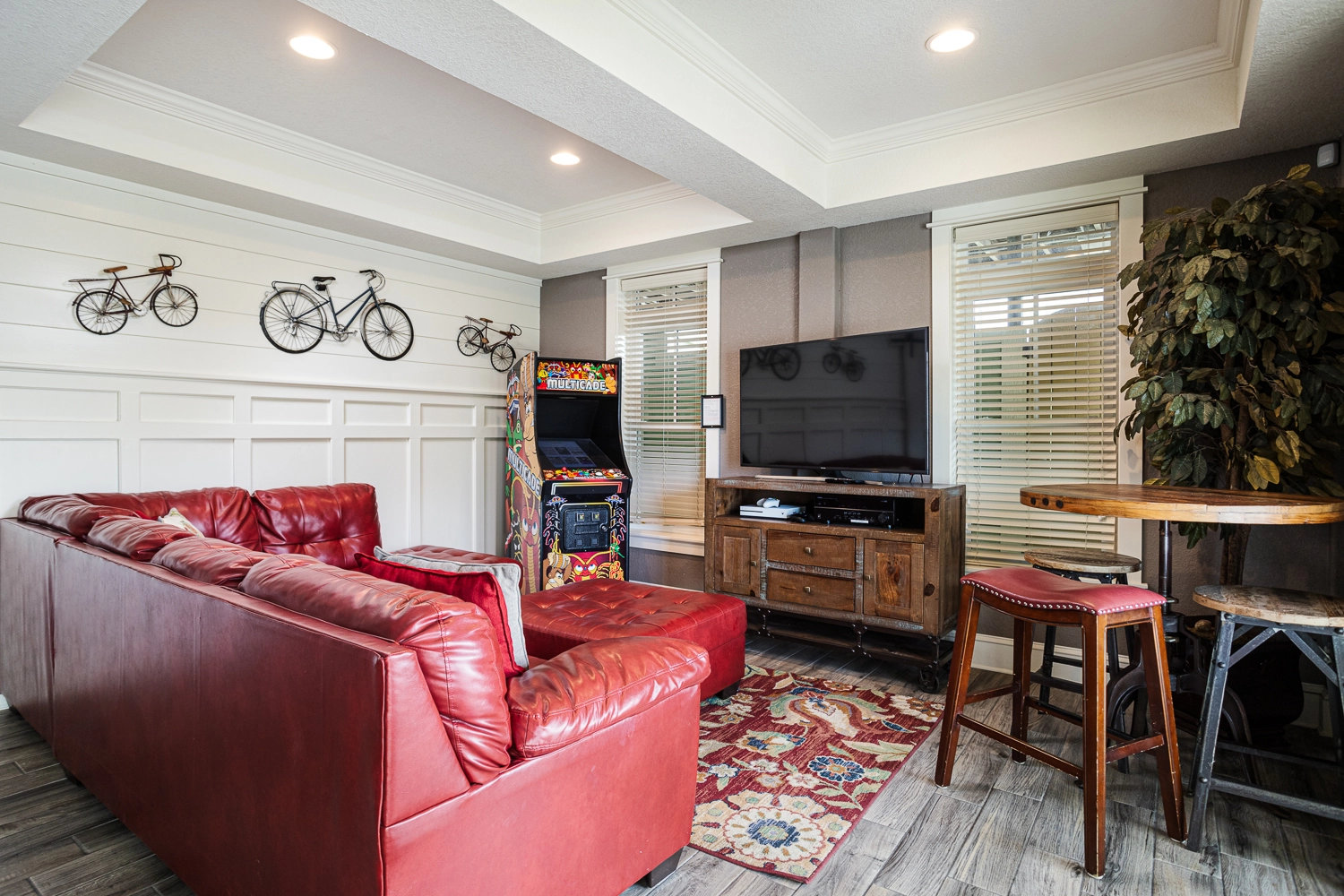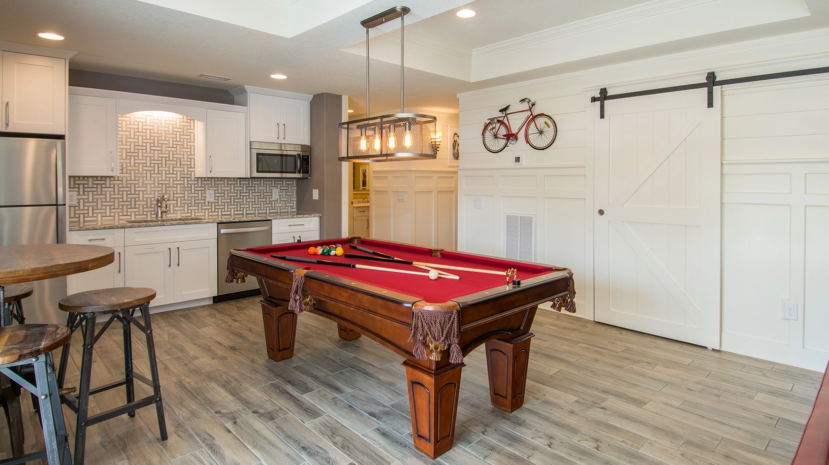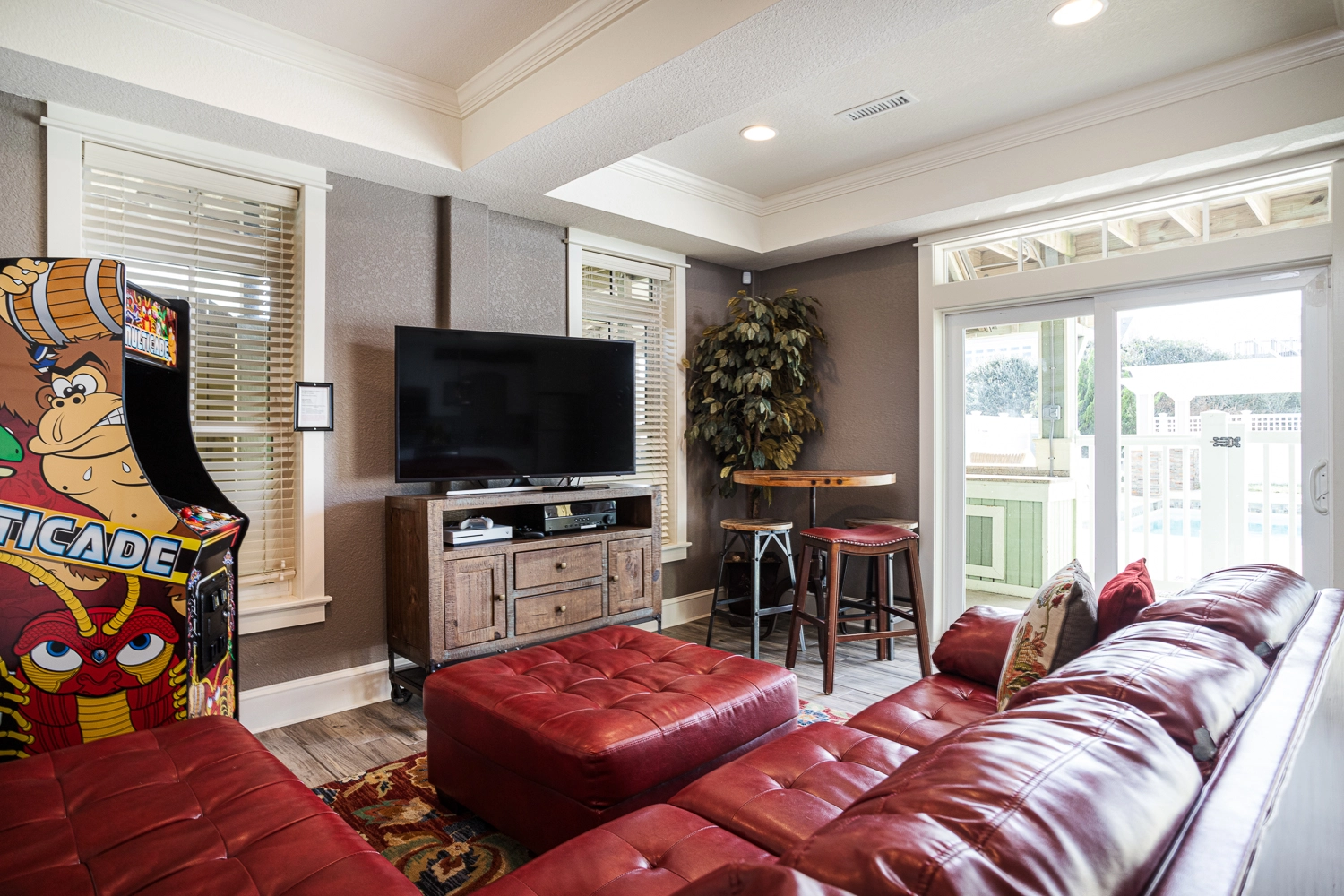 Theater room; rec room with pool table and arcade game, kitchenette and ice machine; half bath accessible from the outside only.