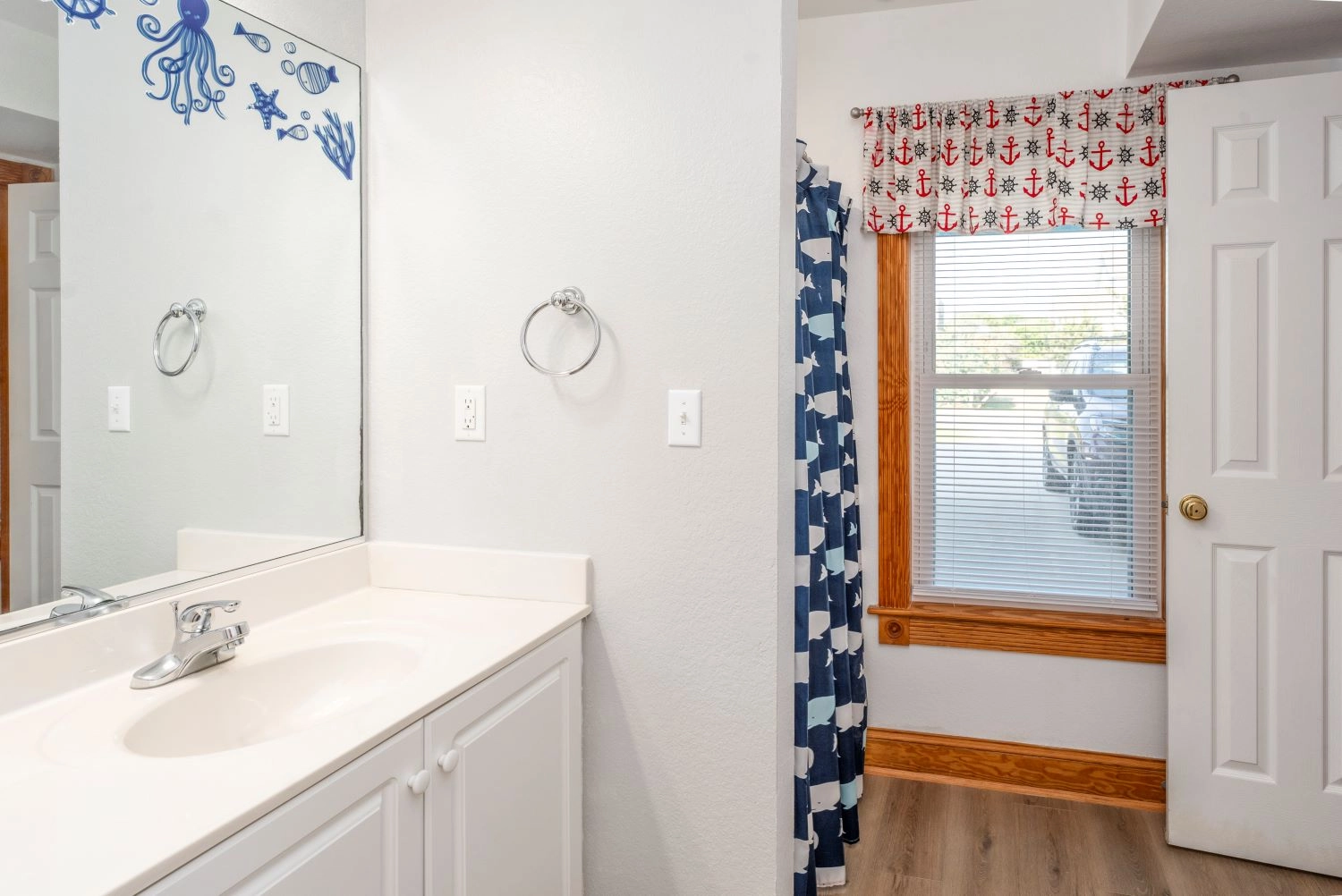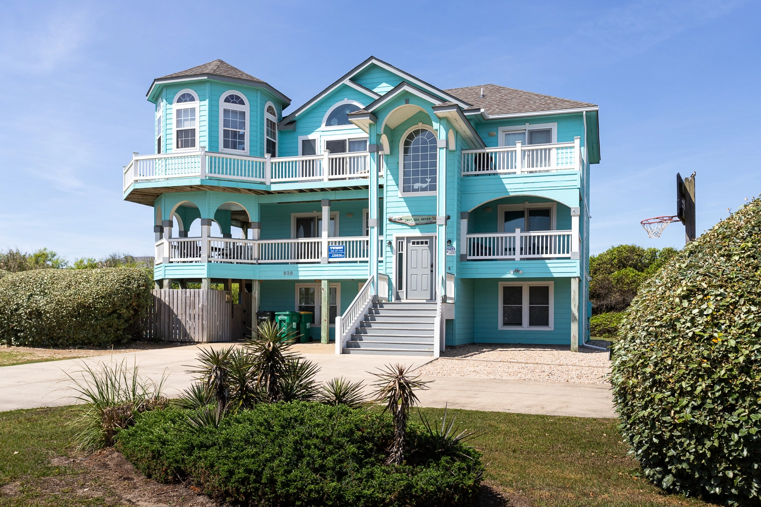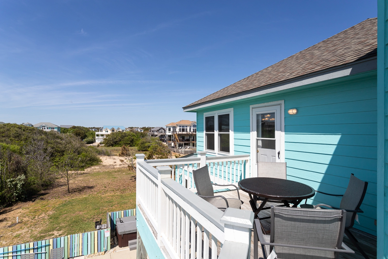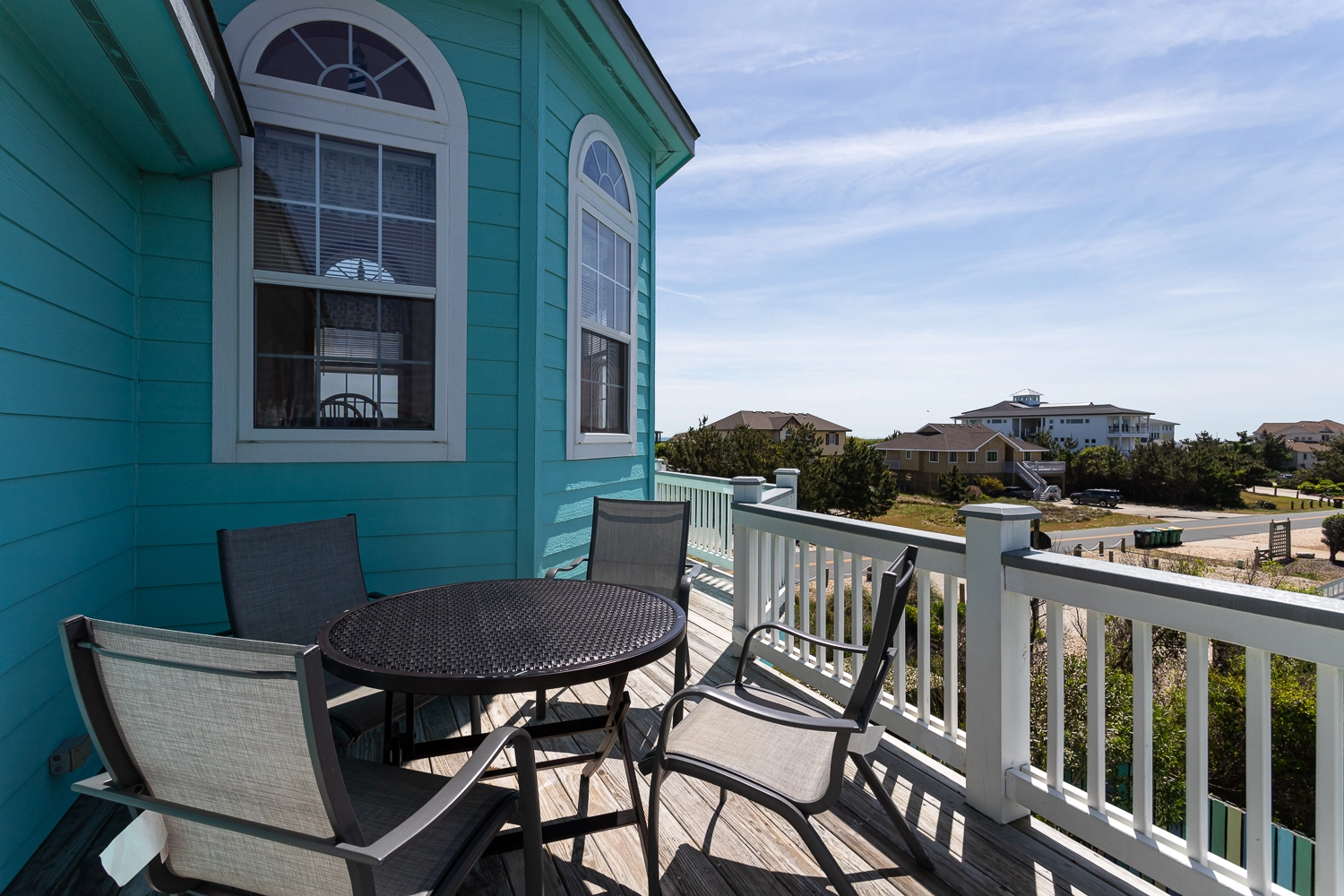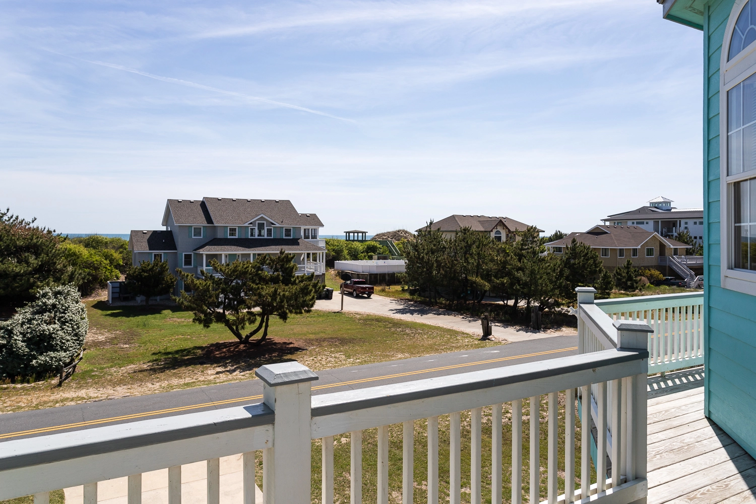 "The pictures are a bit dated because I drove right past it the first day! The pink house is now blue, which is gorgeous! They made several updates throughout the home (new furniture, new counters and appliances in the kitchen). Really a gorgeous home and great location. The kitchen was well stocked including a huge pot for steaming and a KitchenAid stand mixer! it’s right between 2 public access points to the beach and it has OK views of the ocean (nothing spectacular, but you can still hear the waves and smell the salt, which I love). The private balcony for the 3rd floor master bedroom is a huge blessing if you need some quiet time."