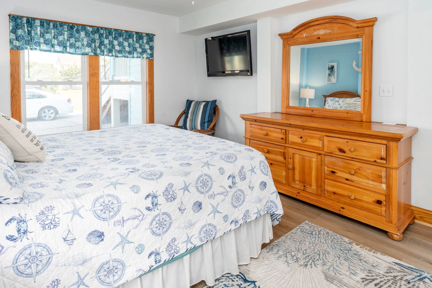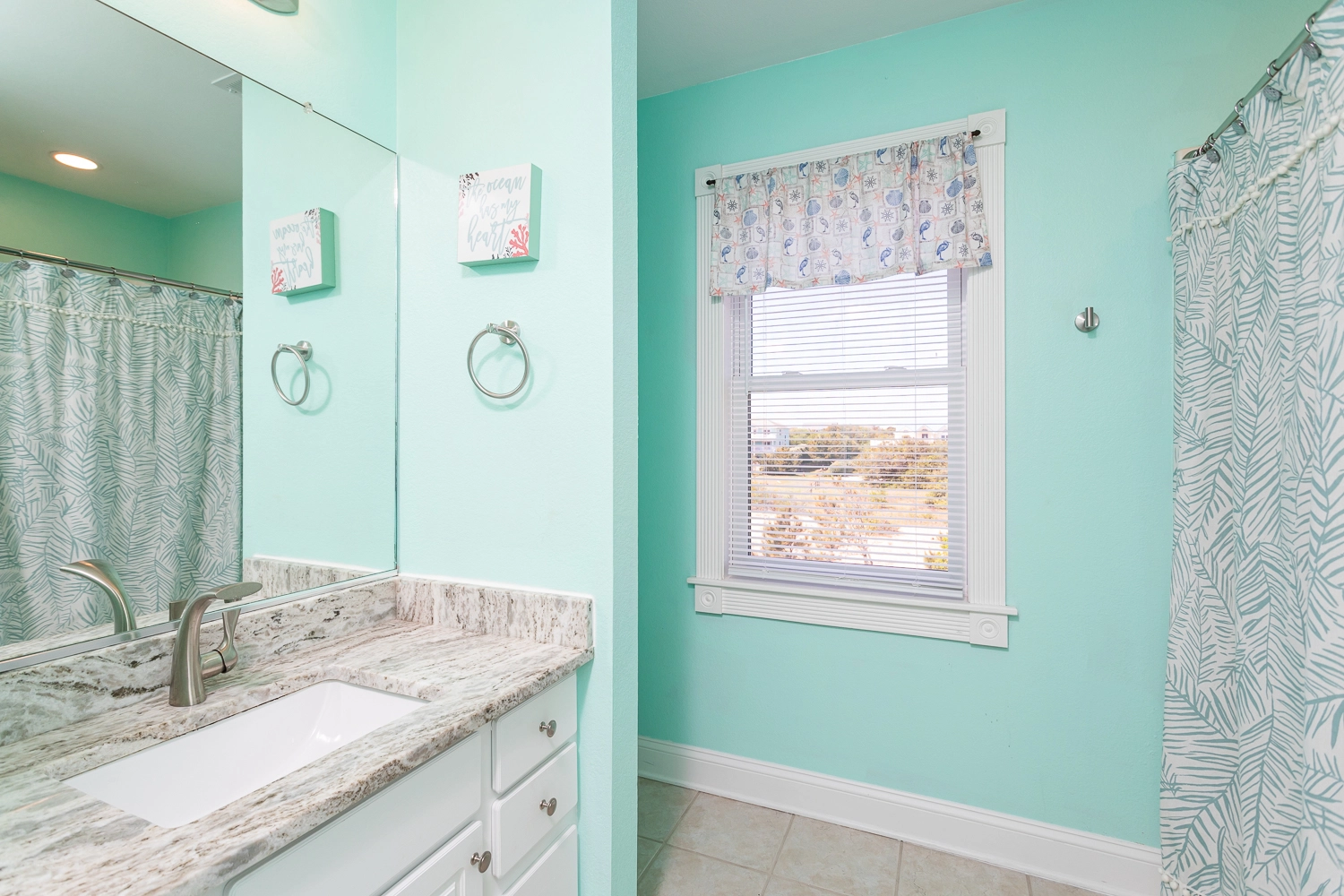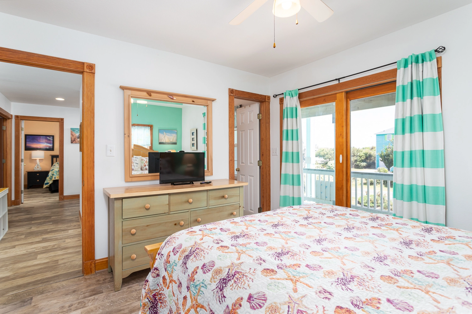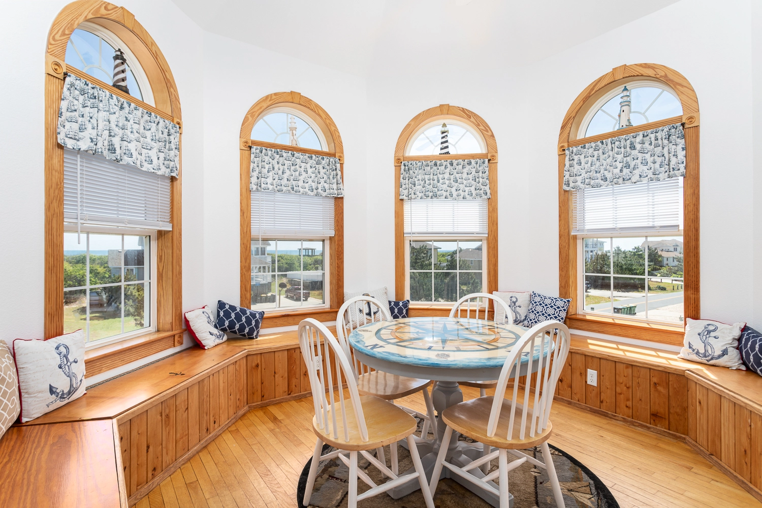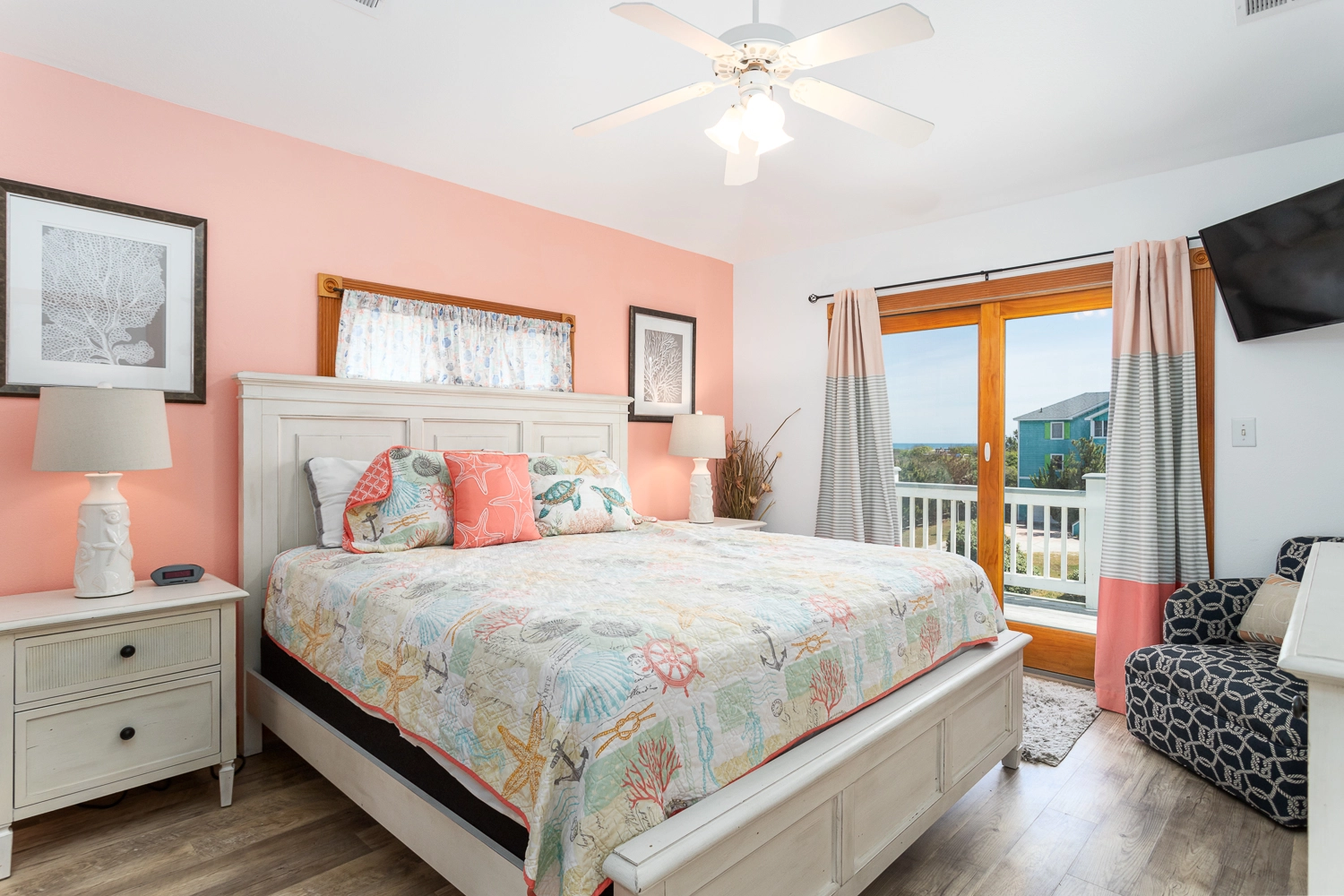 "The pictures are a bit dated because I drove right past it the first day! The pink house is now blue, which is gorgeous! They made several updates throughout the home (new furniture, new counters and appliances in the kitchen). Really a gorgeous home and great location. The kitchen was well stocked including a huge pot for steaming and a KitchenAid stand mixer! it’s right between 2 public access points to the beach and it has OK views of the ocean (nothing spectacular, but you can still hear the waves and smell the salt, which I love). The private balcony for the 3rd floor master bedroom is a huge blessing if you need some quiet time."