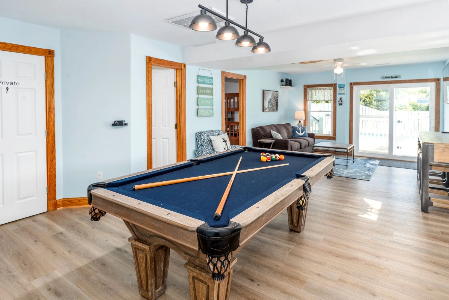Rec room with pool table, seating area, kitchenette, wet bar and refrigerator; patio with private pool and hot tub.