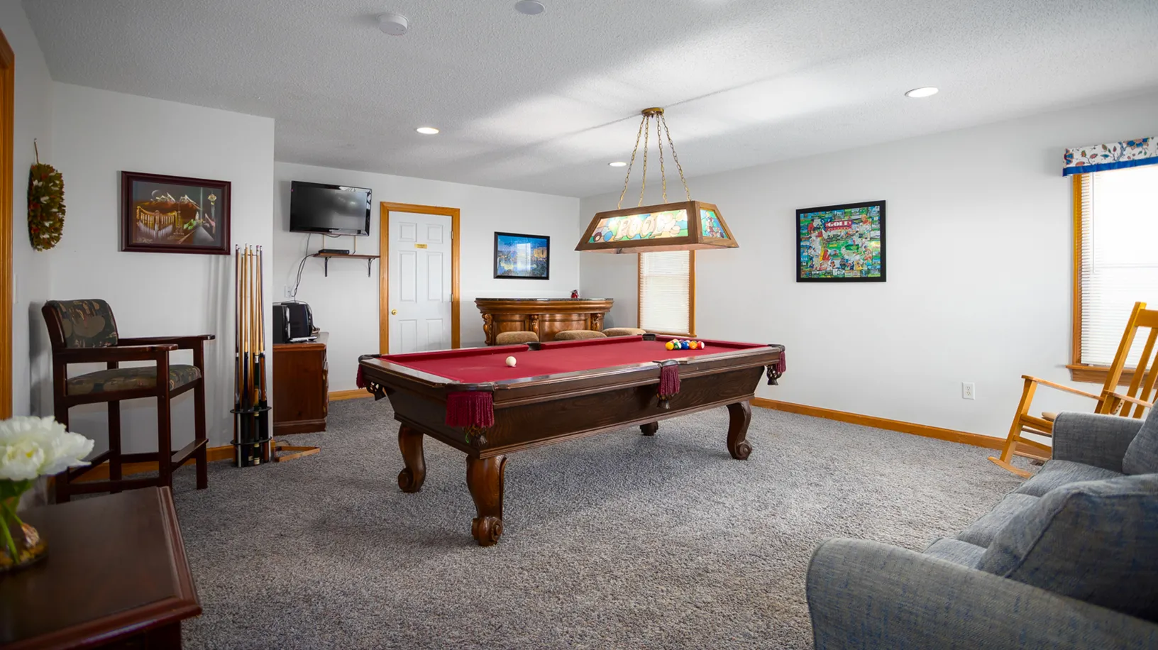 Game room (QSS) with 8' Connelly pool table, executive bar and mini-refrigerator; theater room with seating for nine.