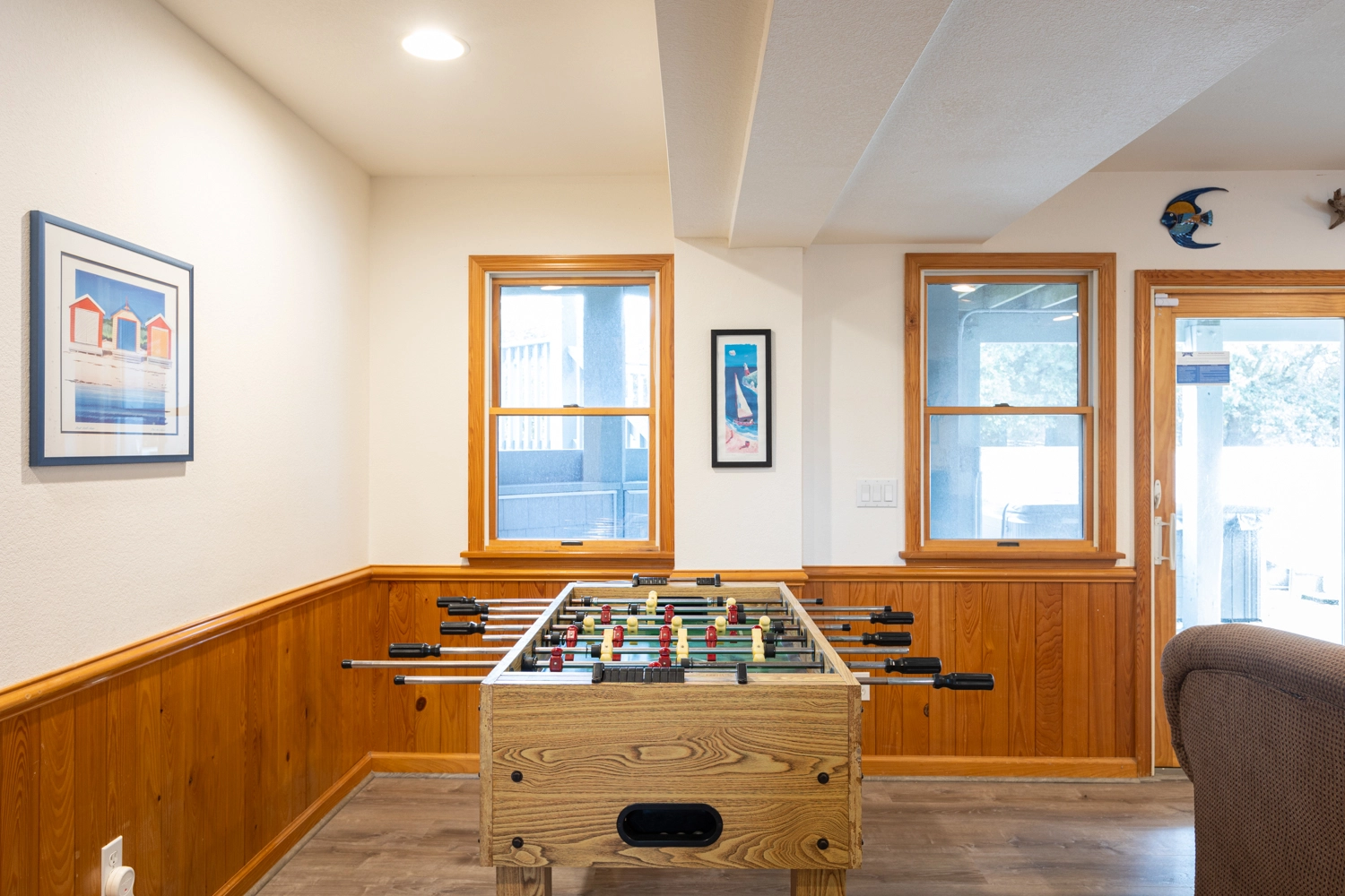 Rec room with foosball and kitchenette with full refrigerator.