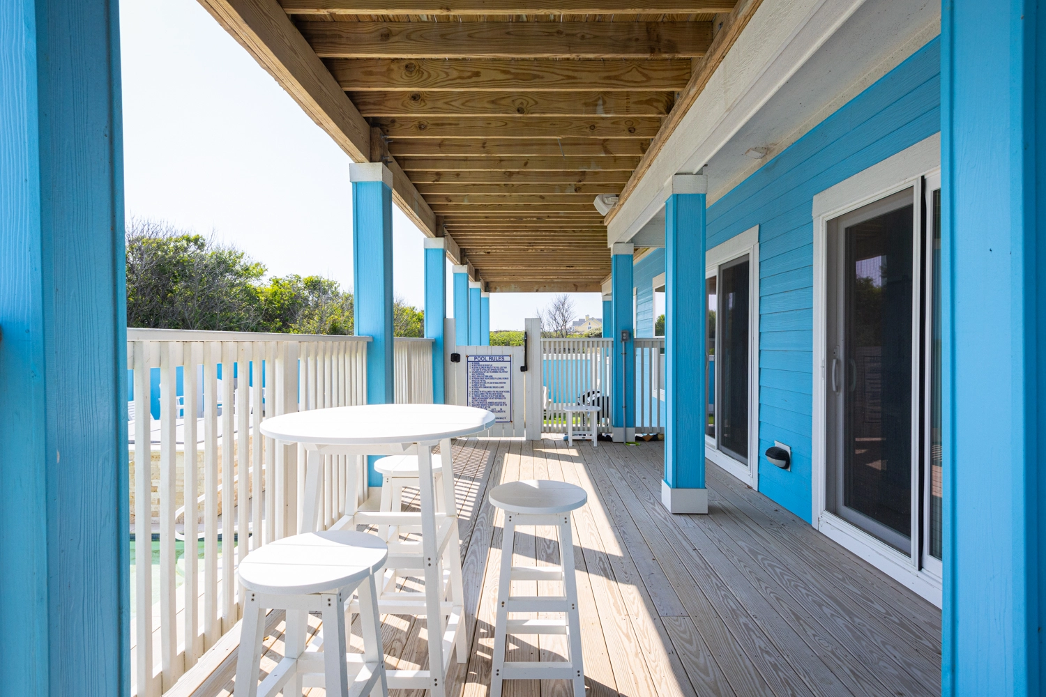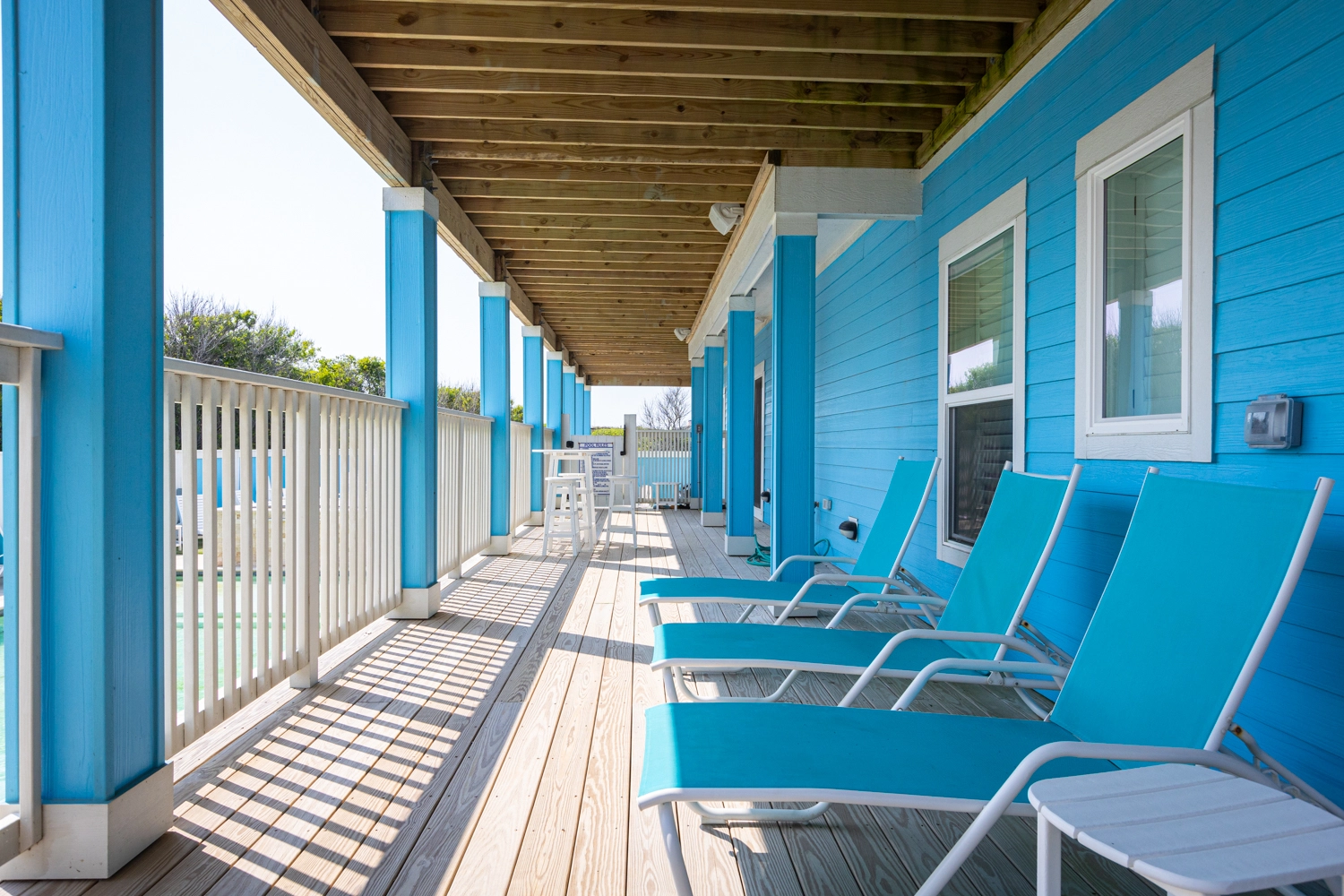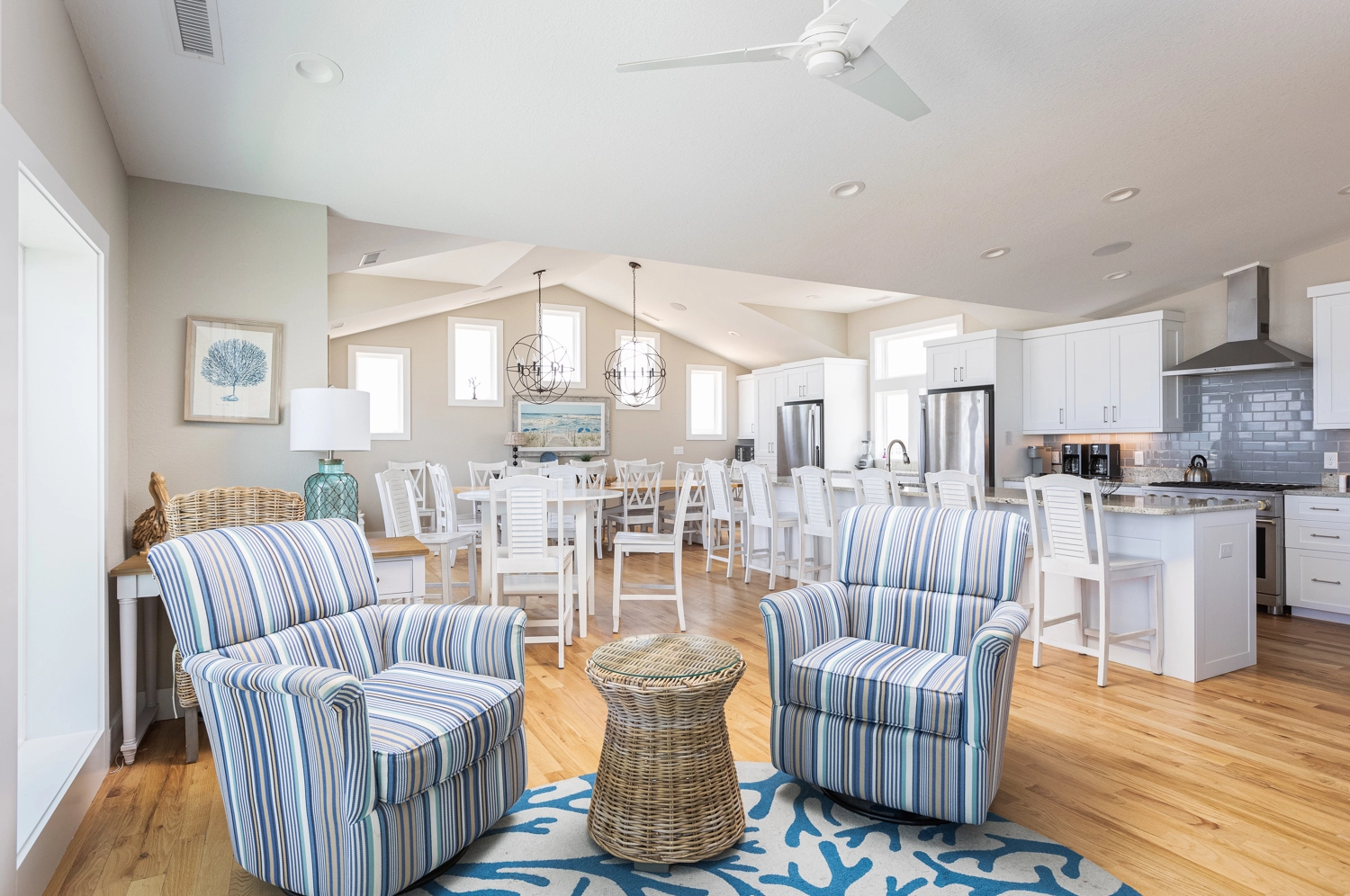"We loved the beachfront location and the close proximity to a grocery store and a few shops. Sunrises were spectacular! The rooms were spacious and very comfortable. The double refrigerators in the kitchen plus two more large refrigerators on other floors was a big bonus, as were the double sets of washers and dryers. The 3rd floor great room with its deck was spacious enough to accomodate our entire group without feeling over crowded. The separate guest quarters with their own small fridge and microwave in their sitting areas were a blessing to those with a need to have a quieter space while just being across a covered porch from the main house were awesome."