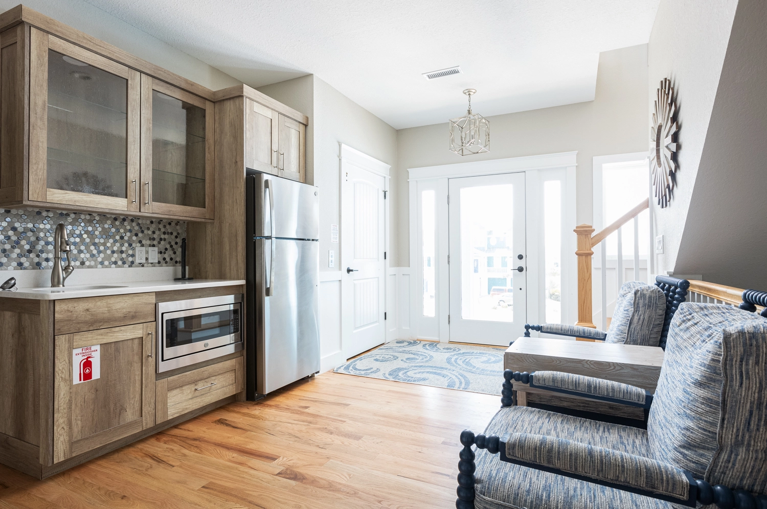 Great room with gas fireplace; kitchen with two refrigerators, two dishwashers, and gas stove; dining area.
