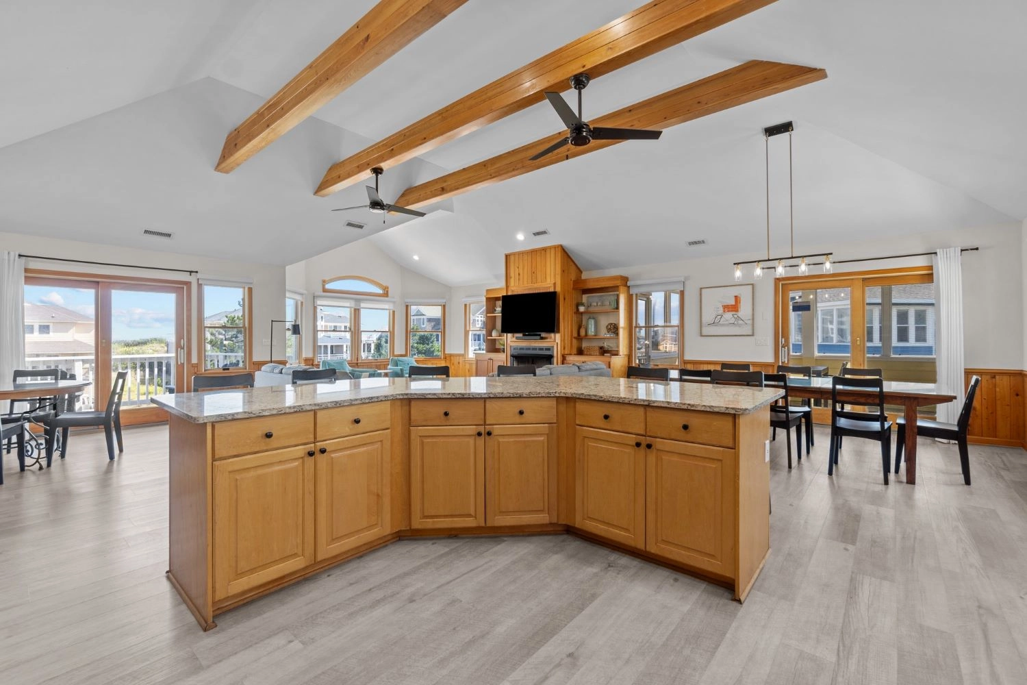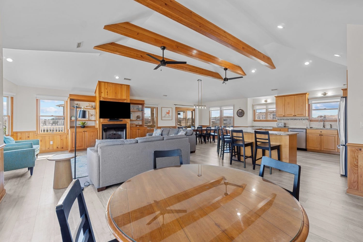 Great room with surround sound entertainment center; kitchen with breakfast bar; dining area; screened porch; deck.