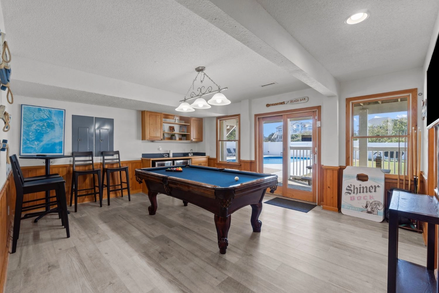 Game room with pool table and wet bar with refrigerator; patio with private pool and kiddie pool.
