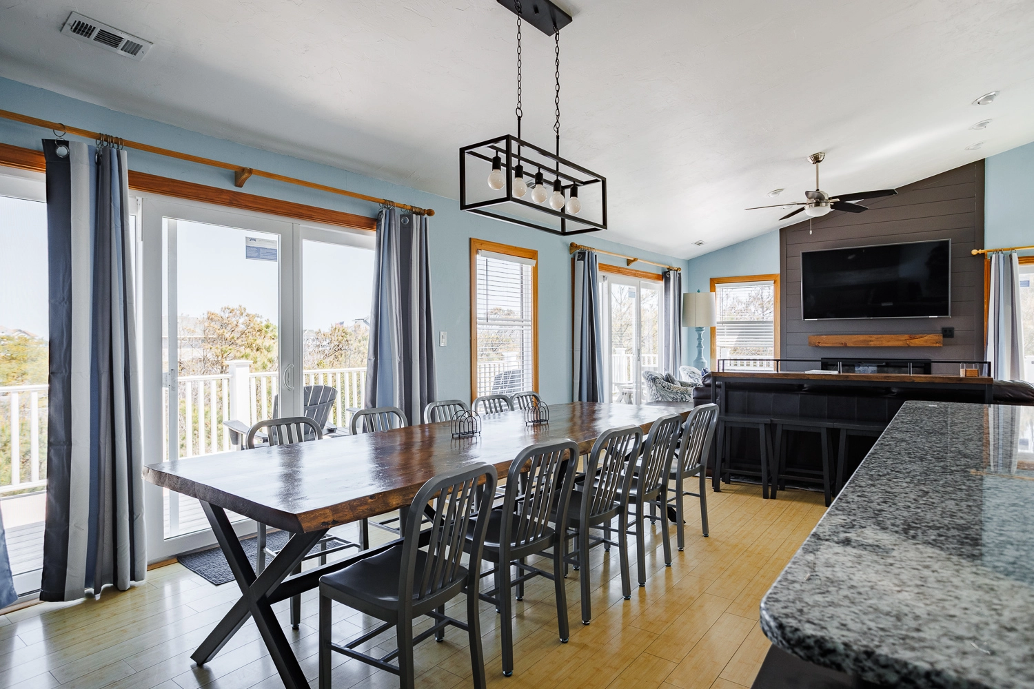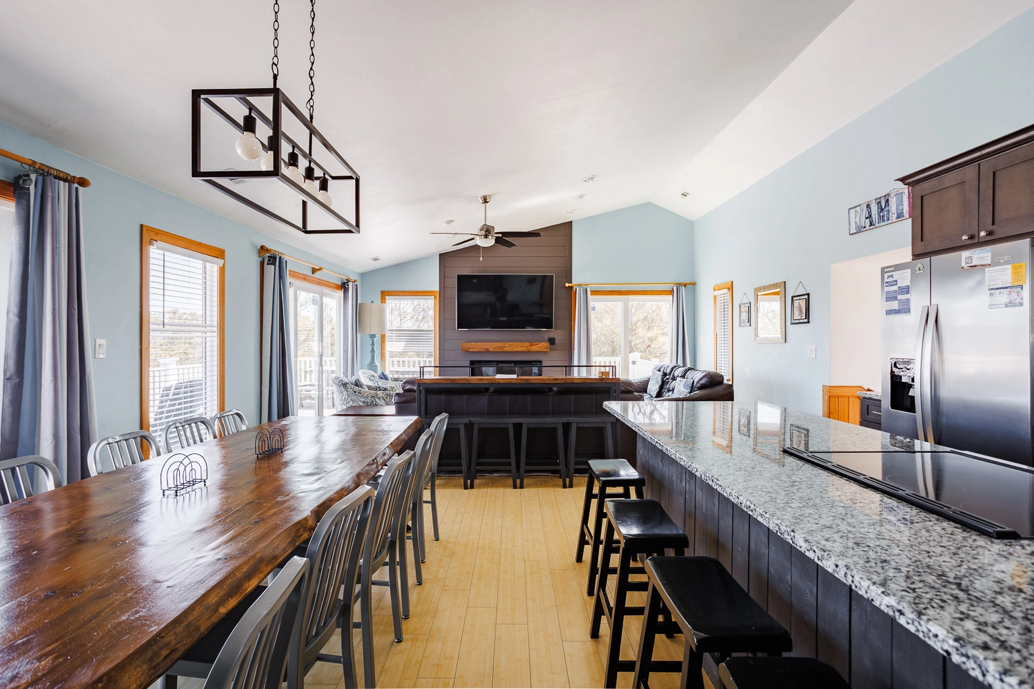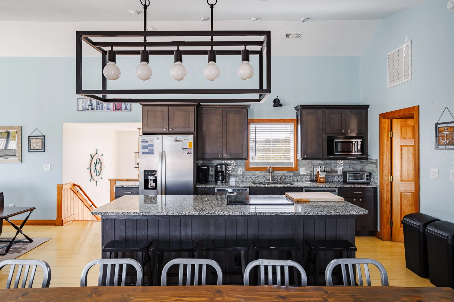 "Lovely updated kitchen well equipped. Beautiful new bathrooms exceptionally clean and nice decor. Lots of great space to socialize with our family at 15 love the deck and the great room. We had a wonderful happy week at this home!"