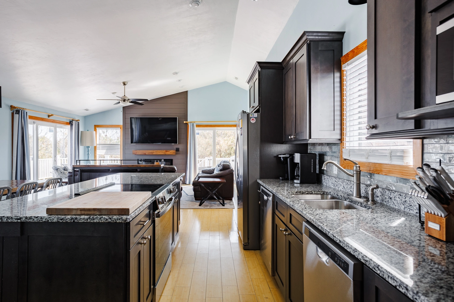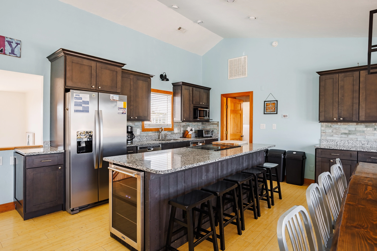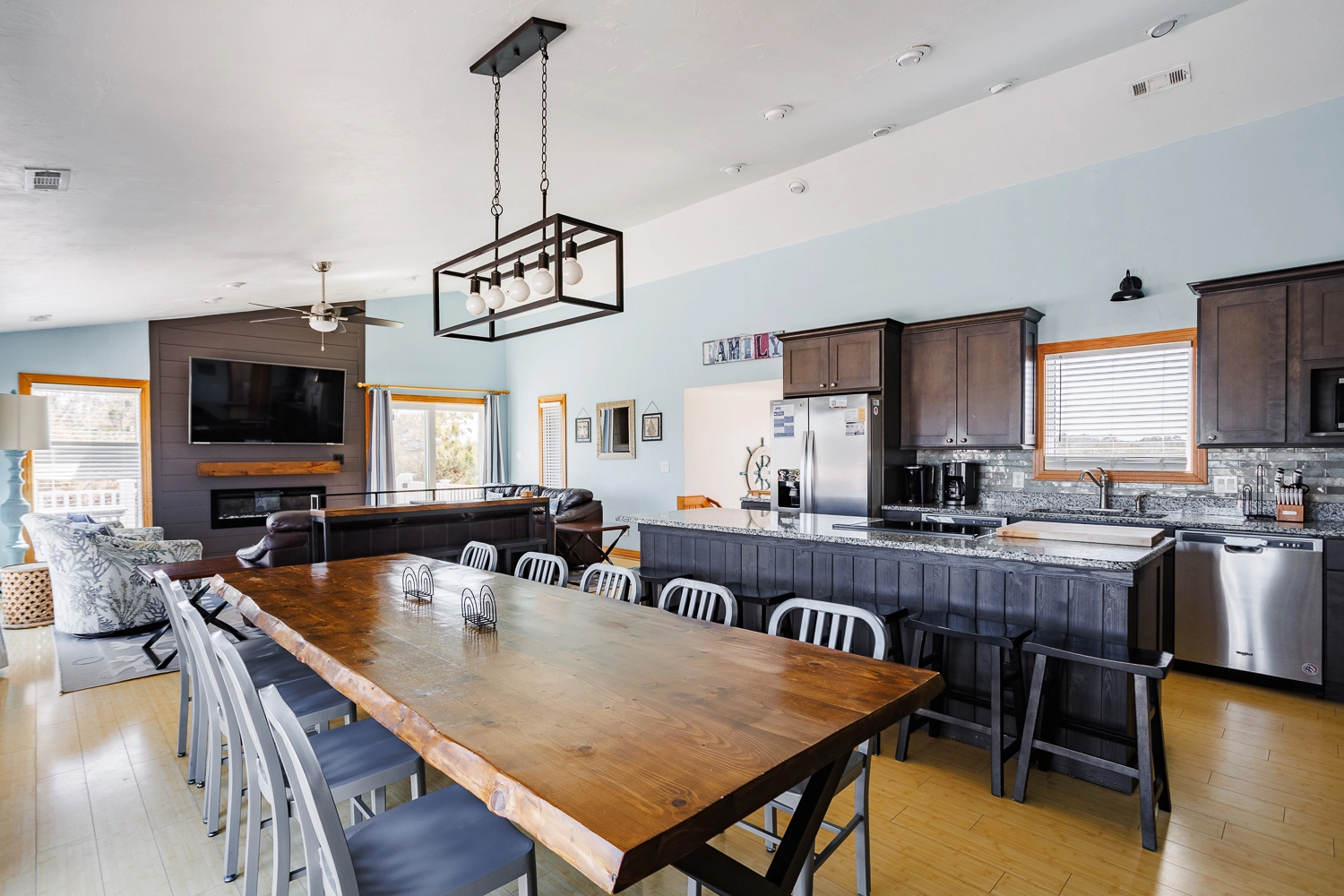 Great room; kitchen with two dishwashers and beverage cooler; dining area.