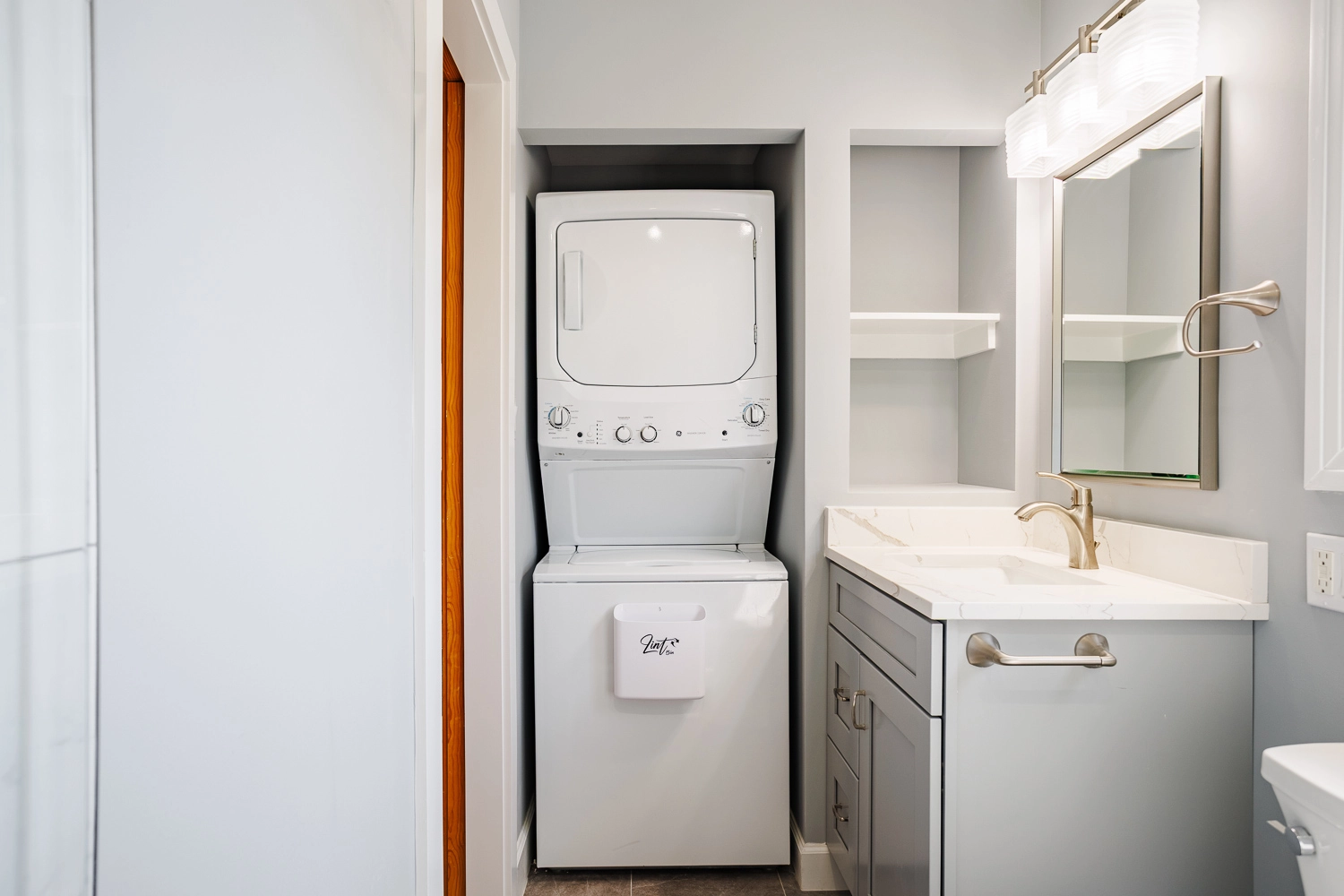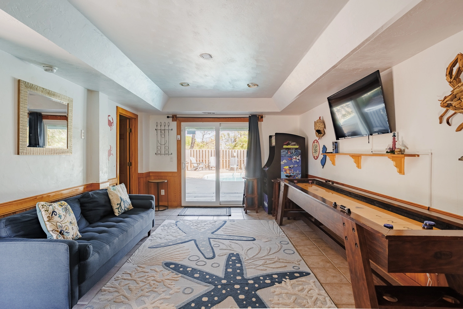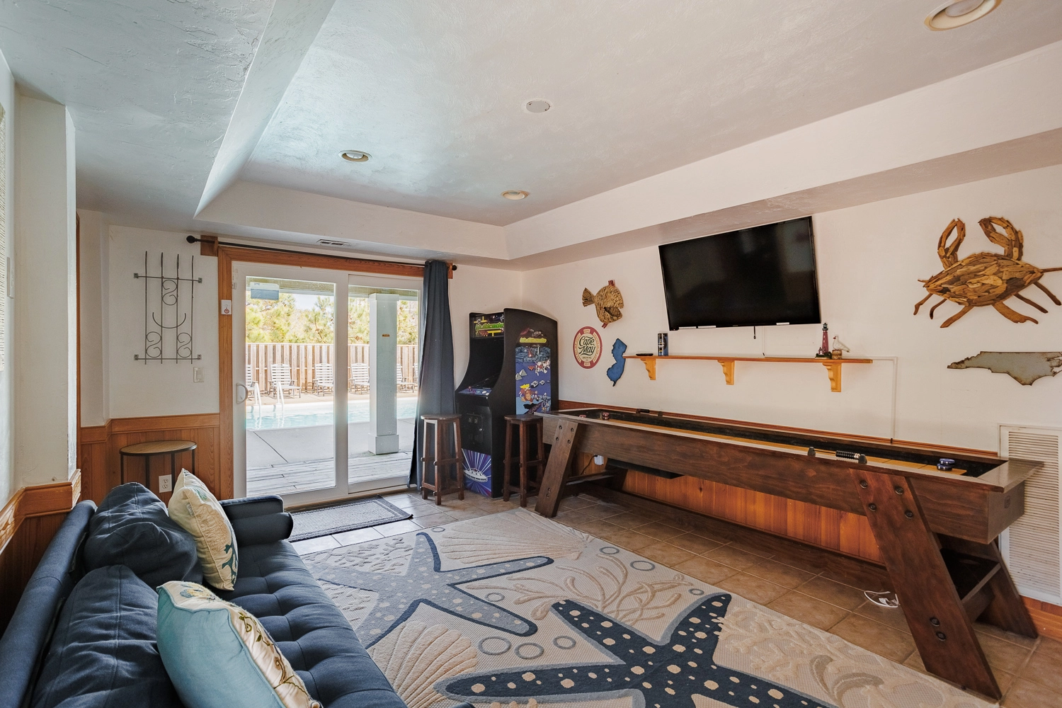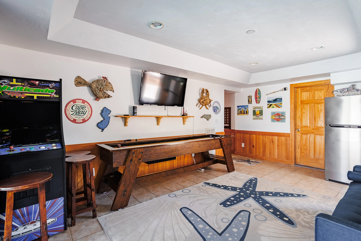 Rec room with shuffleboard, arcade, and wet bar with refrigerator; laundry.