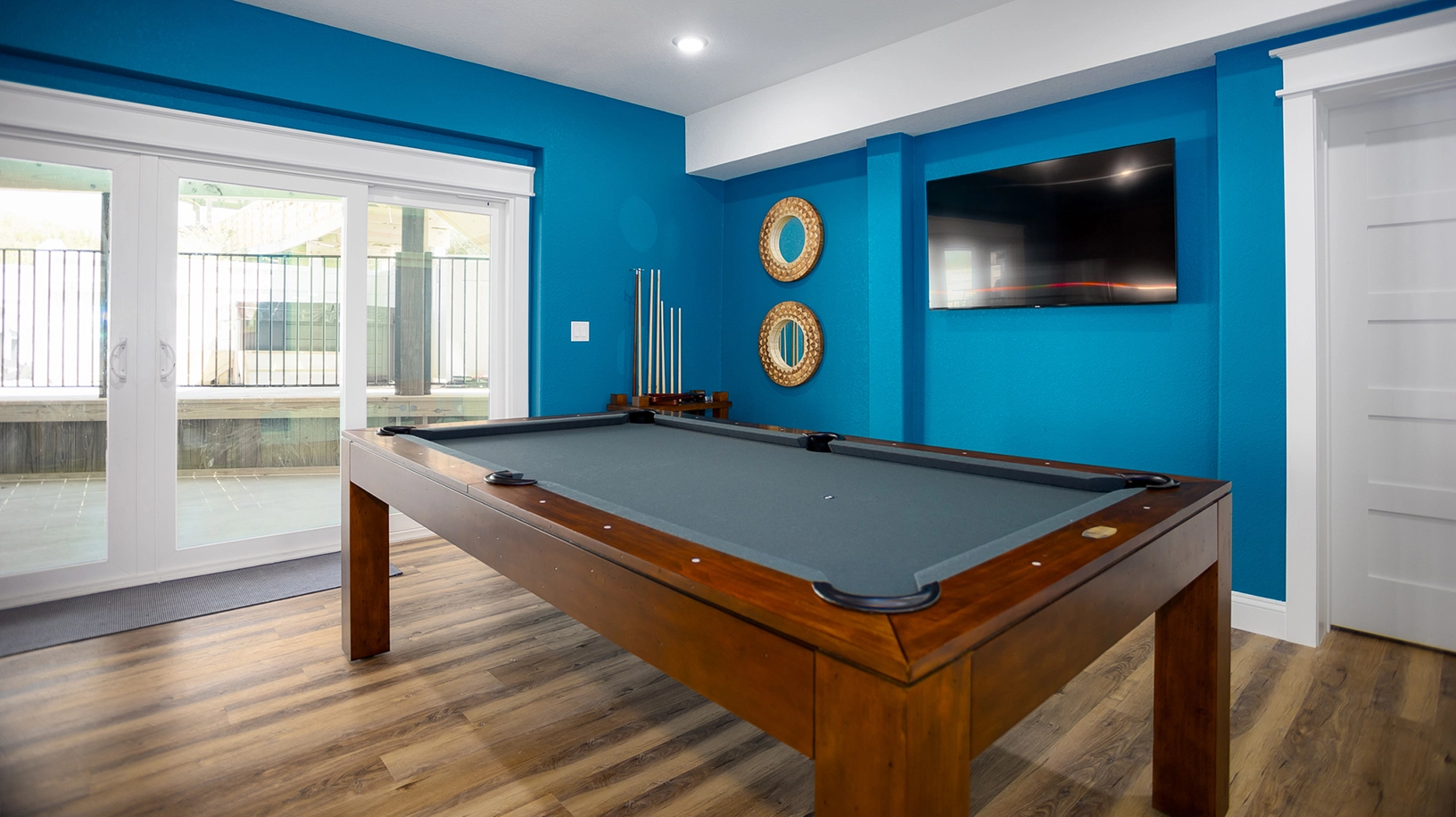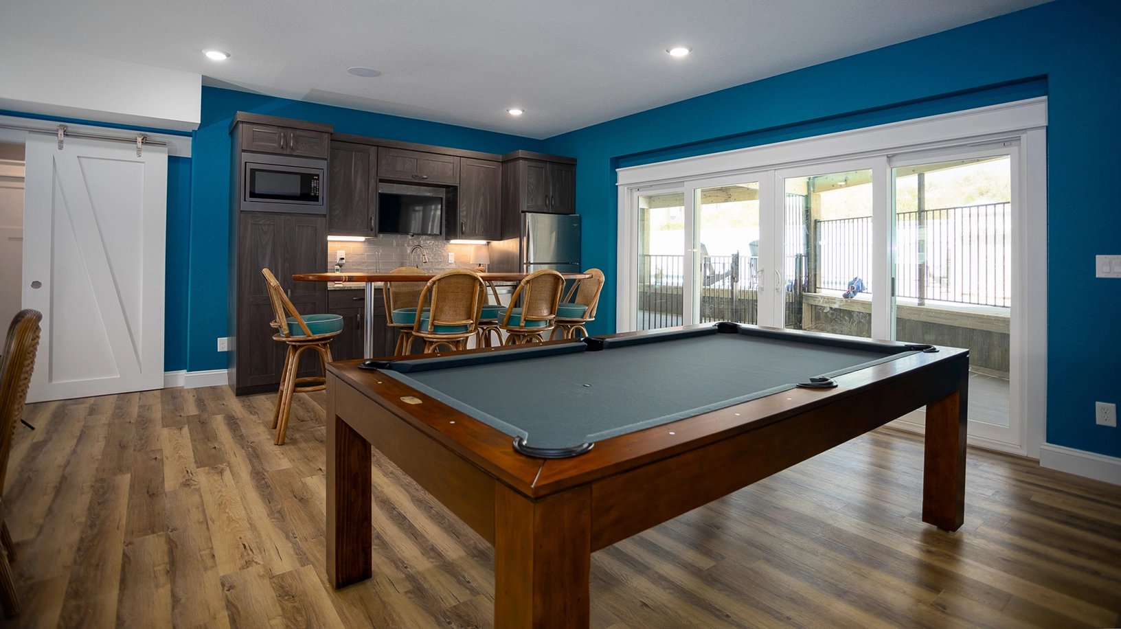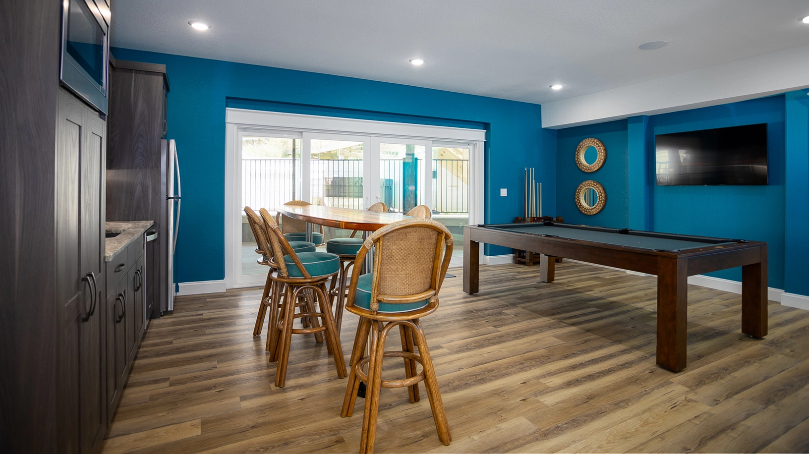 Theater room; rec room with pool table, sit down two player multi arcade game, game table, and kitchenette with bar; poolside cabana.