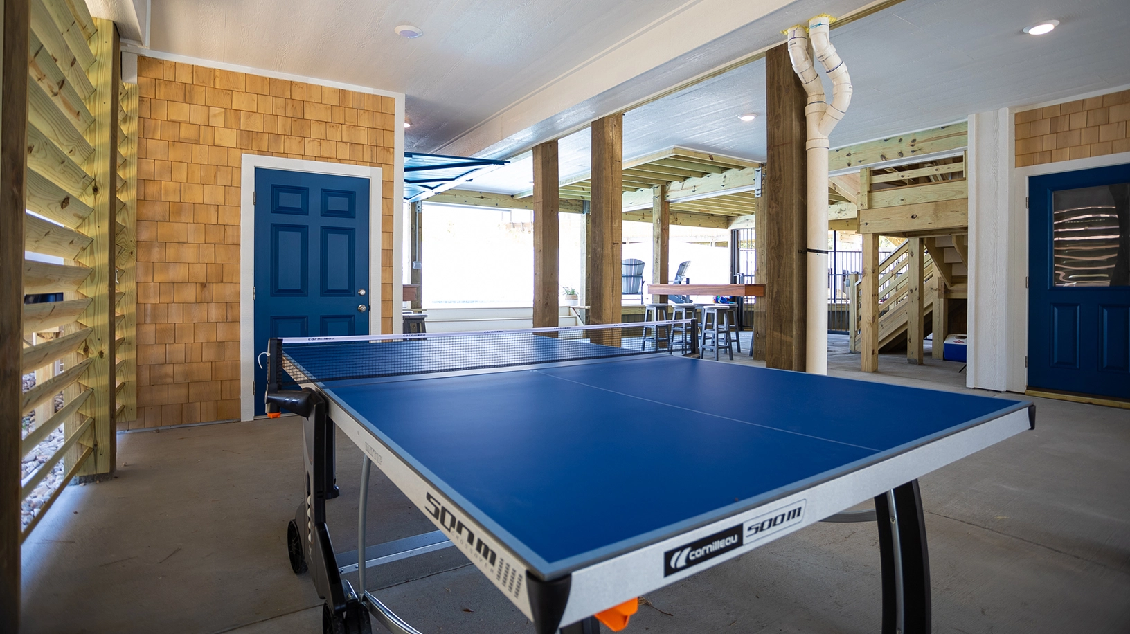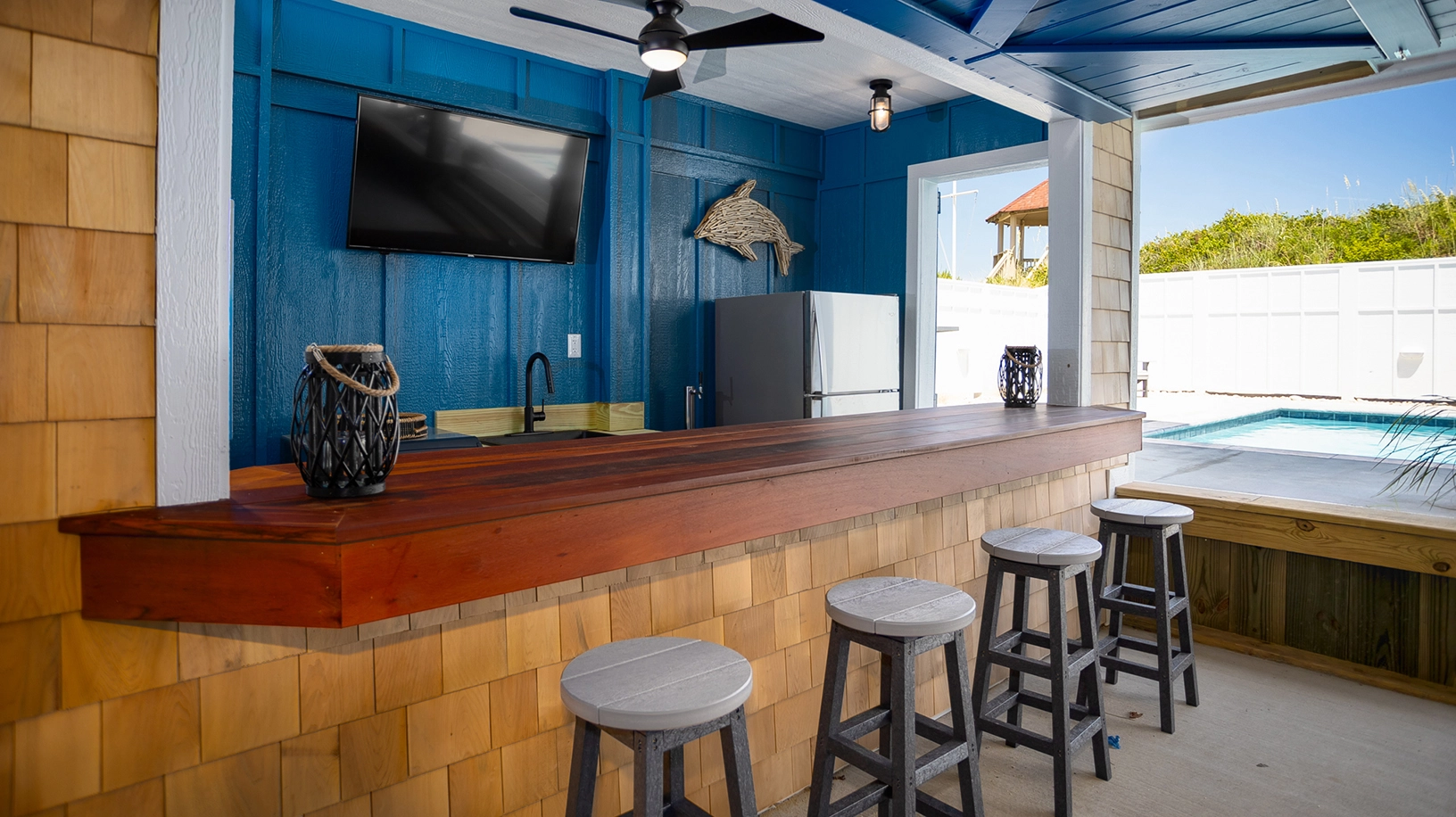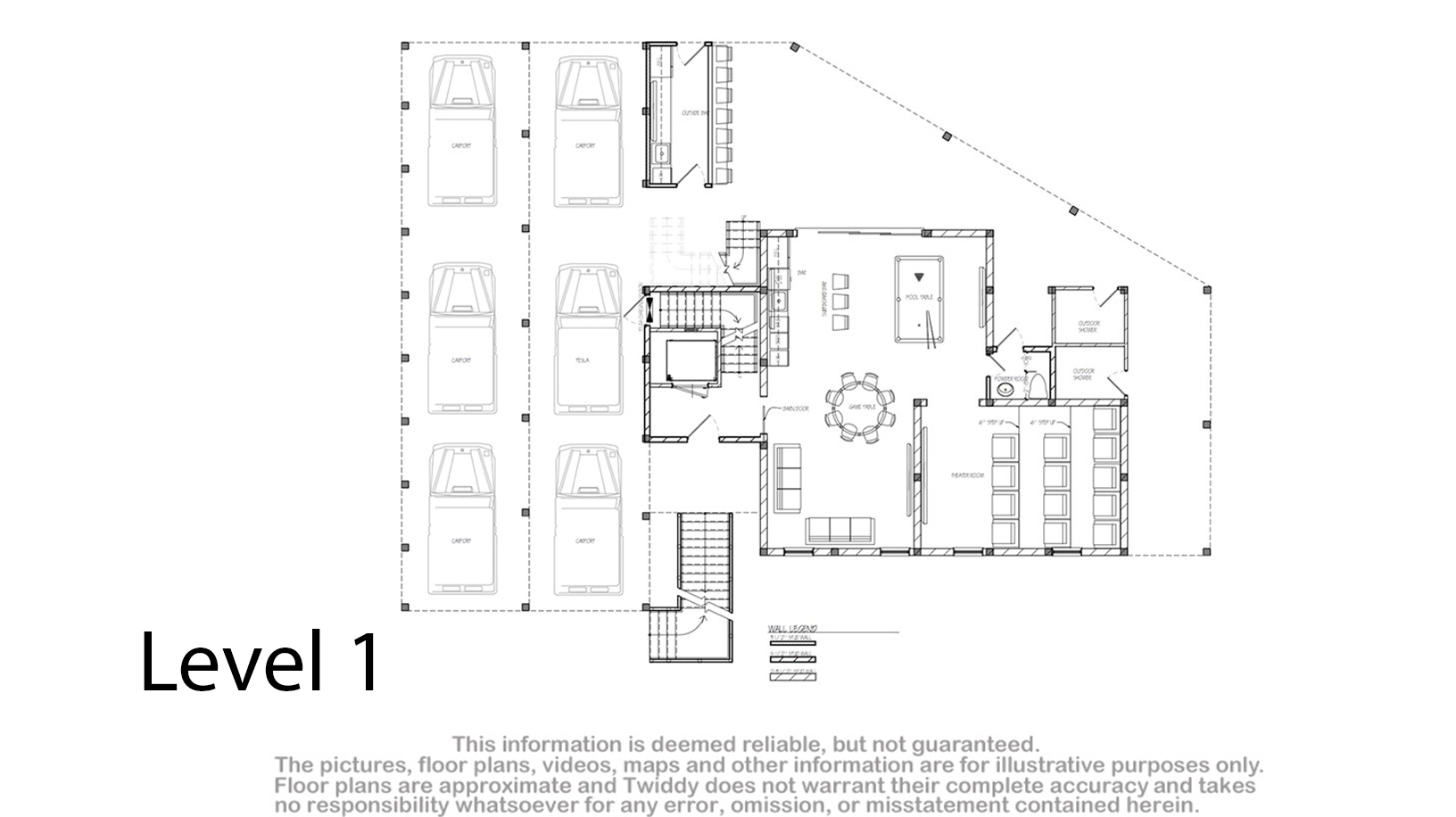 Theater room; rec room with pool table, sit down two player multi arcade game, game table, and kitchenette with bar; poolside cabana.
