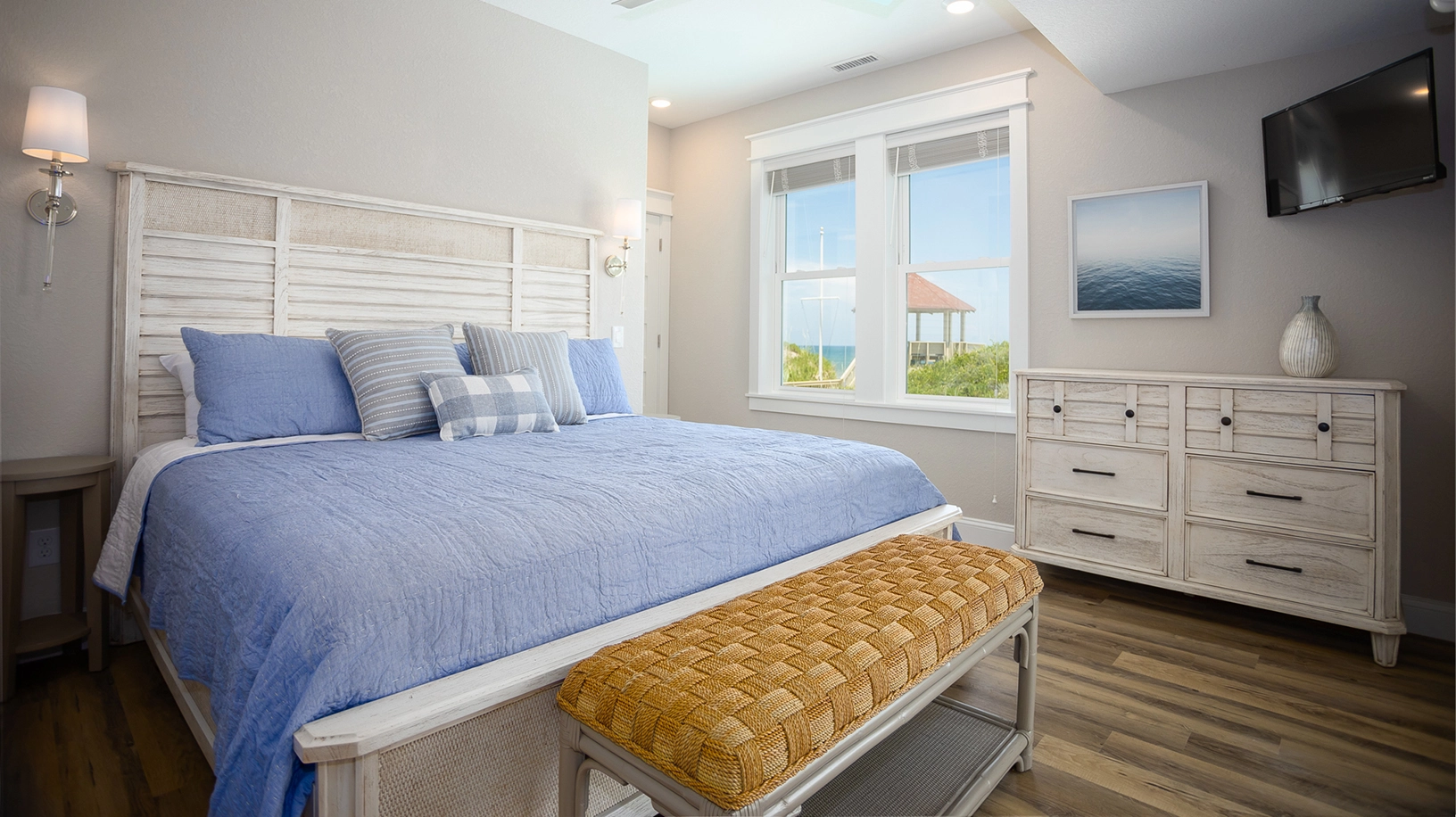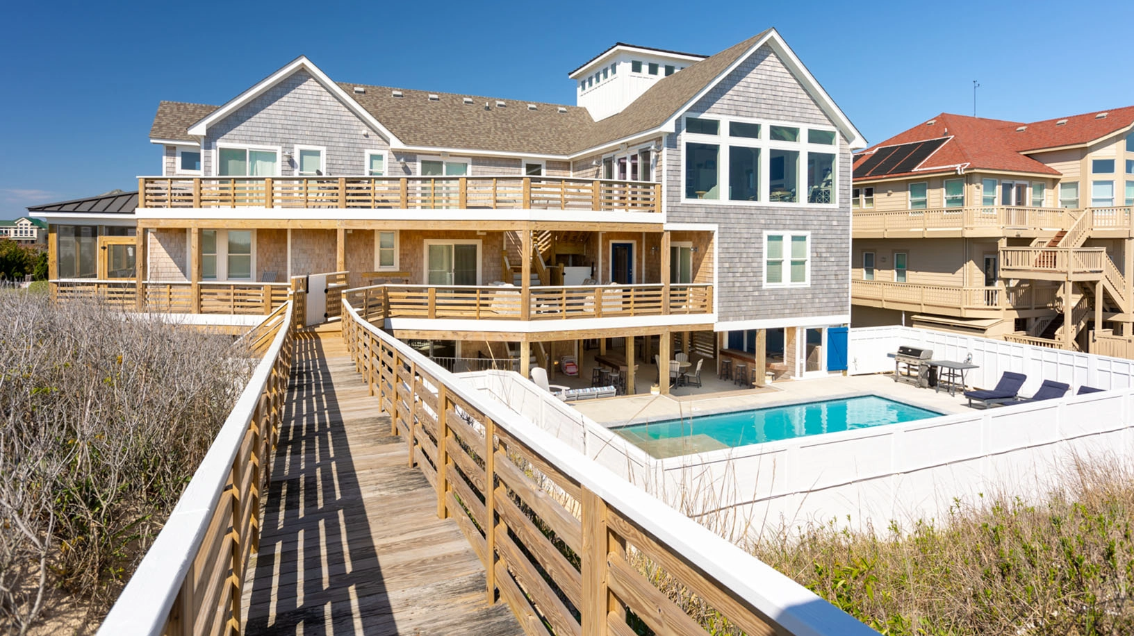 "1. Most rooms are masters 2. Beach access from 2nd floor 3. Pool 4. View 5. Convenient to grocery store 6. Theater room"