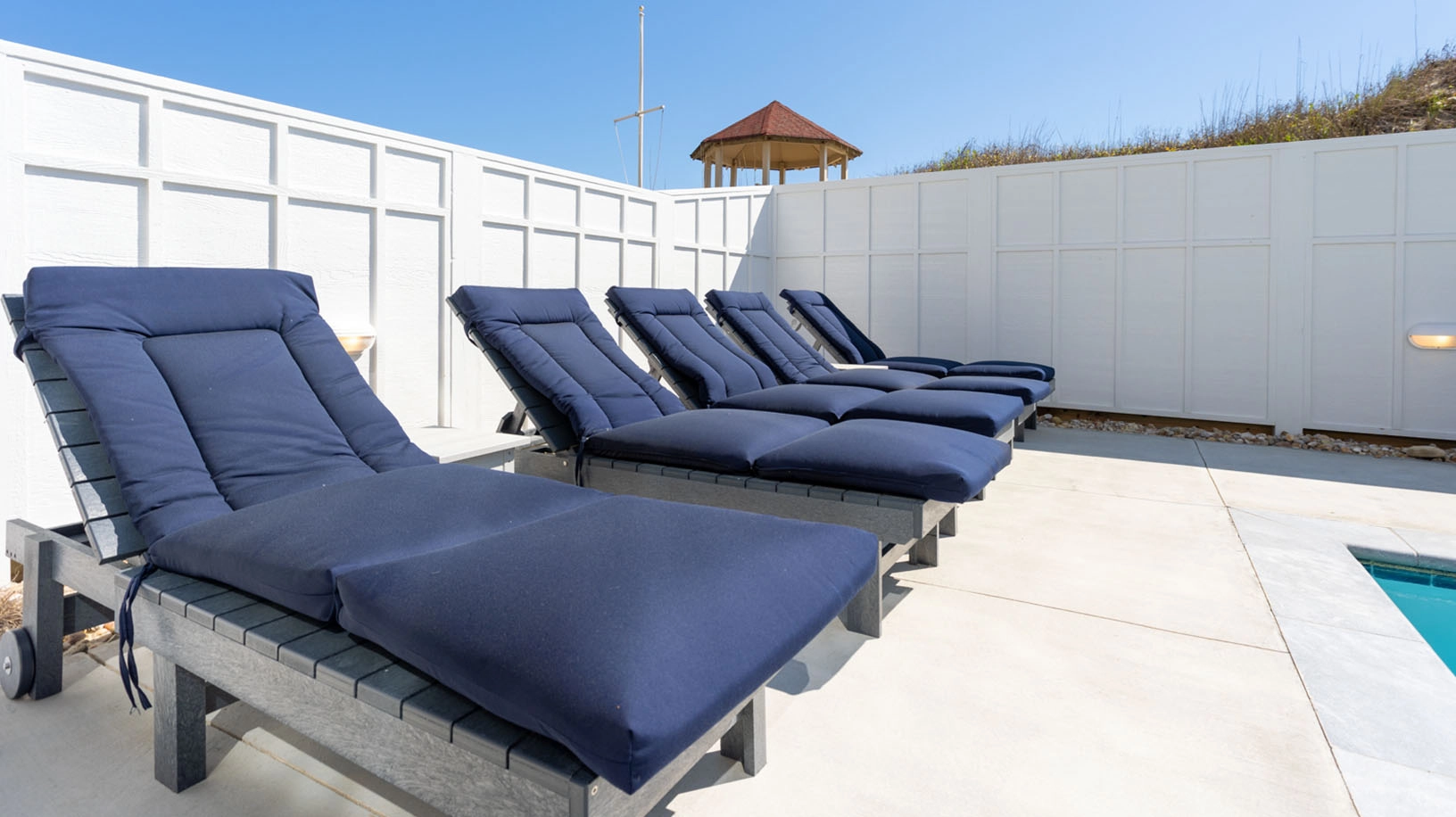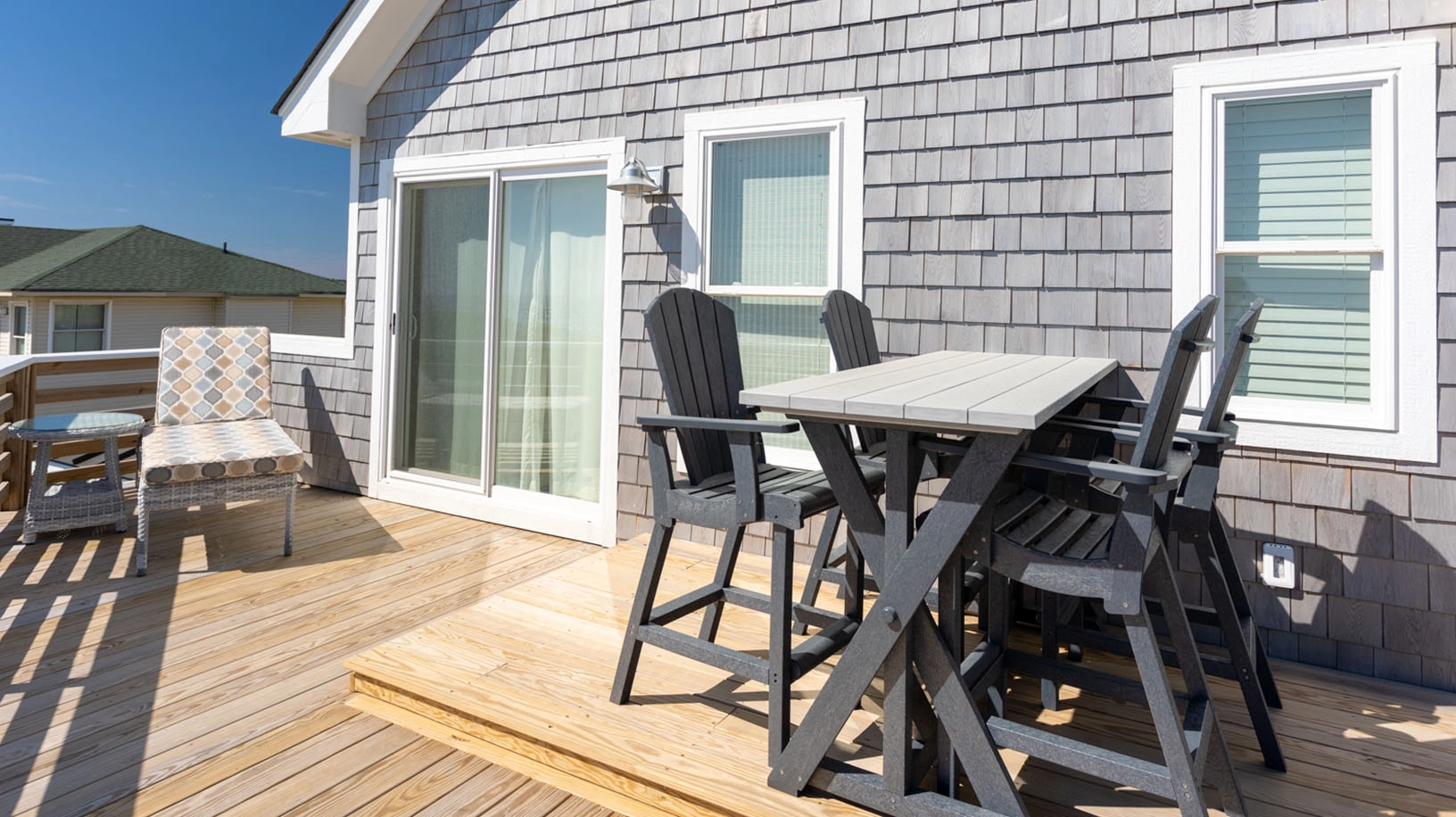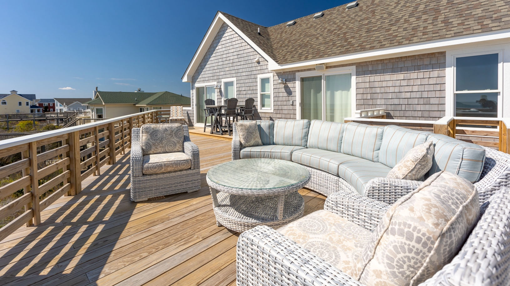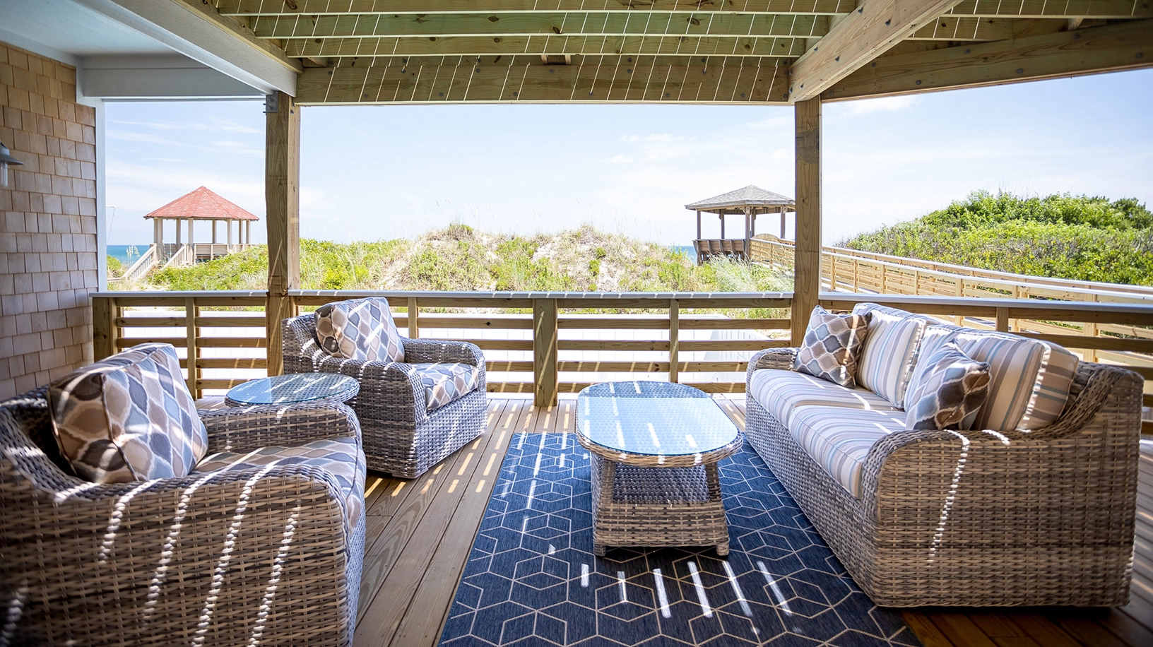 "The Five Suns is another beautiful home in the Twiddy portfolio. We loved that all the bedrooms had en suite bathrooms. We also loved the second floor walkout to the gazebo as it allowed the older members of our party to enjoy their morning coffee by the beach without having to climb stairs. The outdoor seating options were amongst the best we've seen in Twiddy homes. We also appreciated that such seating was available on three levels of the deck."