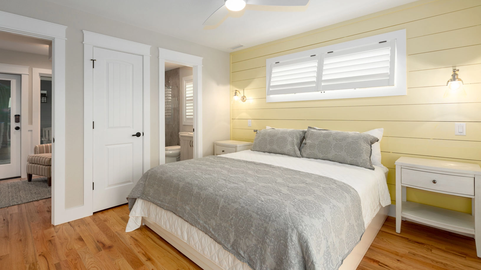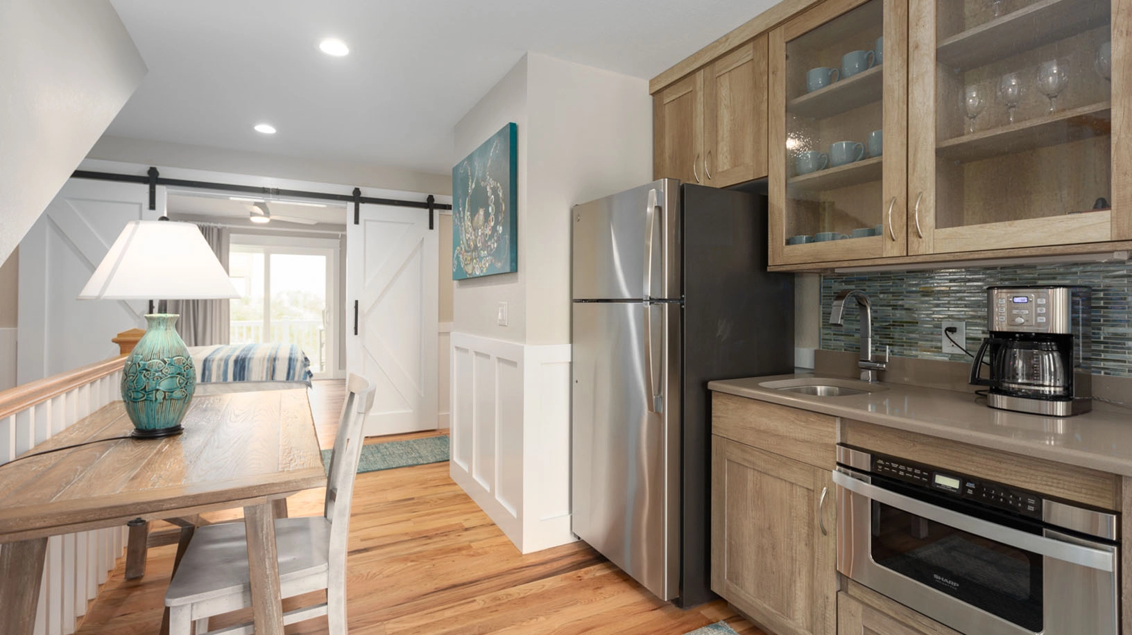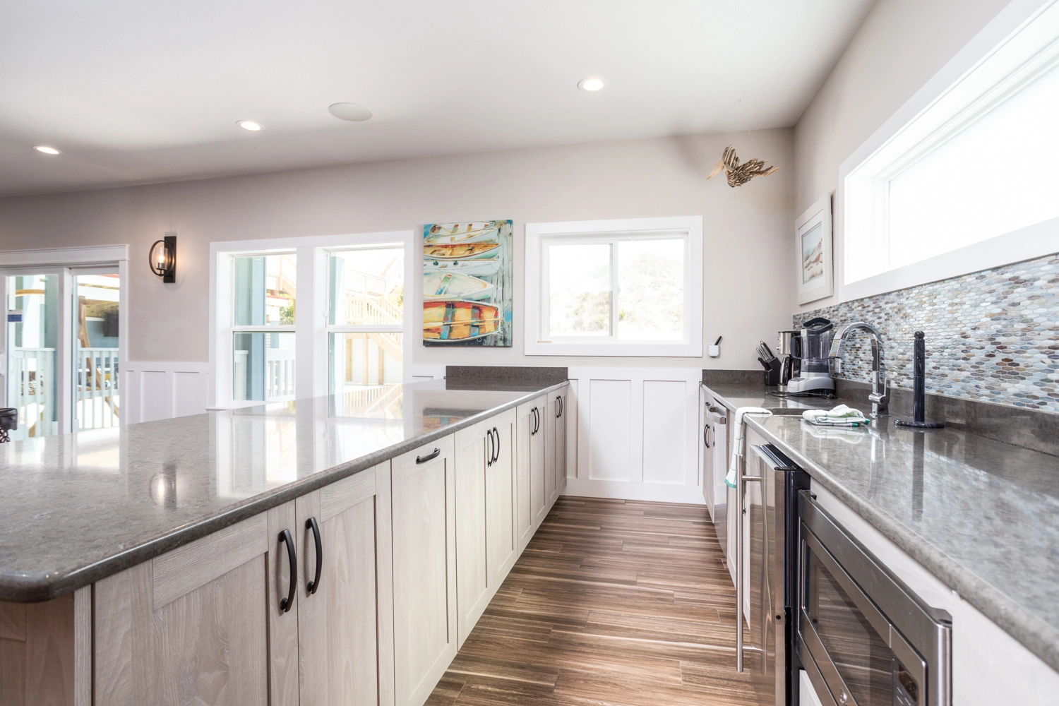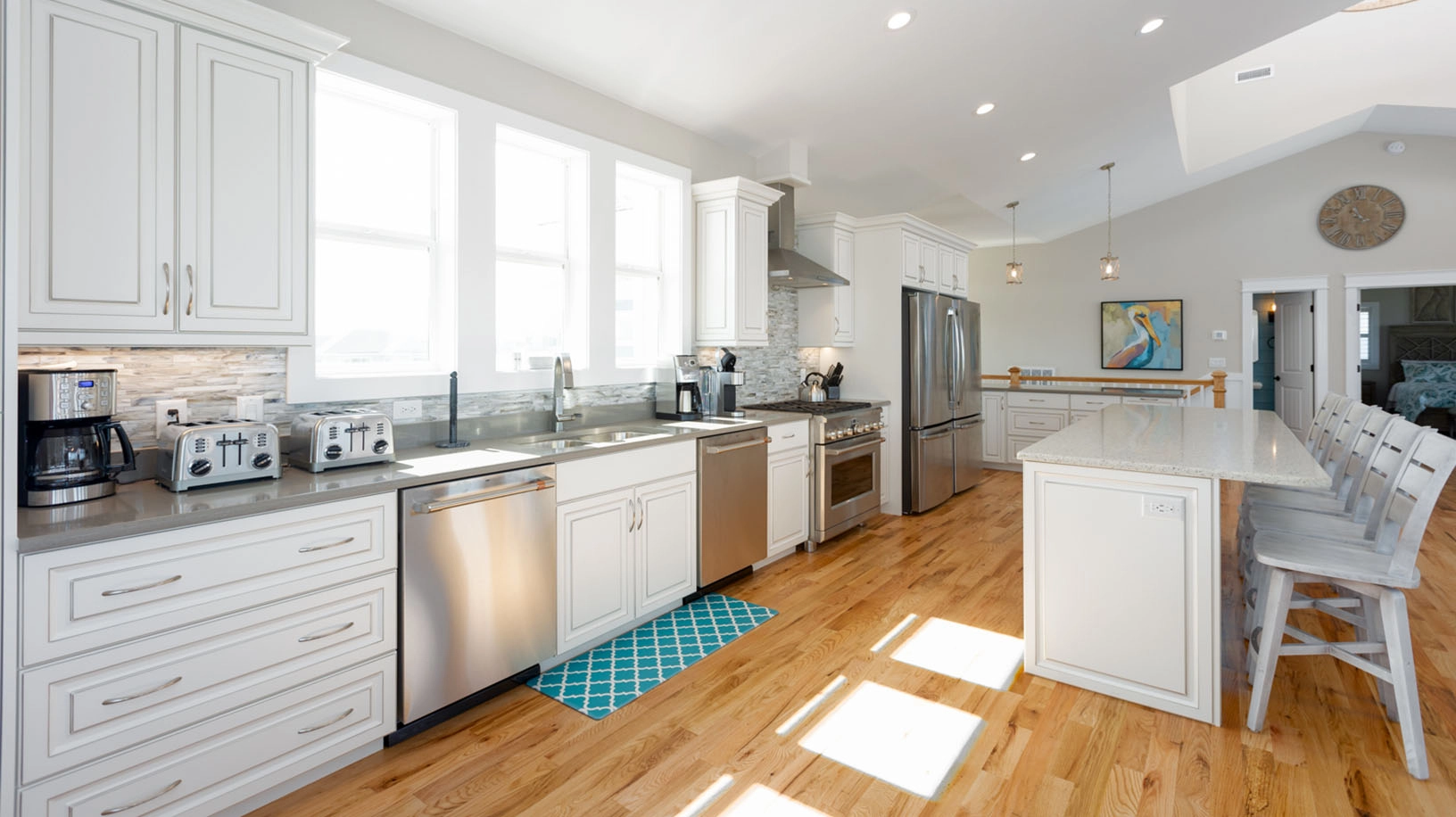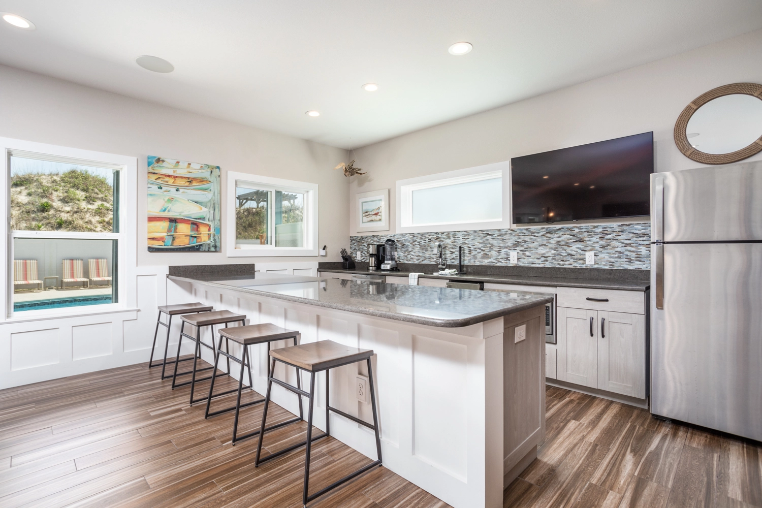 "Nice home, new construction. Kitchen is large and included many utensils/small appliances. Large ice maker downstairs. Guest house offers privacy from main house. Middle floor rooms have direct access to boardwalk to the beach. The only complaint is that there is not public access to that boardwalk from the 2nd floor; you have to walk through a bedroom."
