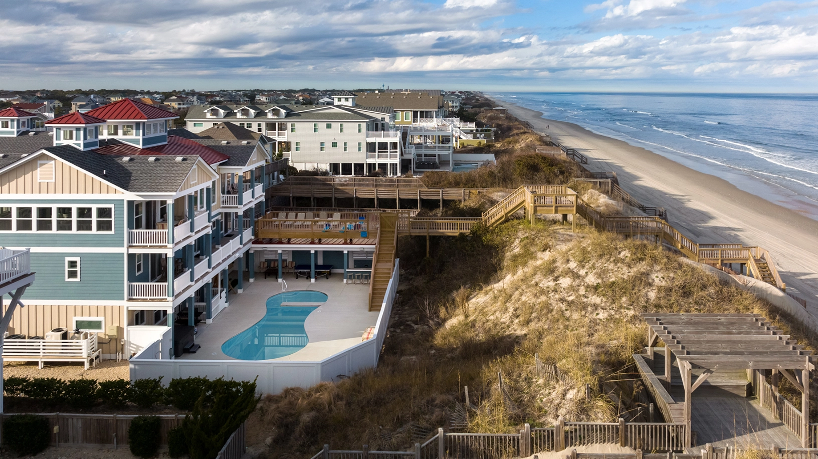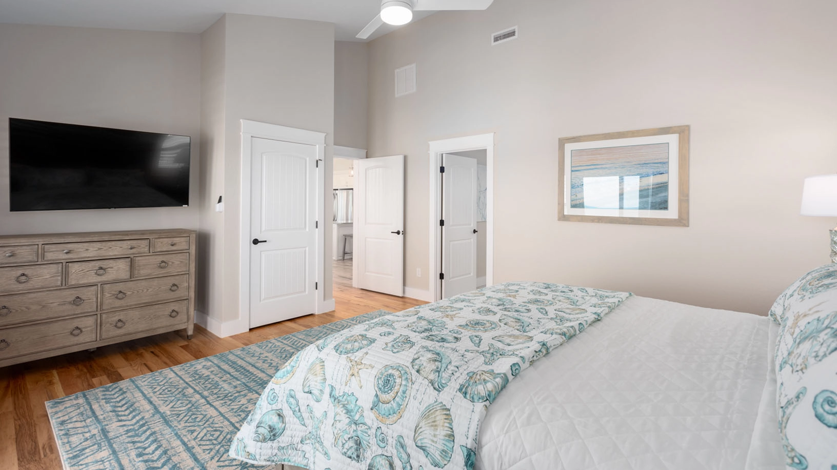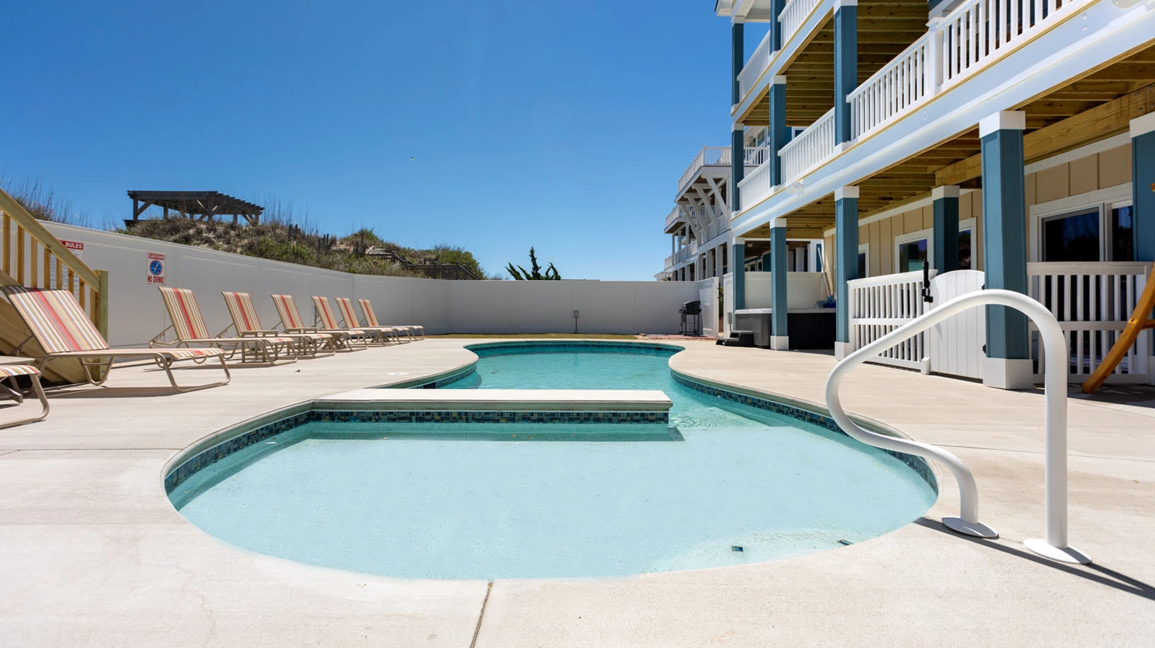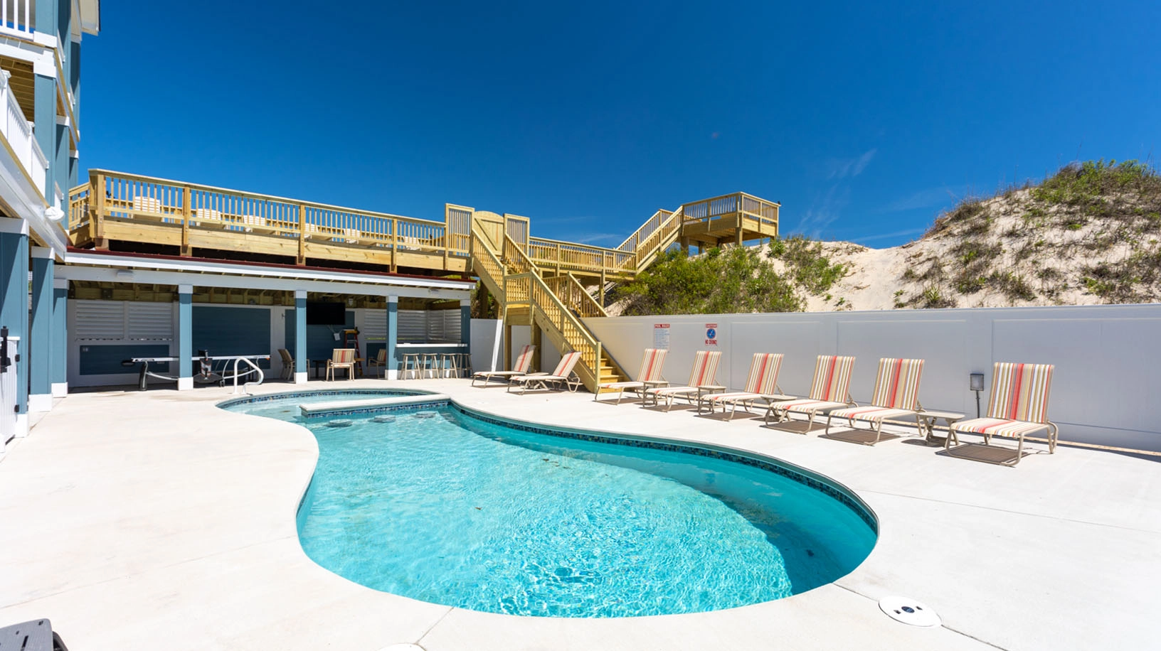 "We loved that each bedroom had its own bathroom. The kitchen was well stocked with pots and pans, silverware and plates and bowls. We also loved the private boardwalk to the beach with the beach deck. We used the volleyball court and basketball standard. We also enjoyed the large great room and kitchen for gathering for dinner and games. The pool was a hit with the grandkids."