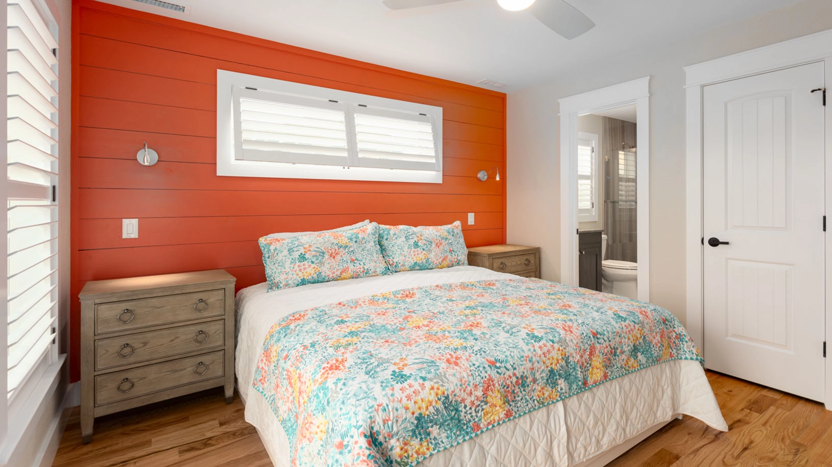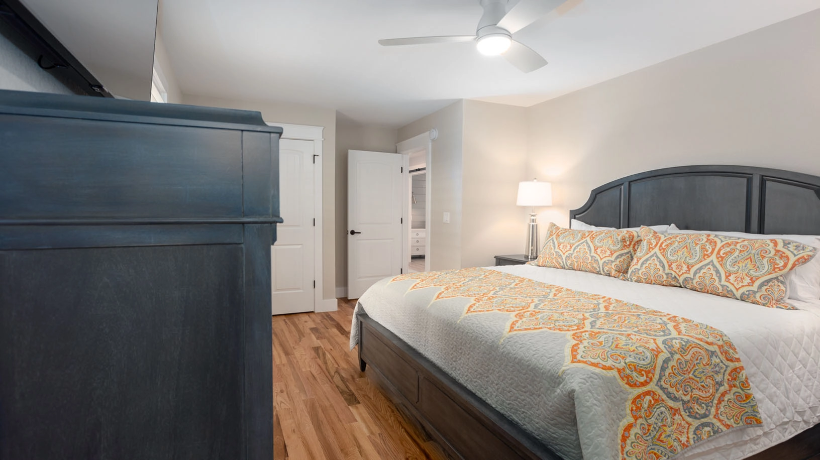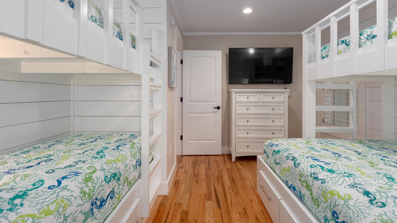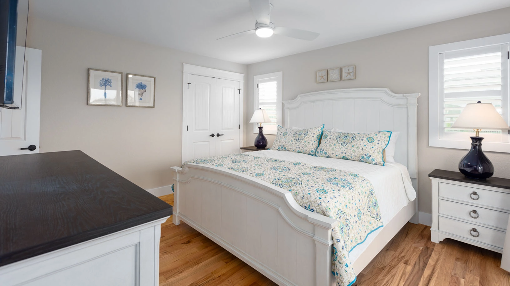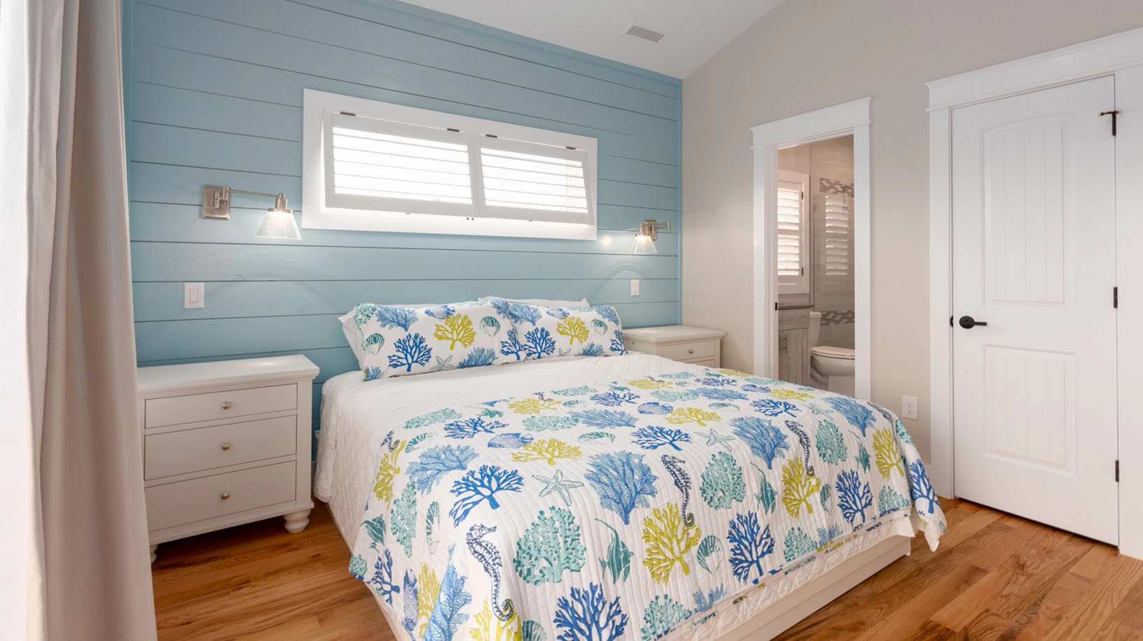 "We loved that each bedroom had its own bathroom. The kitchen was well stocked with pots and pans, silverware and plates and bowls. We also loved the private boardwalk to the beach with the beach deck. We used the volleyball court and basketball standard. We also enjoyed the large great room and kitchen for gathering for dinner and games. The pool was a hit with the grandkids."