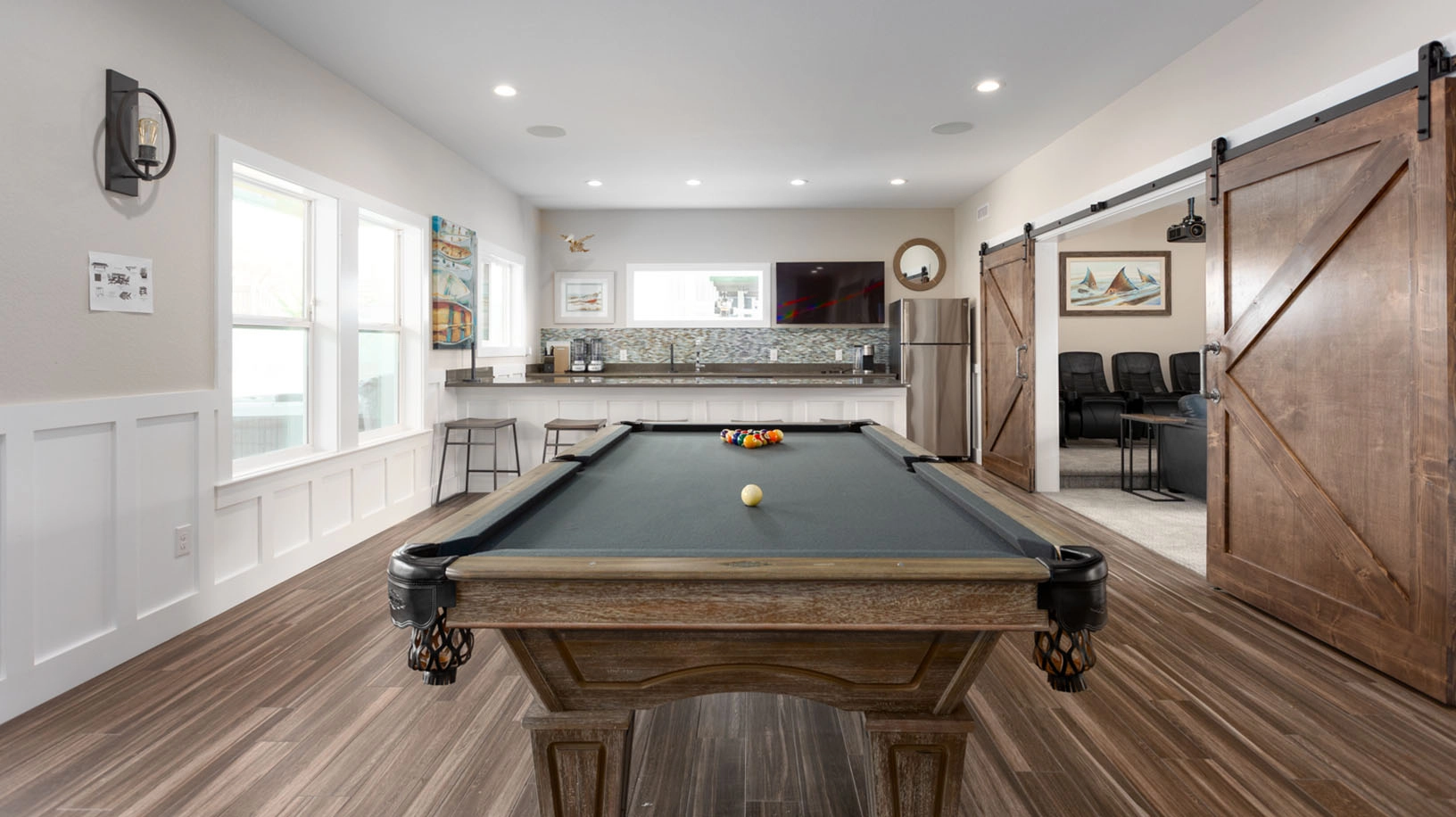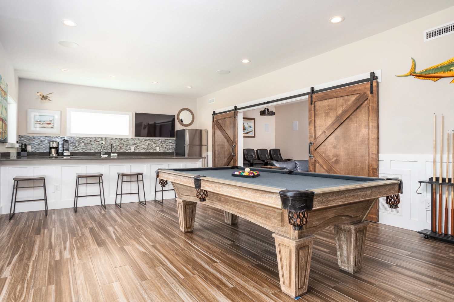 Theater room; rec room with pool table, arcade, and kitchenette with refrigerator and bar; laundry.
