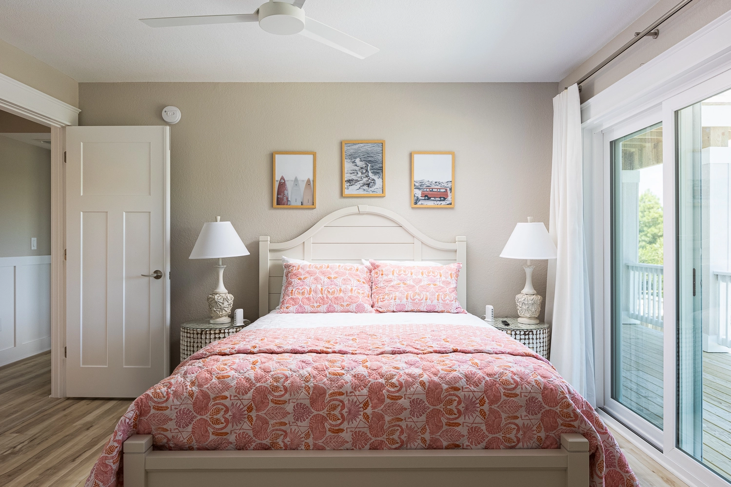 Queen, Shared bath with Room 2, Standing shower, Deck access