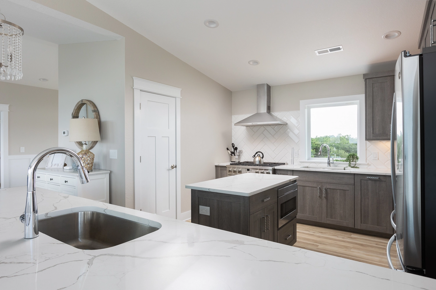 Great room with gas fireplace; kitchen with six-burner gas stove, two refrigerators, and two dishwashers; dining room.