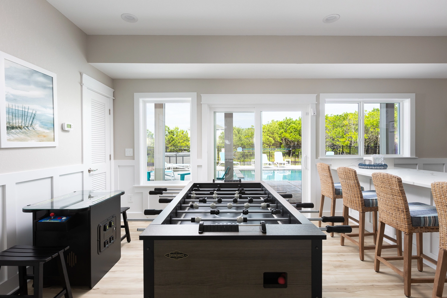 Media room; rec room with arcade, game table, foosball, and bar with refrigerator; laundry.
