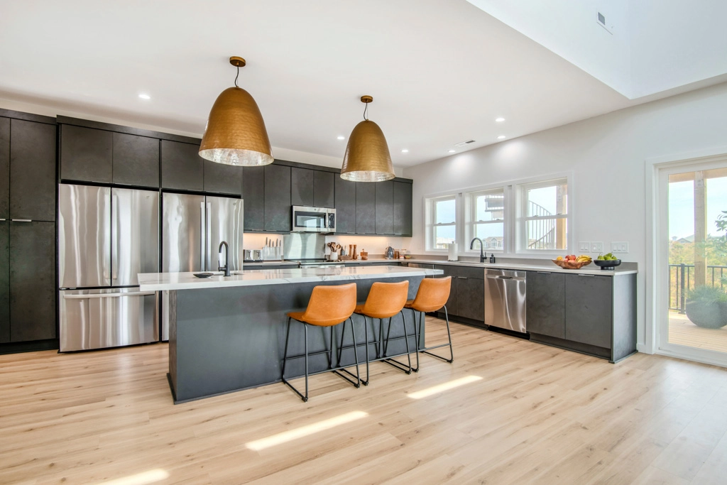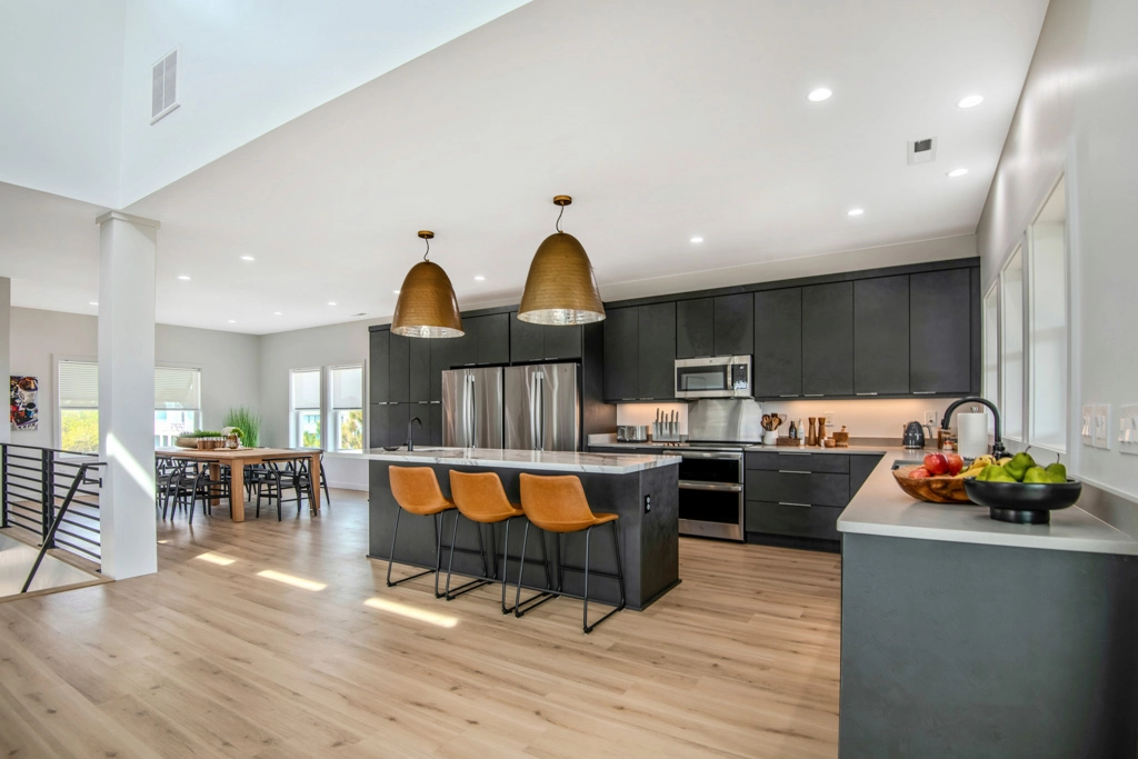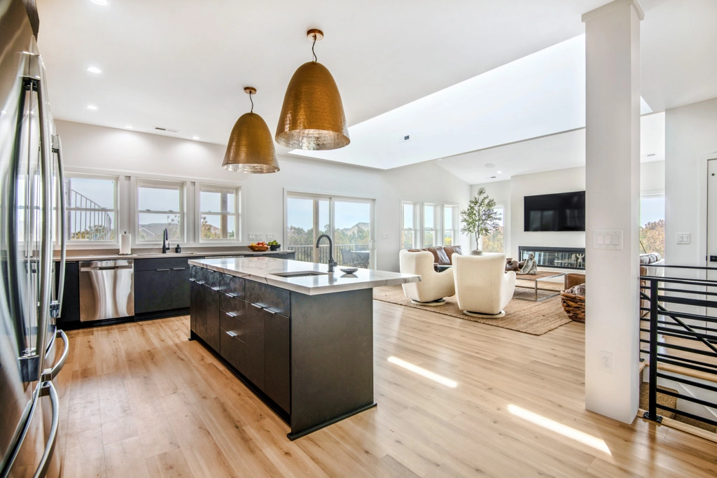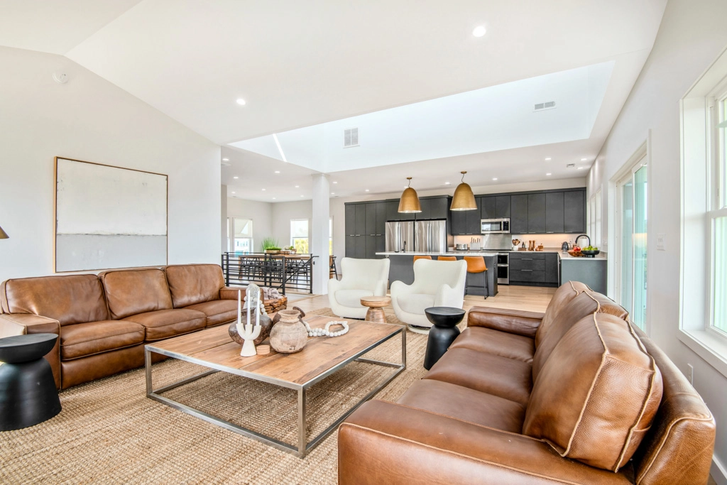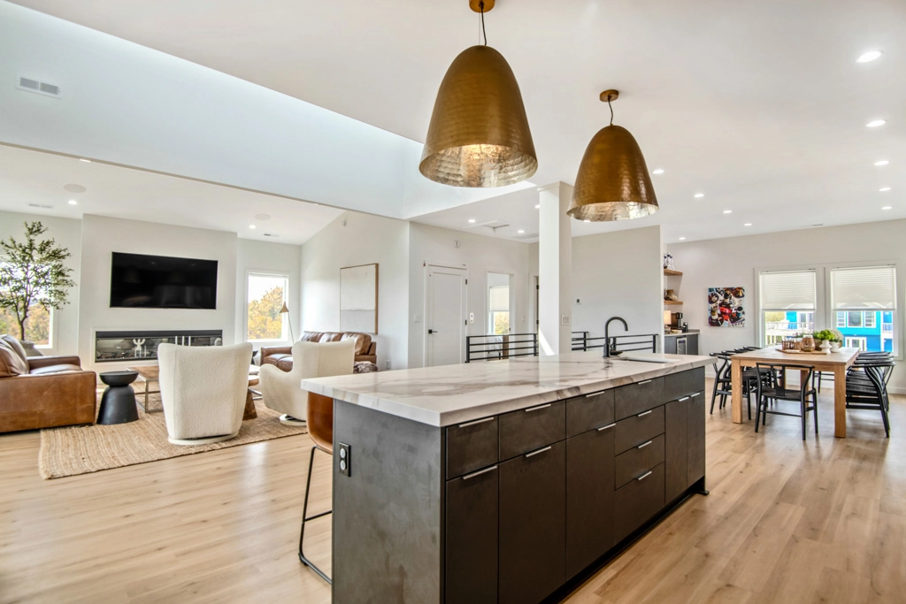 Great room with electric fireplace; kitchen with two refrigerators and two dishwashers; dining area.