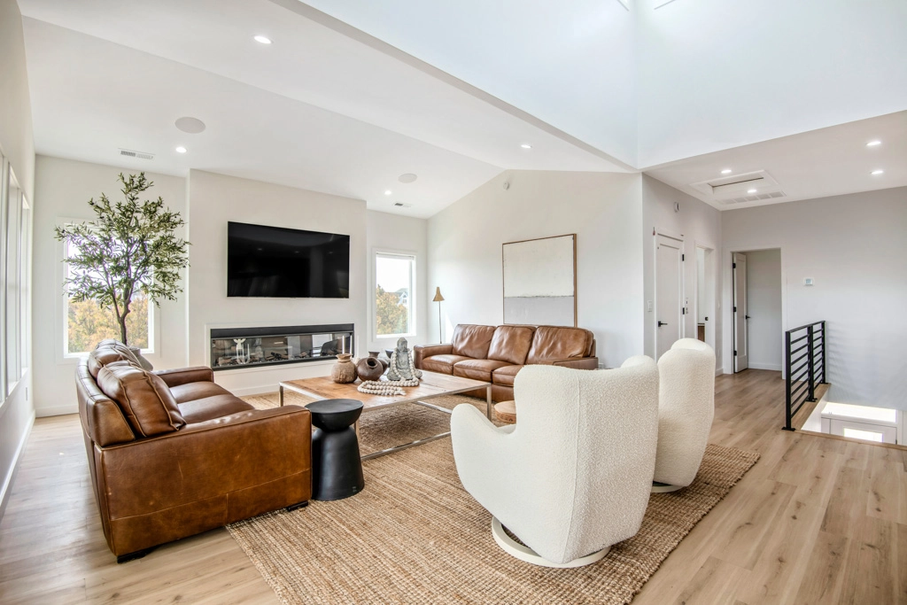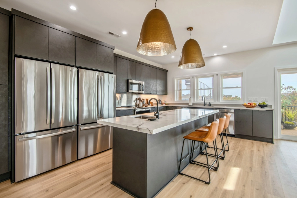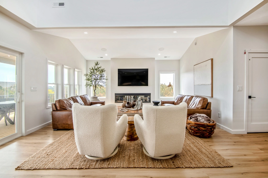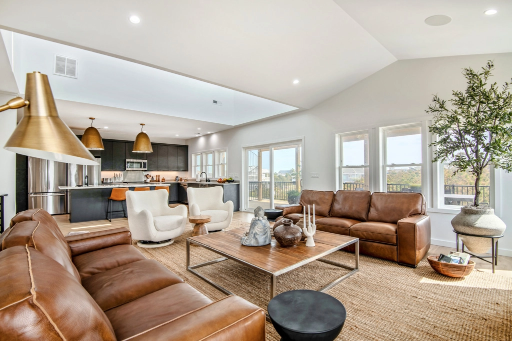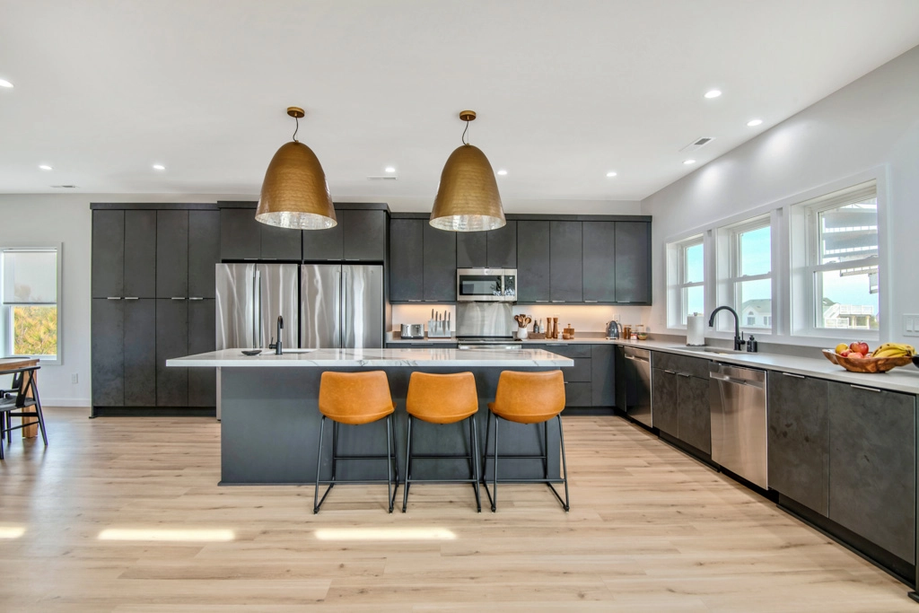 Great room with electric fireplace; kitchen with two refrigerators and two dishwashers; dining area.