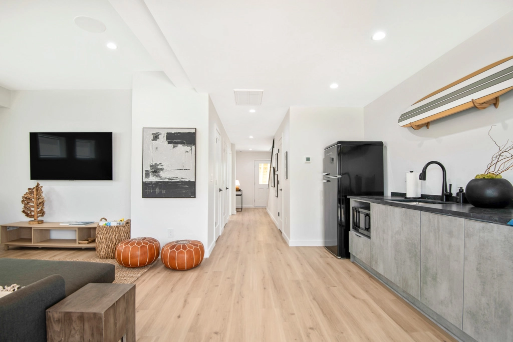 Media room with wet bar with refrigerator.