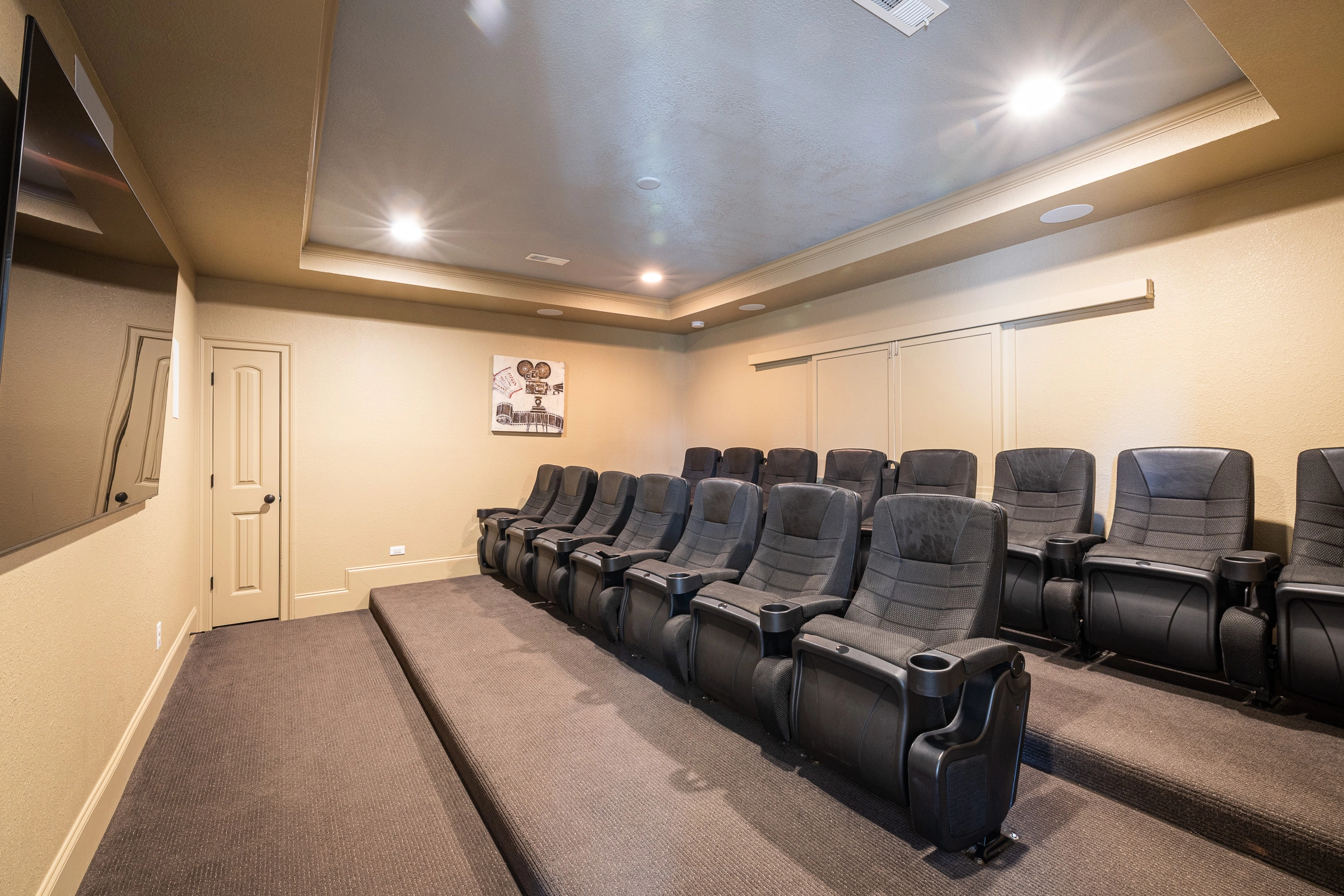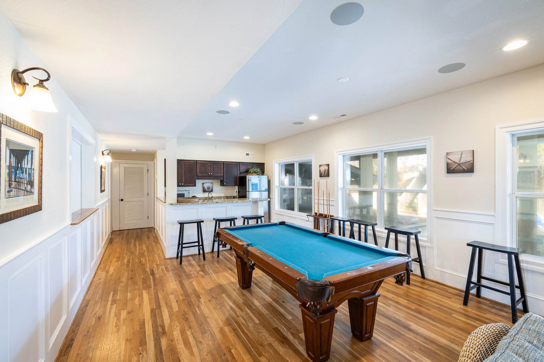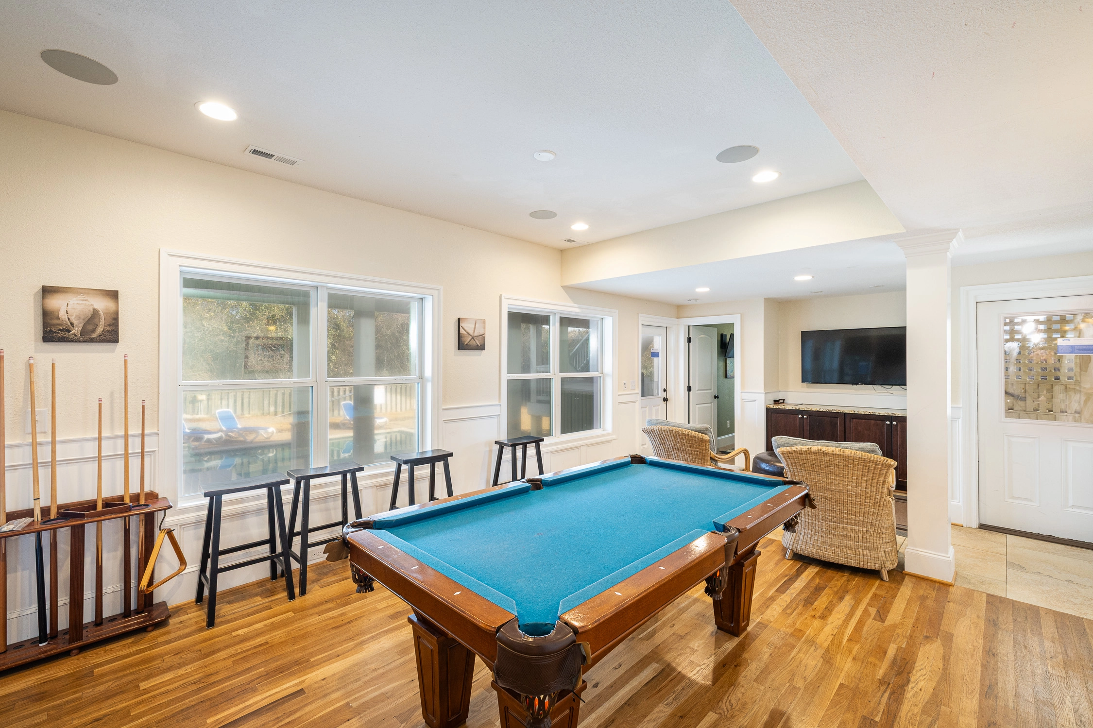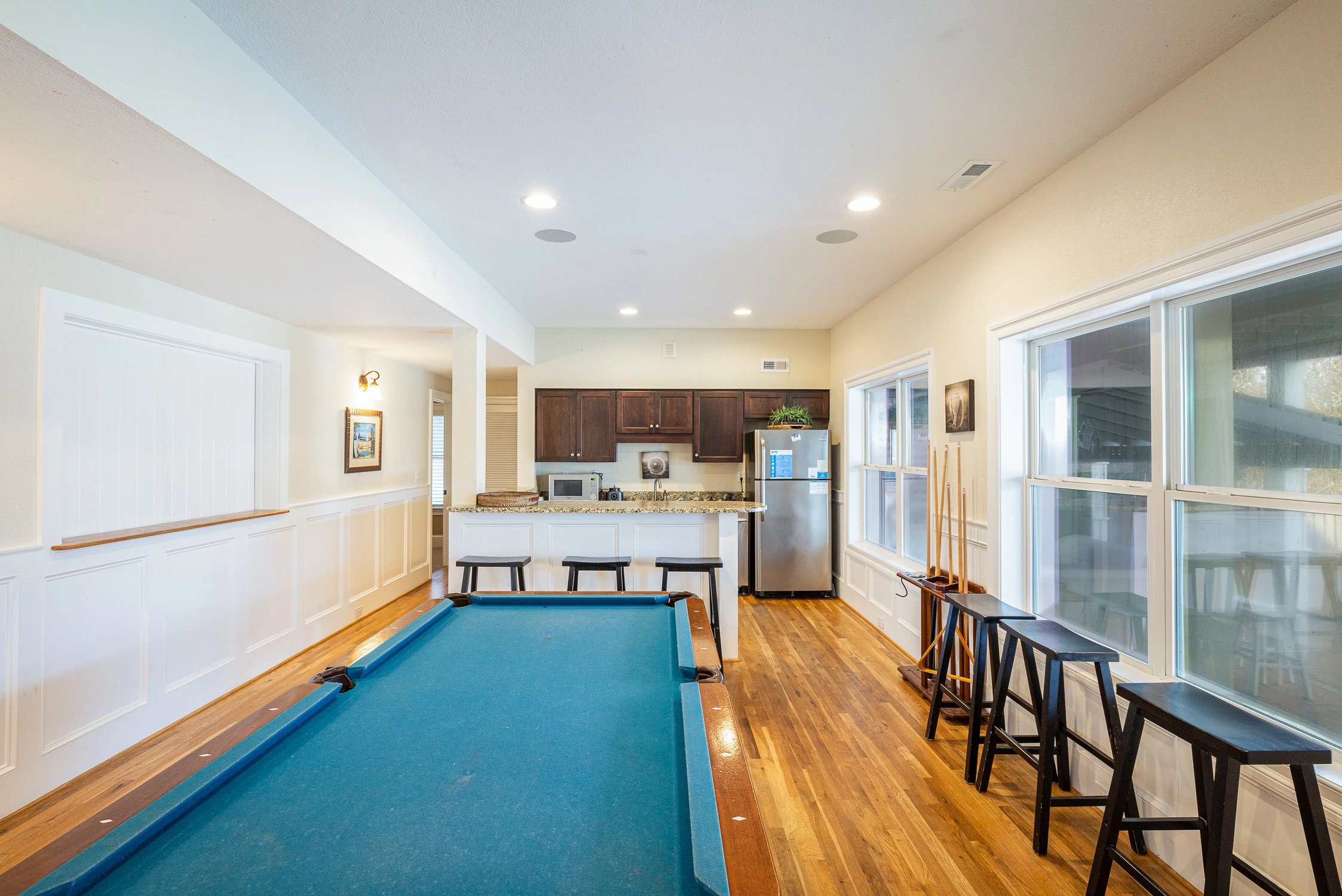 Rec room with pool table and wet bar; theater room.