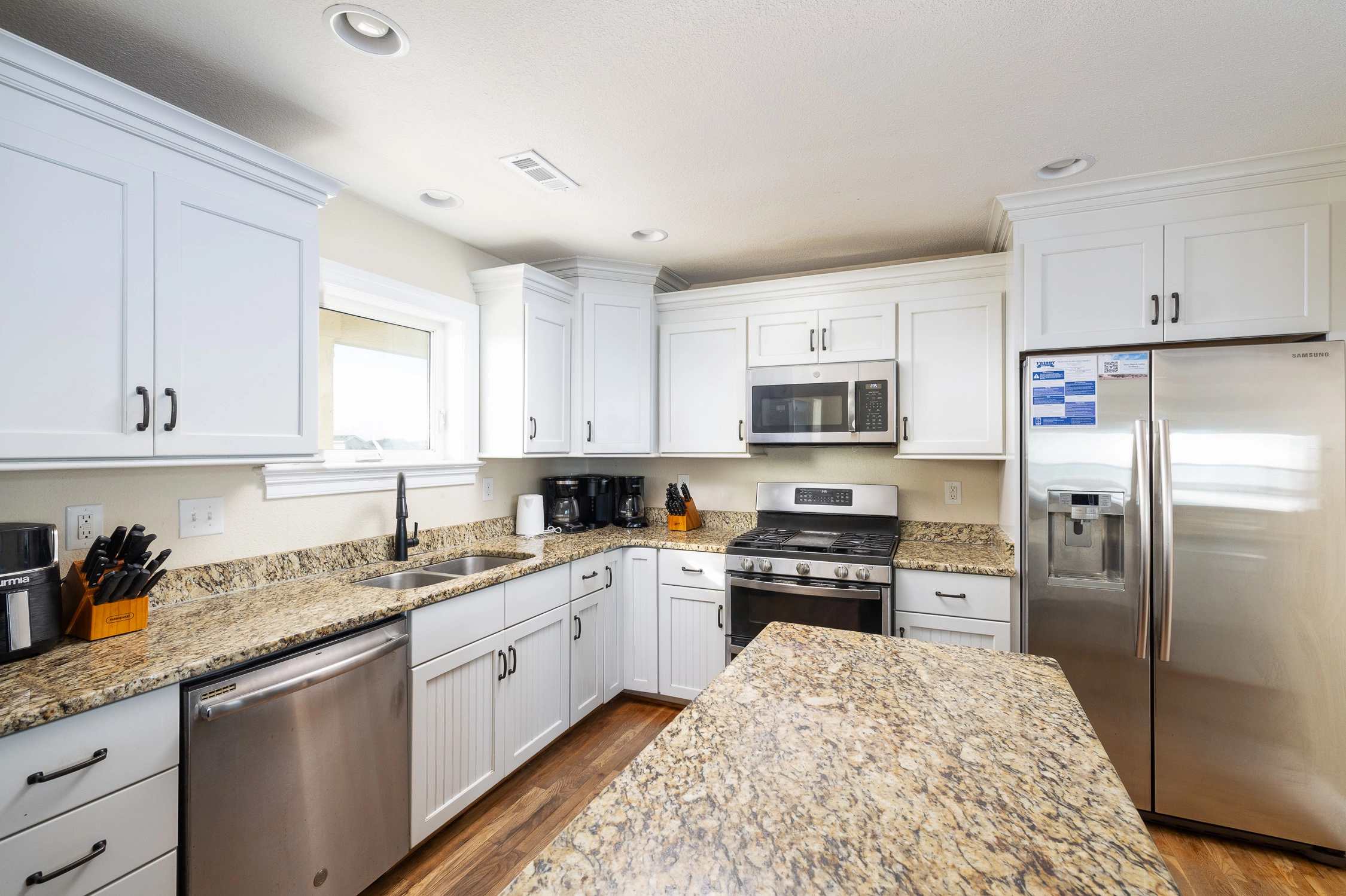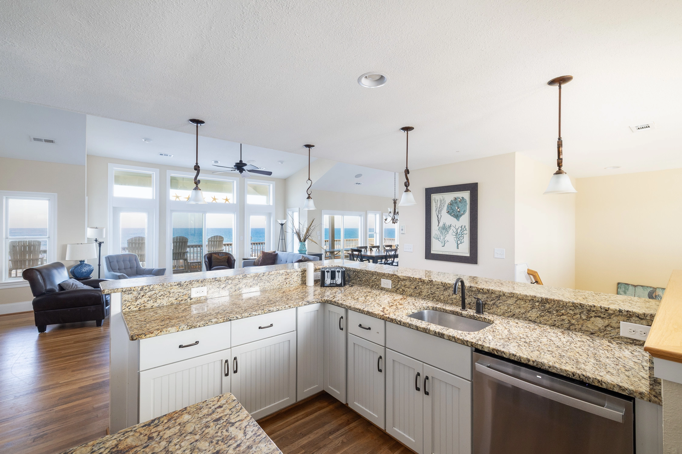 "Haven for Ten's kitchen was set up so a group of people could be in the kitchen prepping and cooking. The deck over looking the ocean was nice because it extended the whole back of the house. Bedrooms were large and beds were very comfortable."