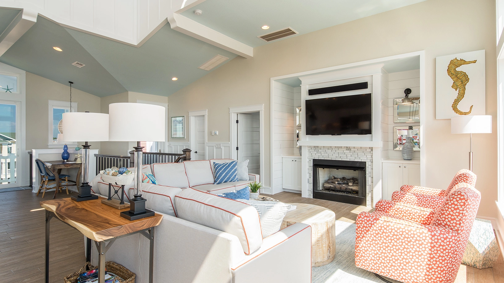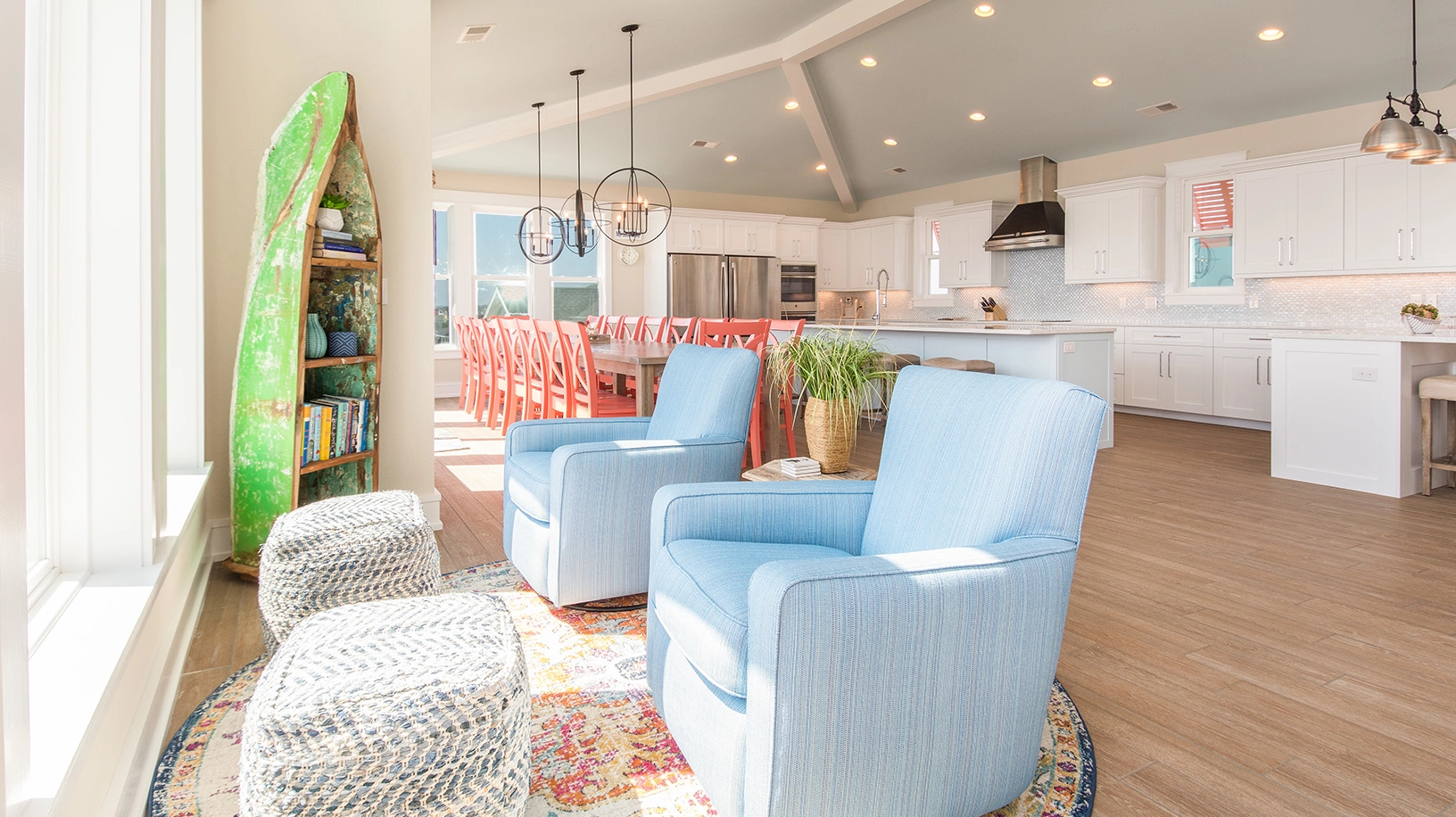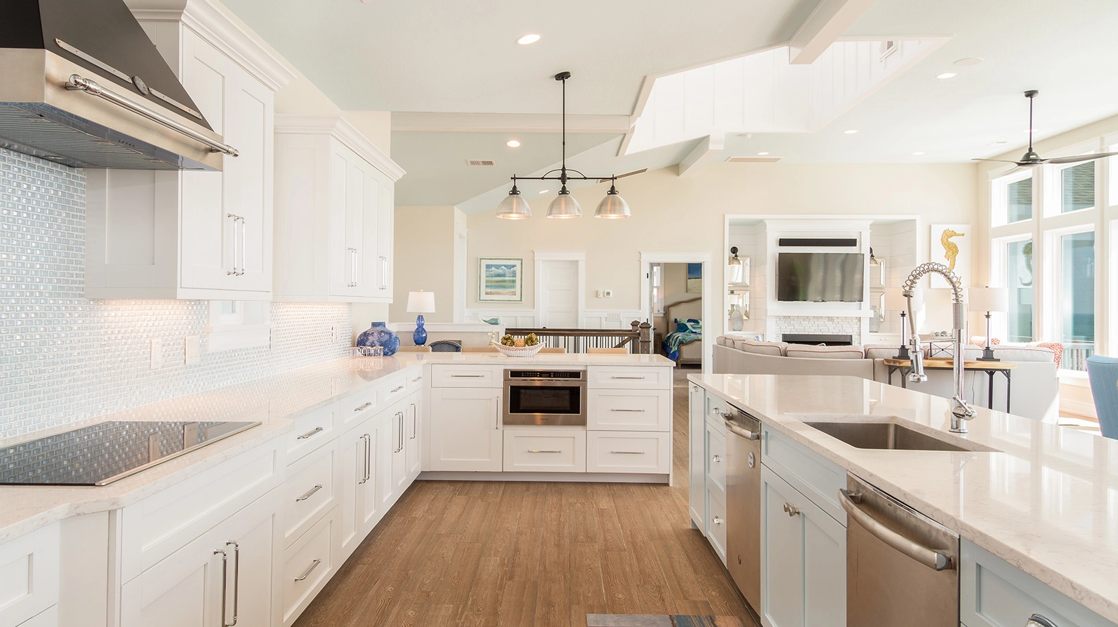 Great room with gas fireplace; kitchen with two dishwashers and two refrigerators; dining area.