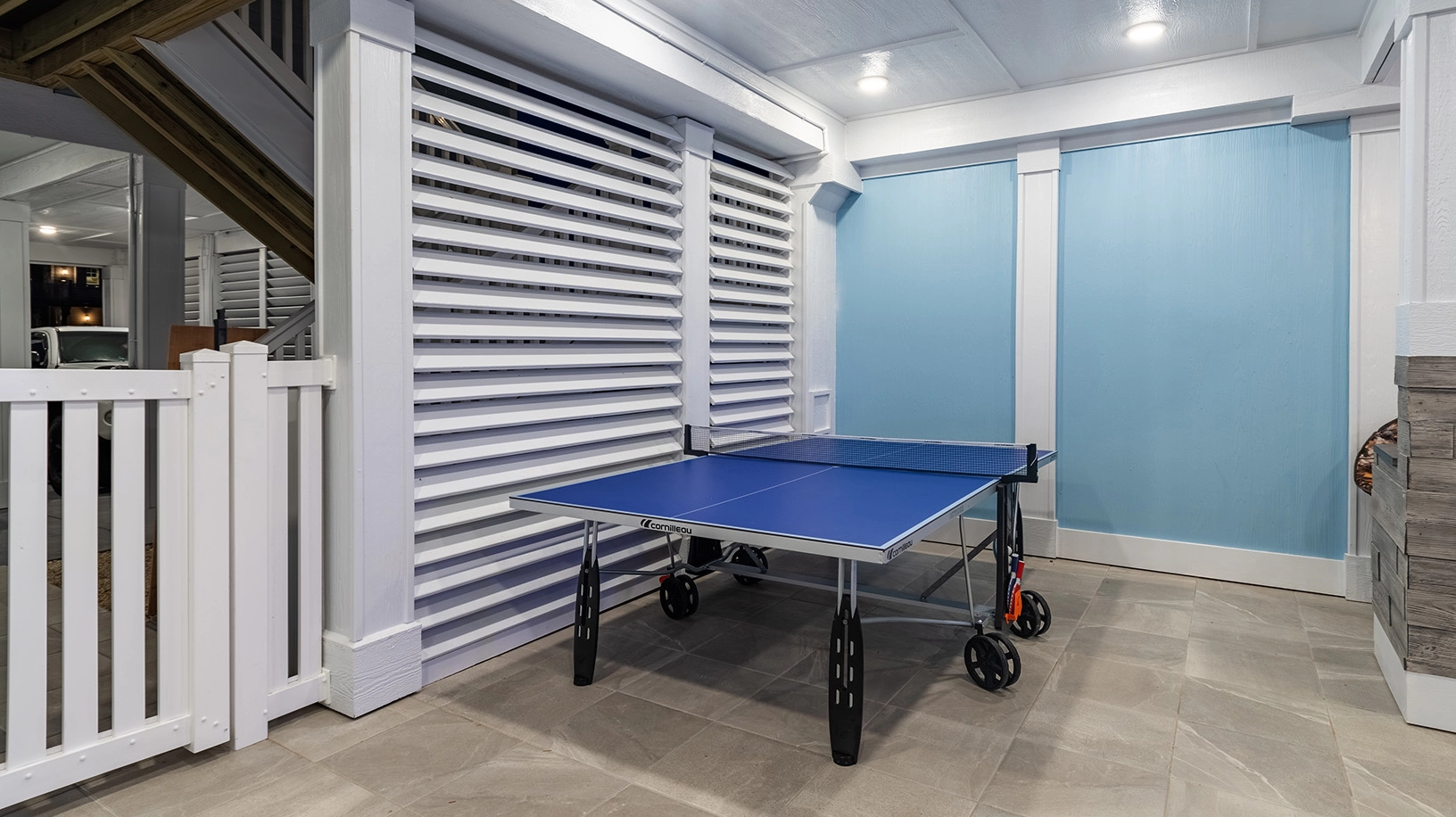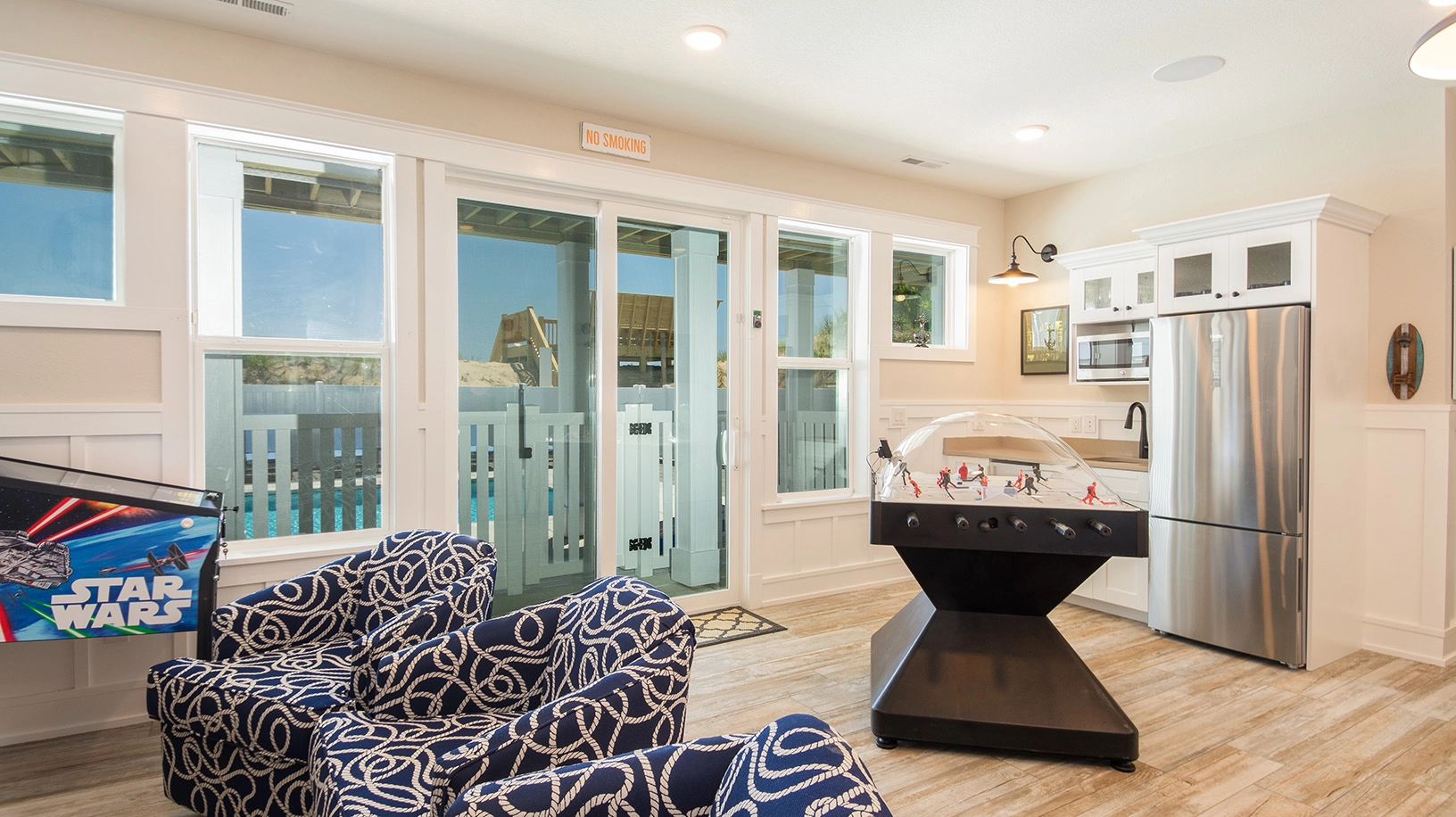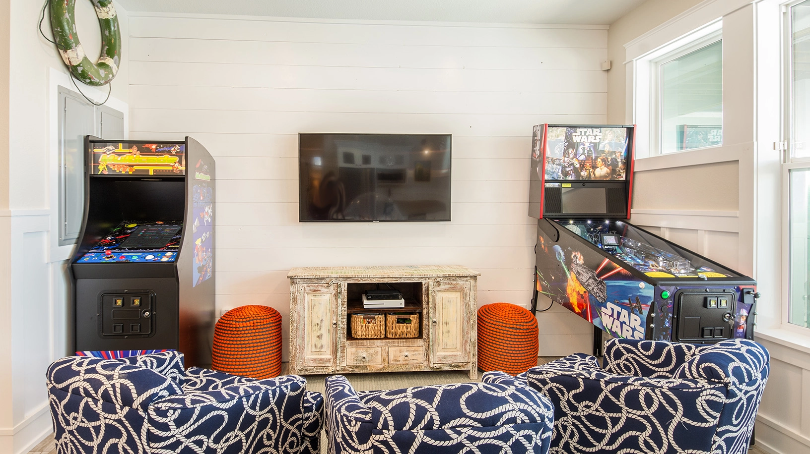 Rec room with gaming station, foosball and arcade game; laundry.
