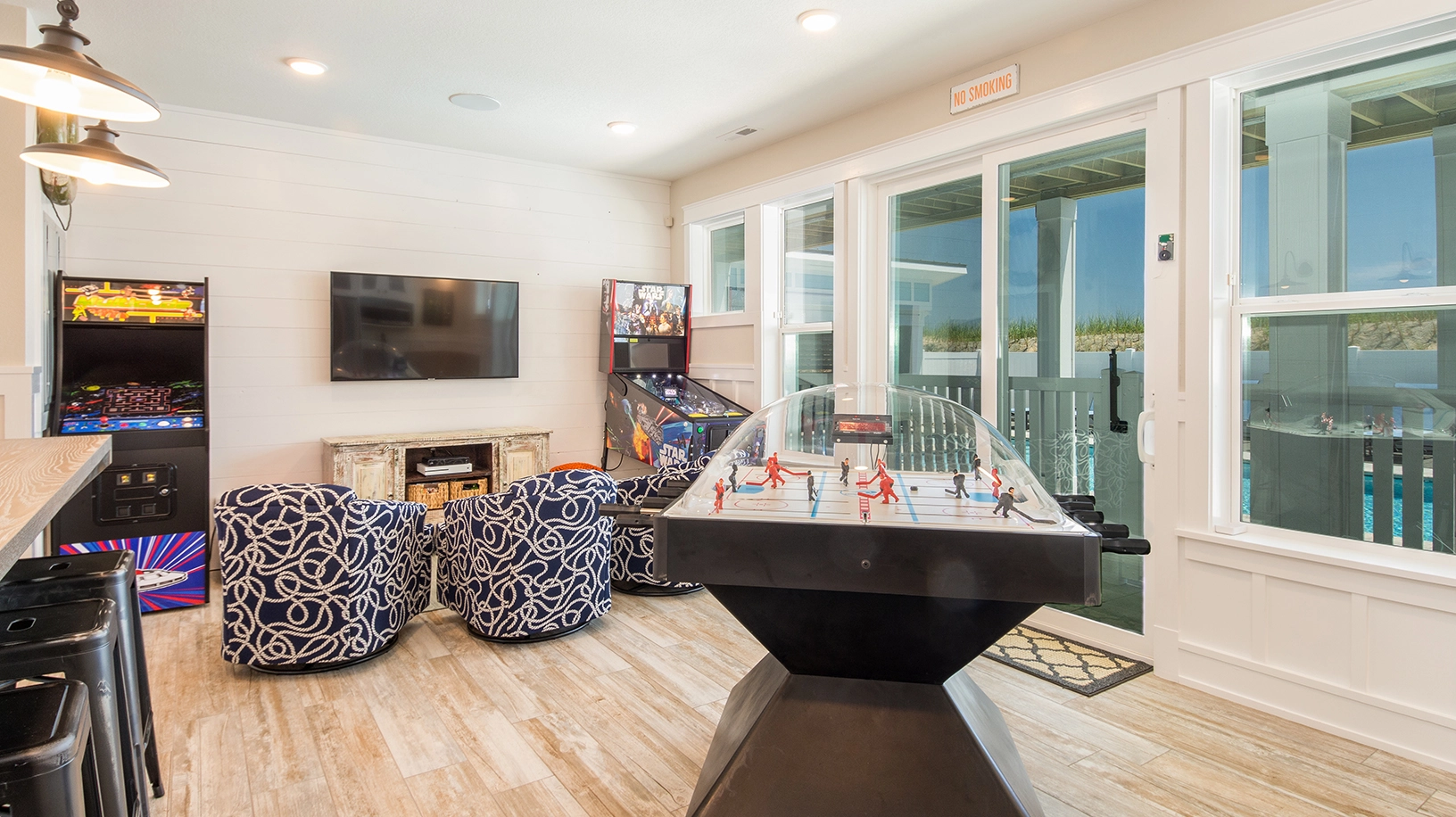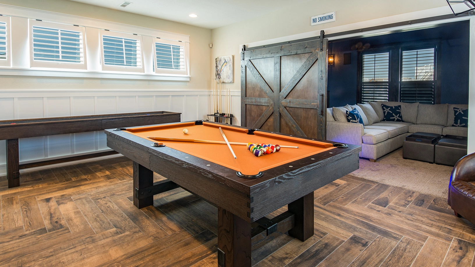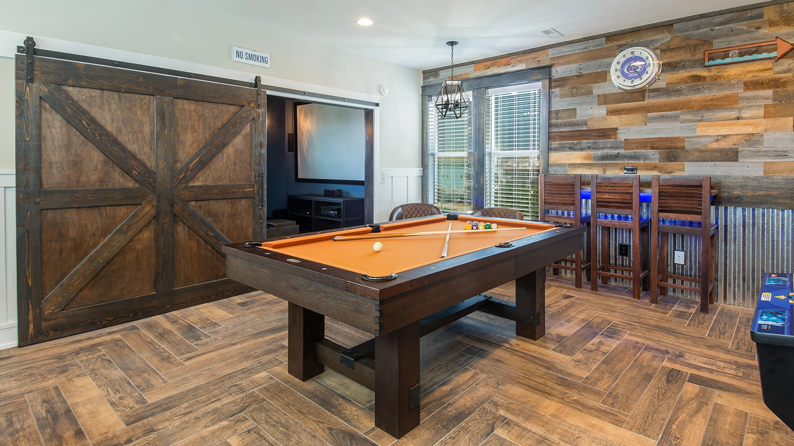 Rec room with pool table, shuffleboard, arcade game and wet bar; theater room.