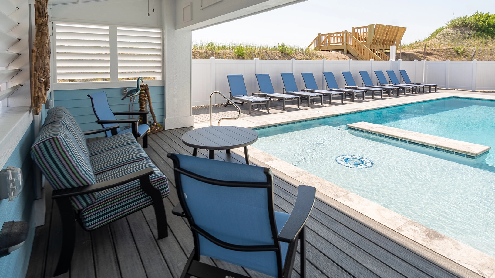 "Large kitchen and big table for everyone. Pool with a shady area next to it. Close walk to beach. Porches."