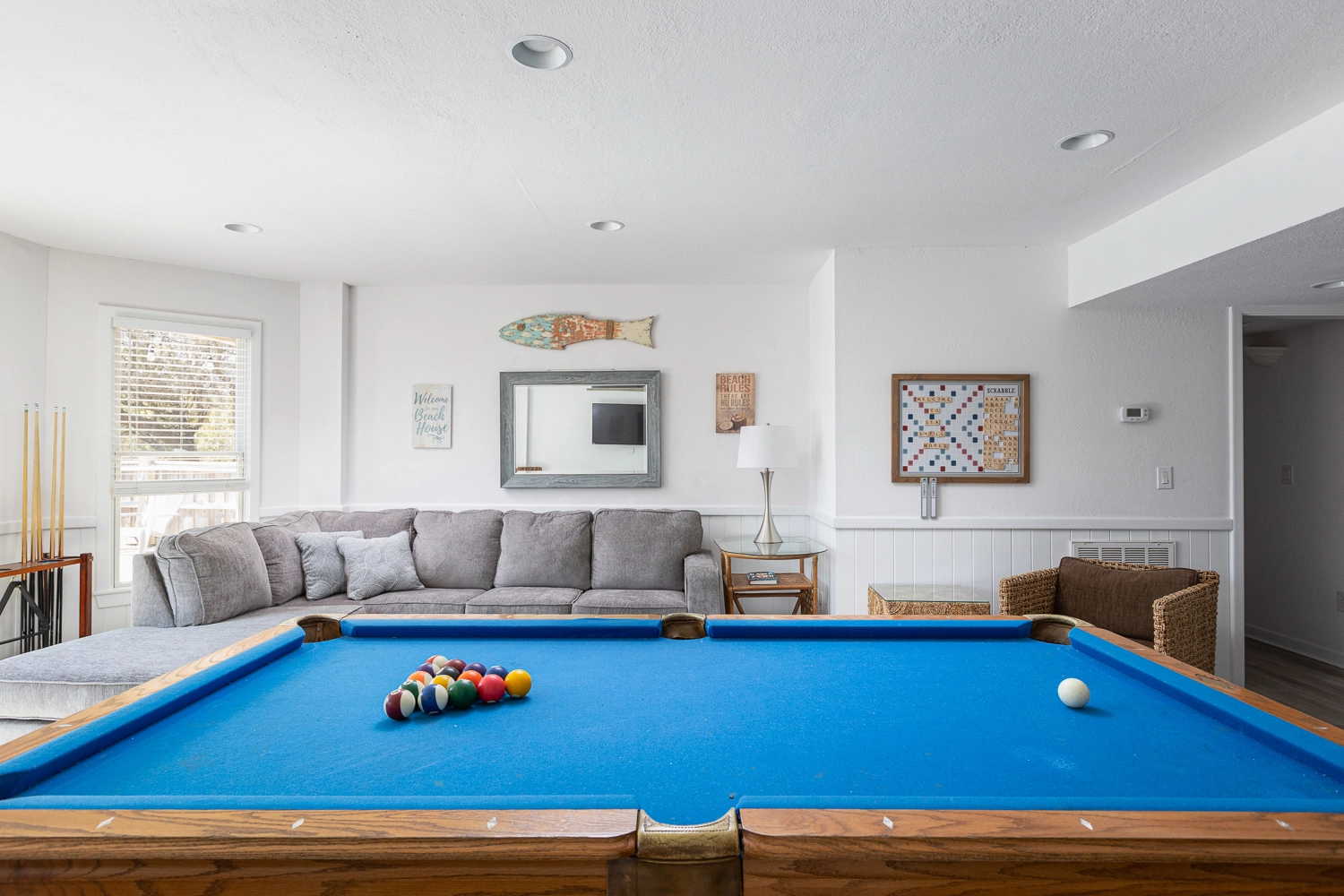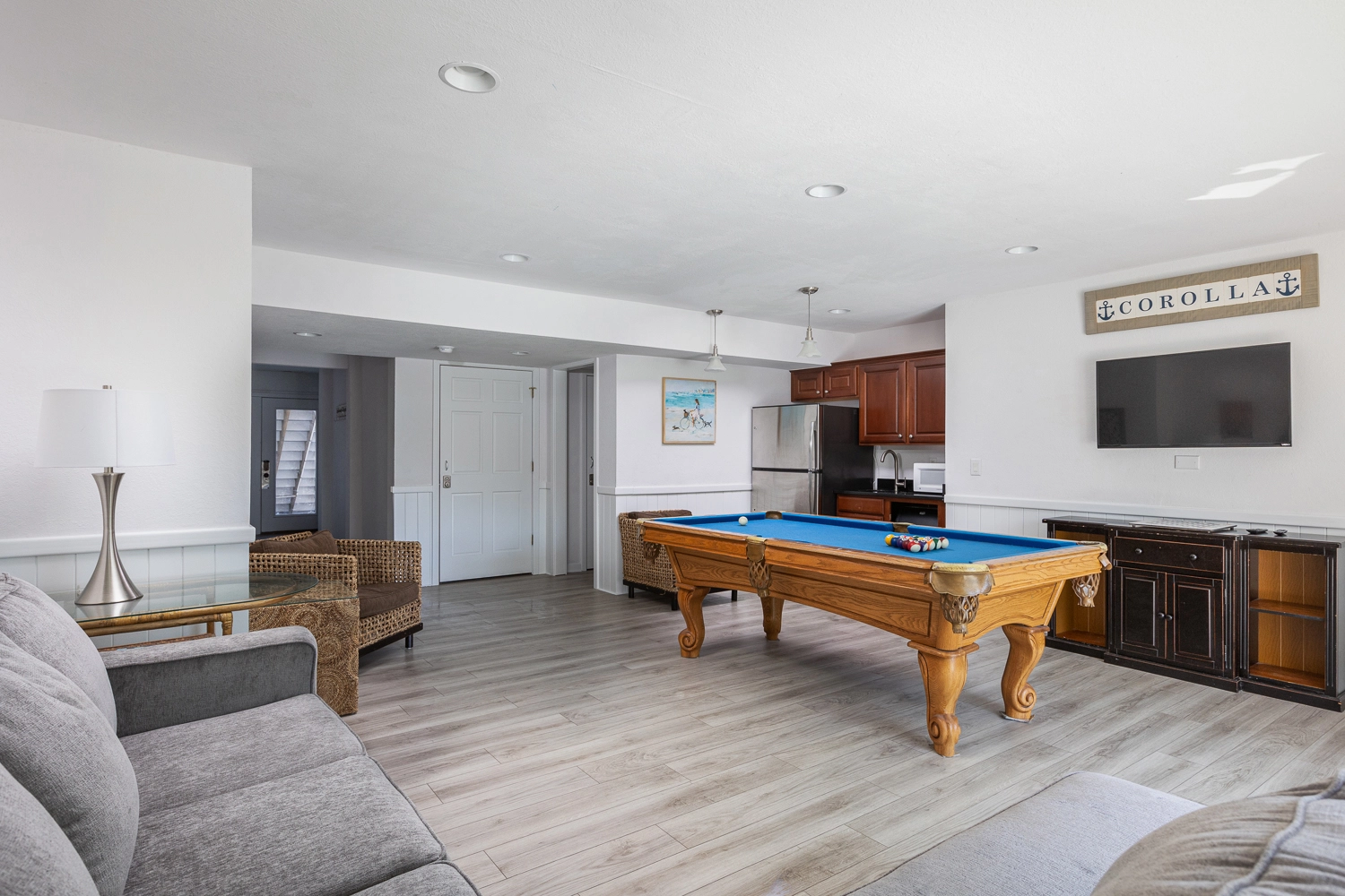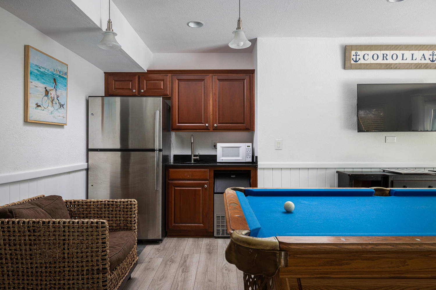 Rec room (QSS) with pool table with kitchenette with refrigerator and microwave.