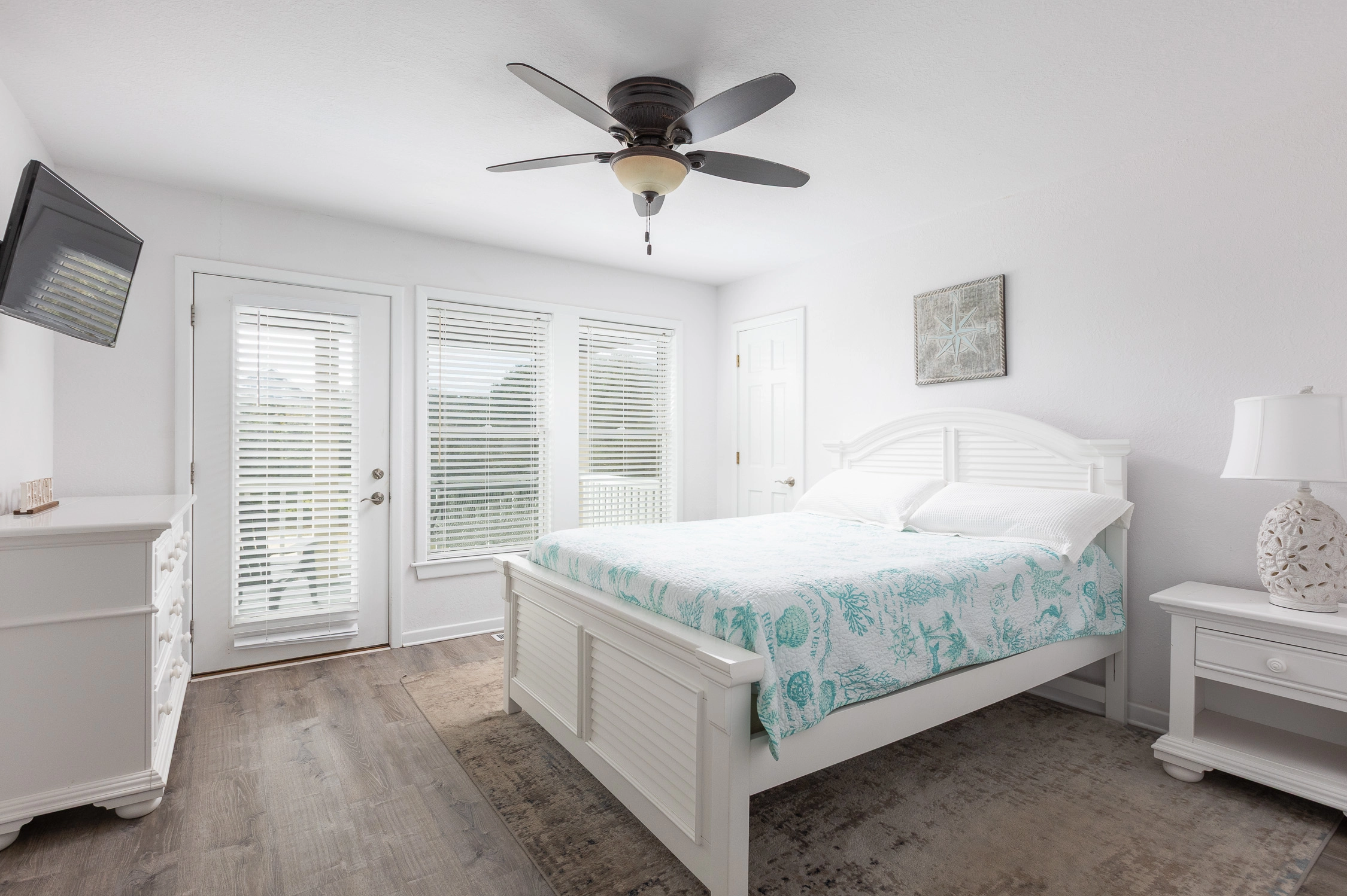 Queen, Semi-private bath, Shower/tub combo, Deck access