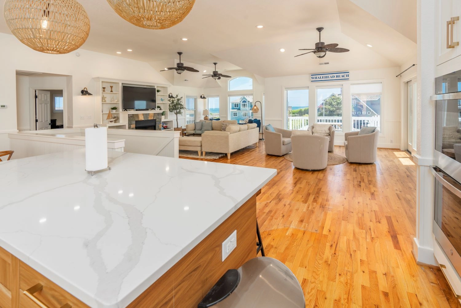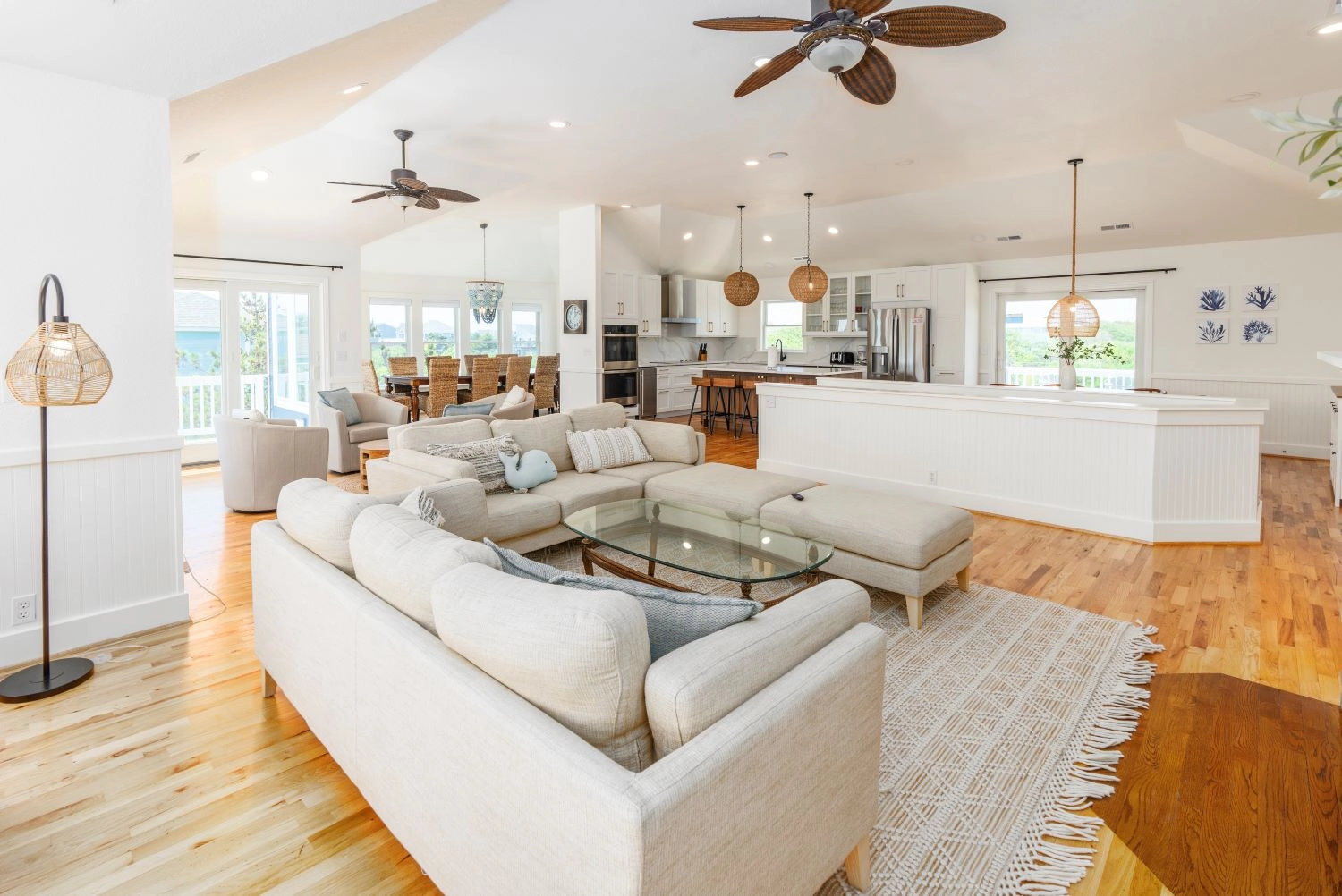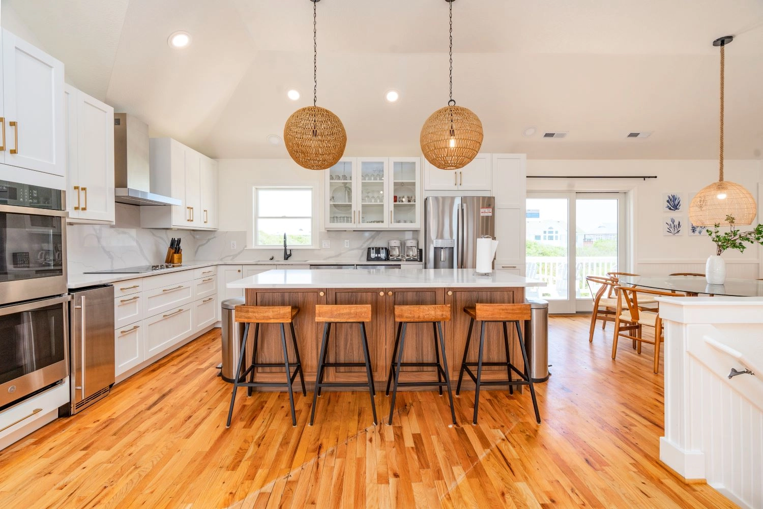 "Lots of living spaces. The great room on the top level has plenty of space for everyone to hang out. Great kitchen if you’re cooking meals. Pool is perfect. Lots of bedrooms/bathrooms. Perfect for large extended families. Short walk to the beach."