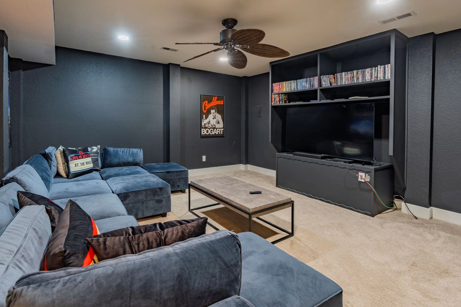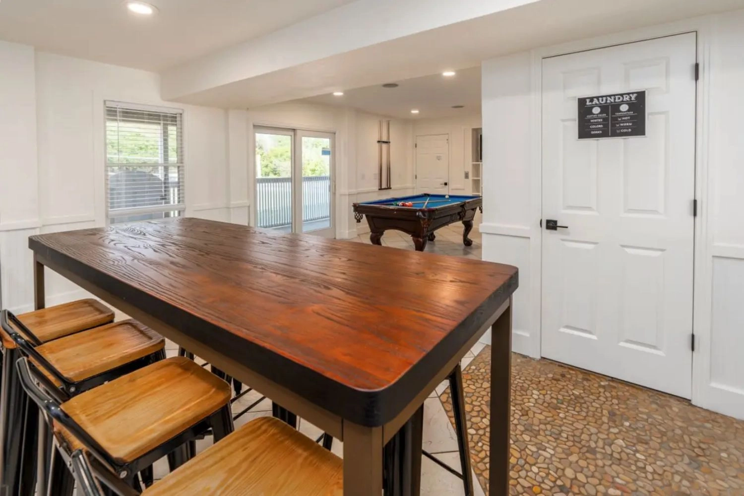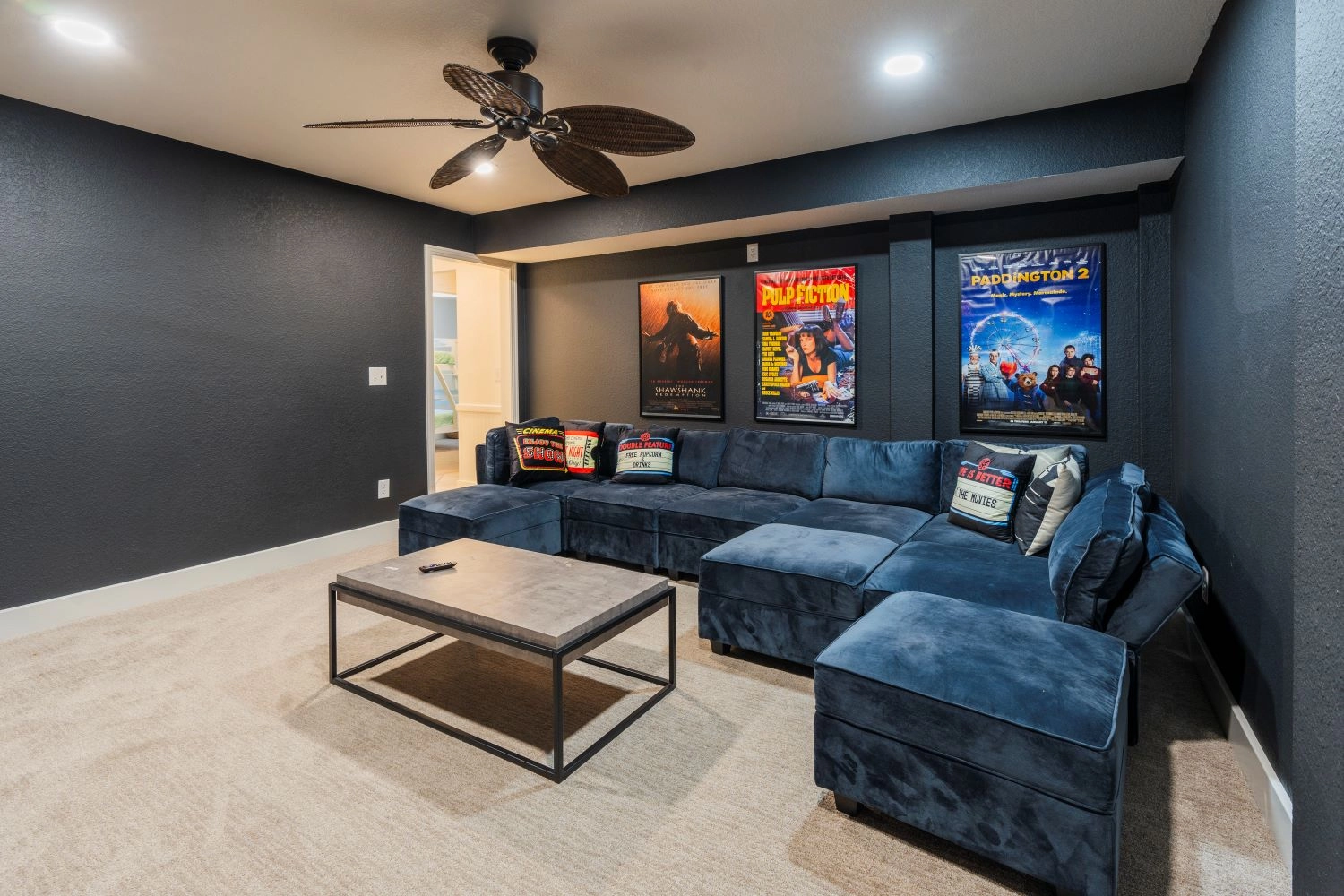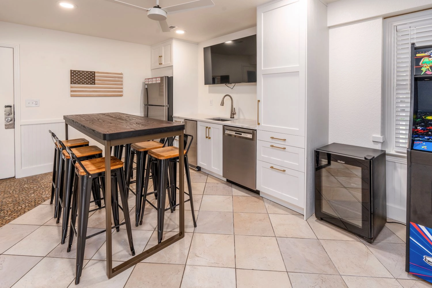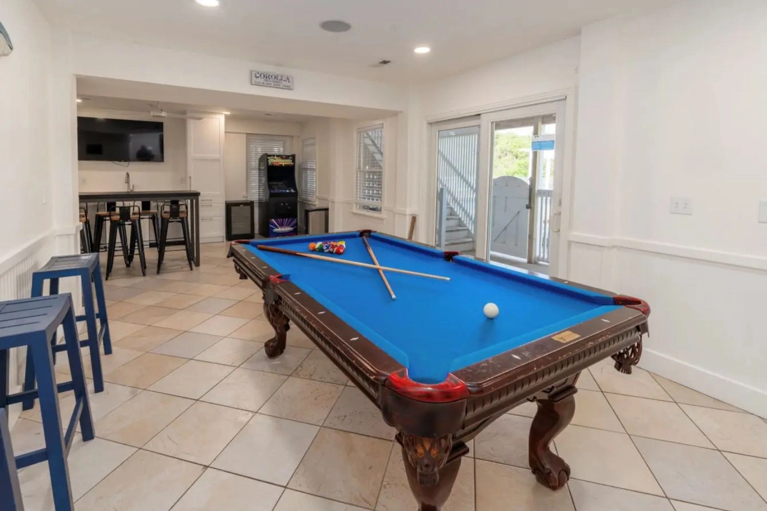 Media room; rec room with pool table, arcade game, seating, wet bar and full refrigerator.
