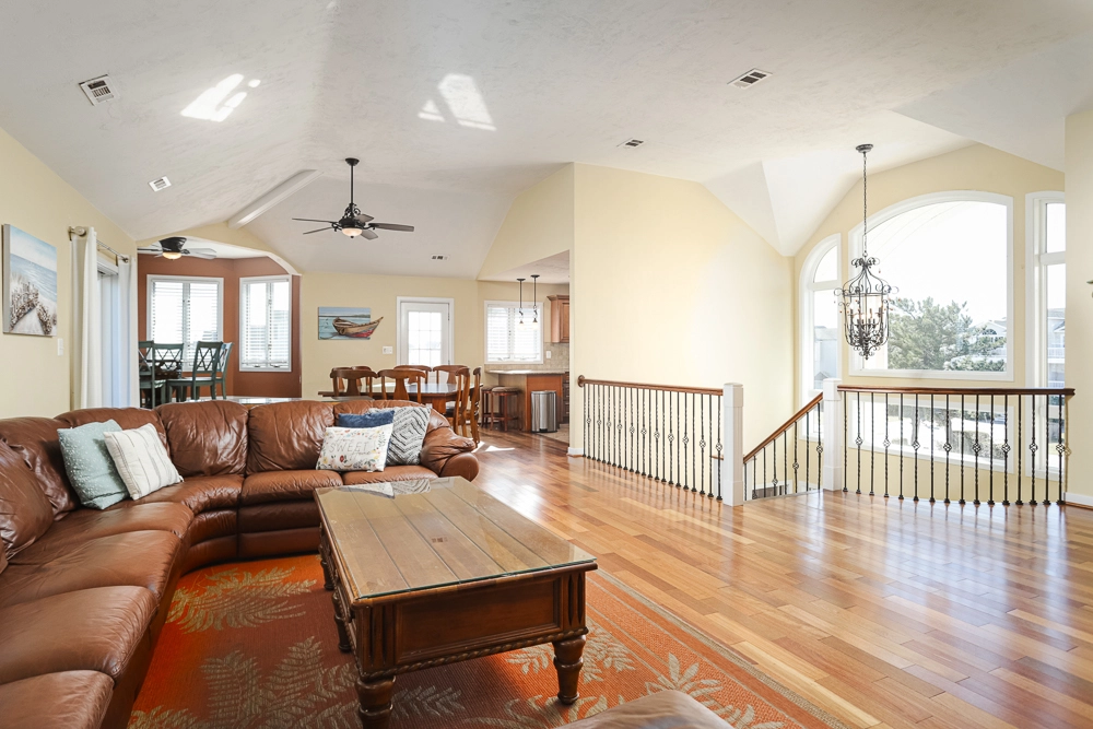 Great room with gas fireplace; kitchen; dining area; ship's watch.