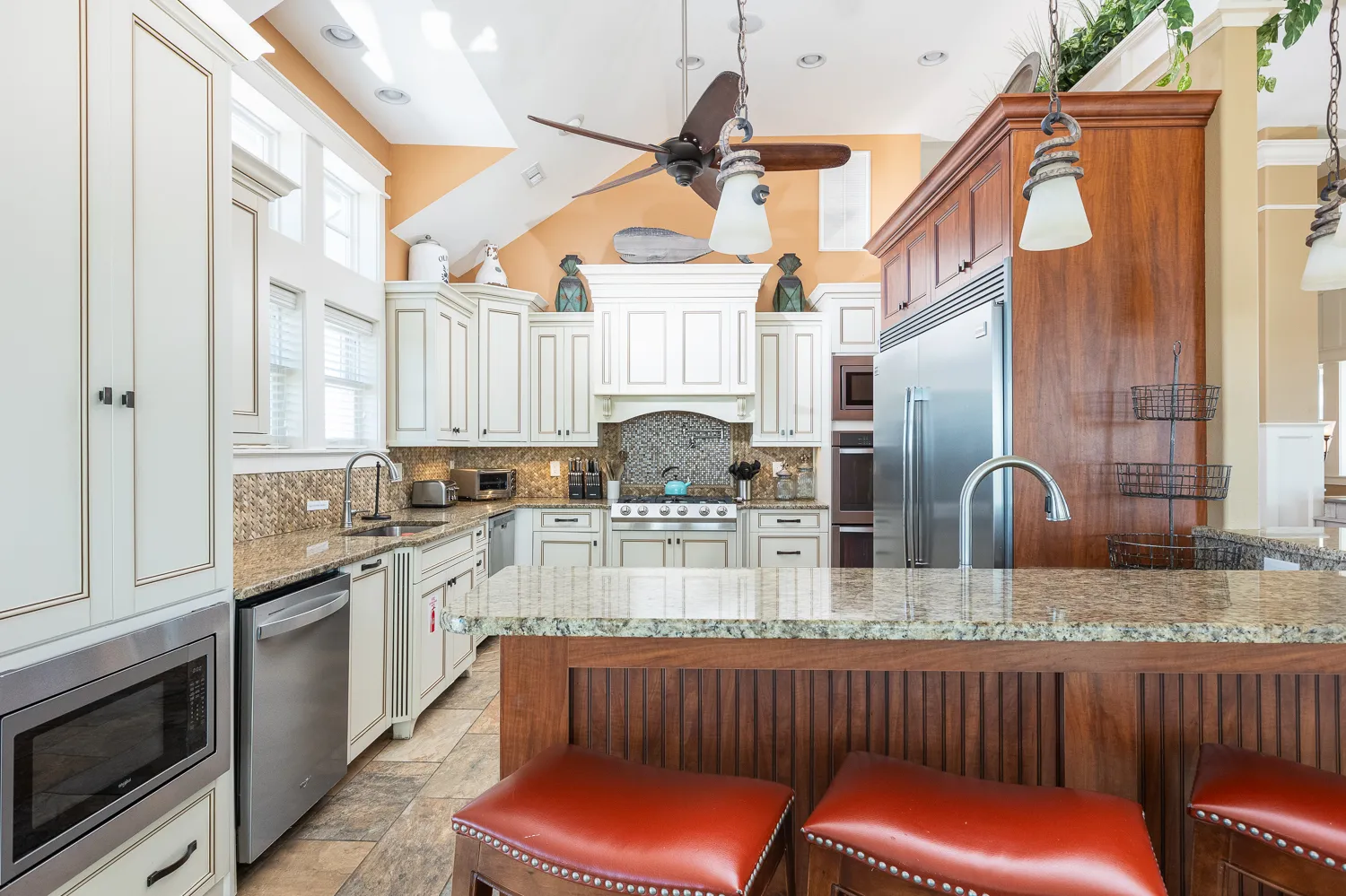 Great room with gas fireplace; kitchen with gas stove, Sub-Zero refrigerator, and two dishwashers; dining area.