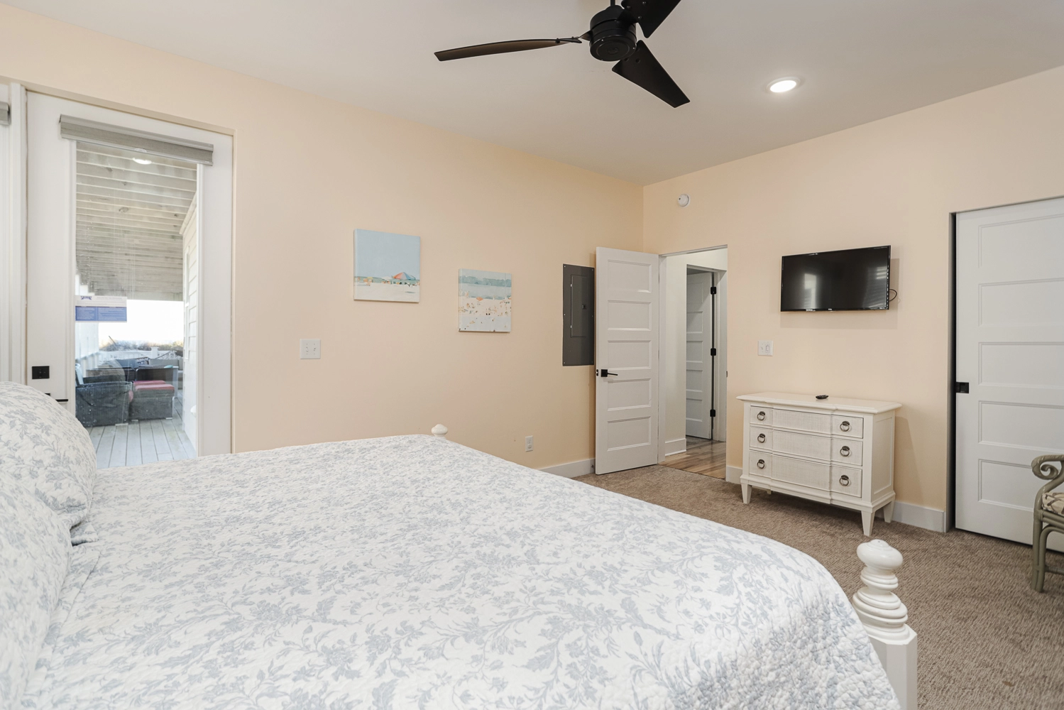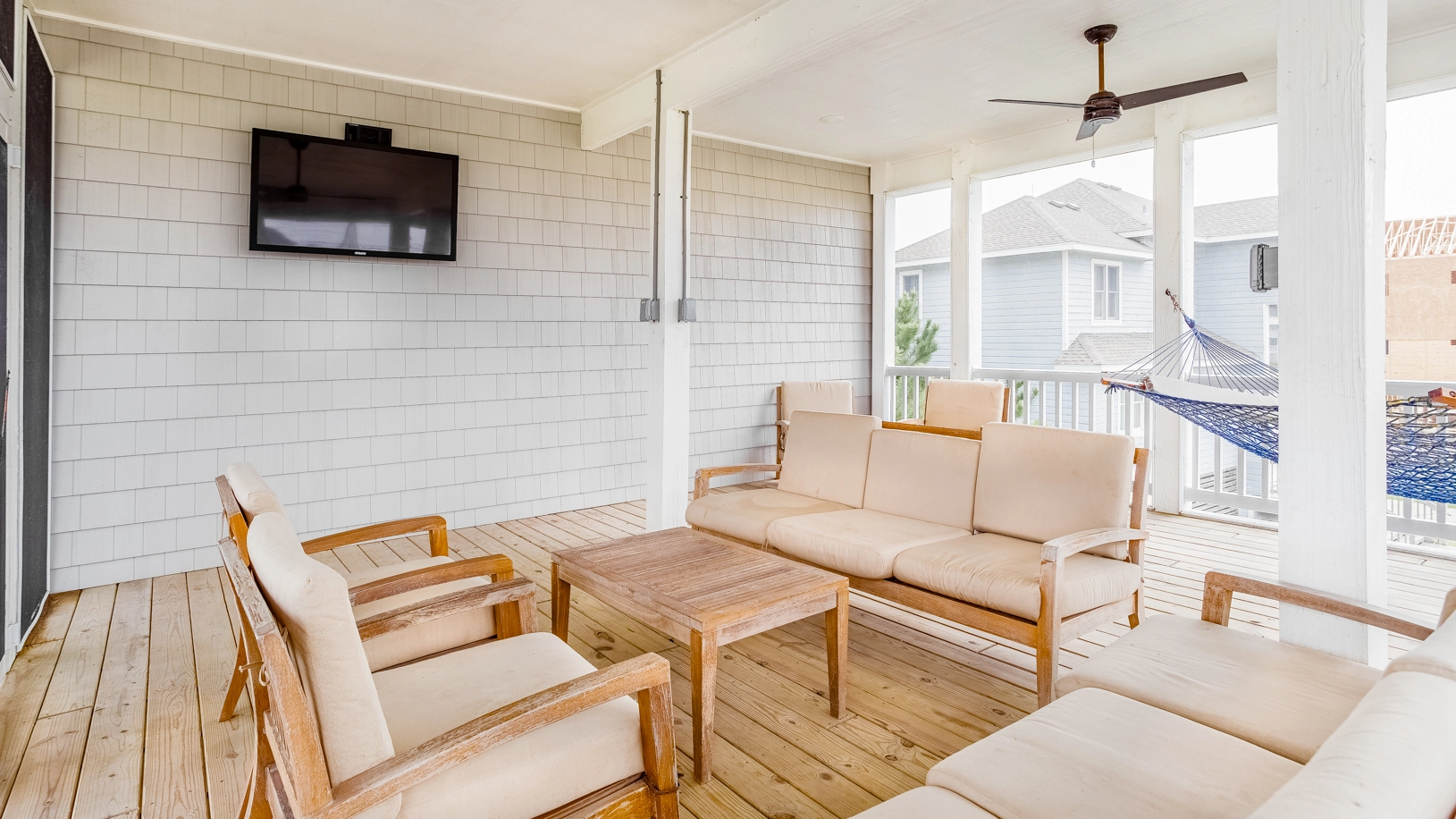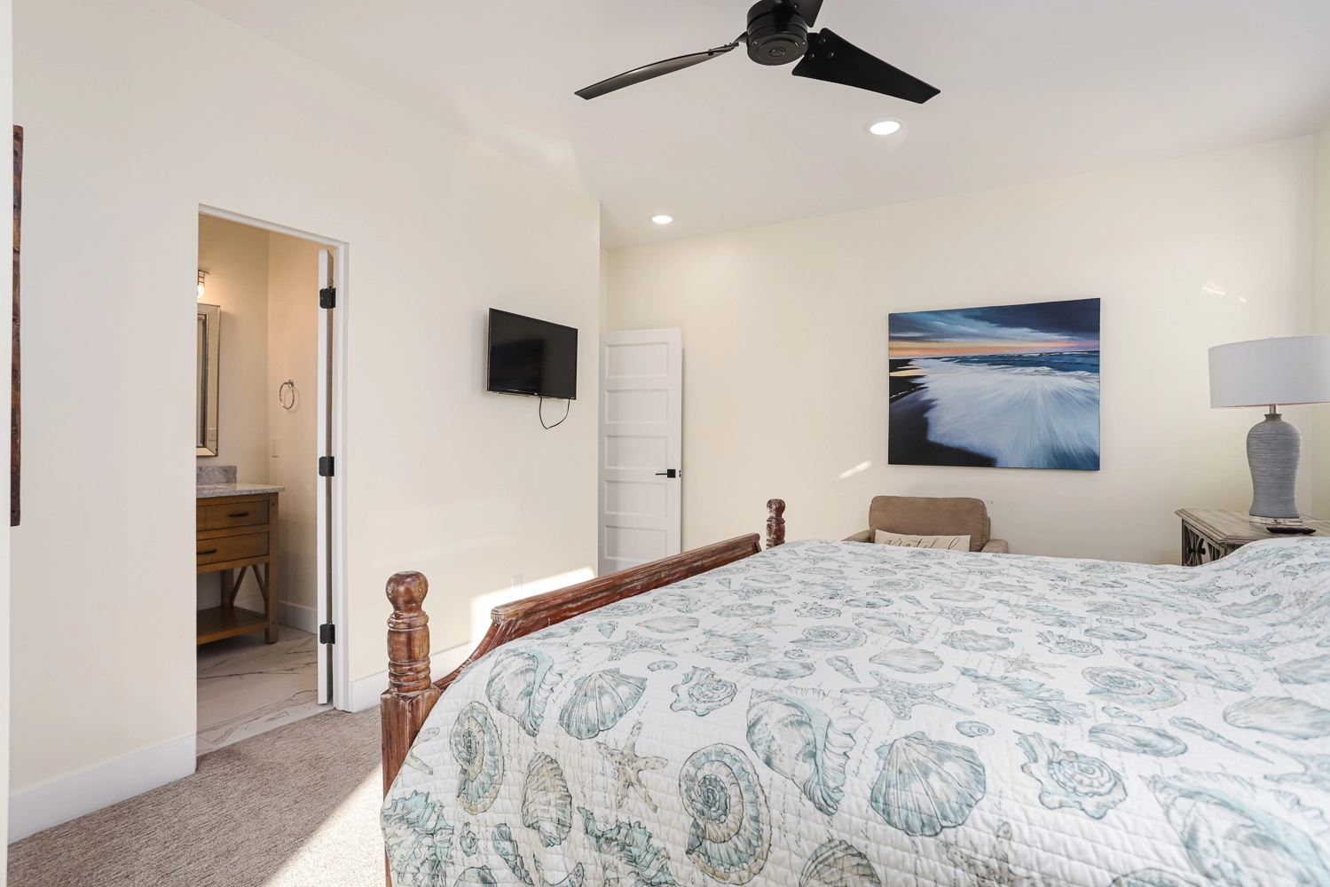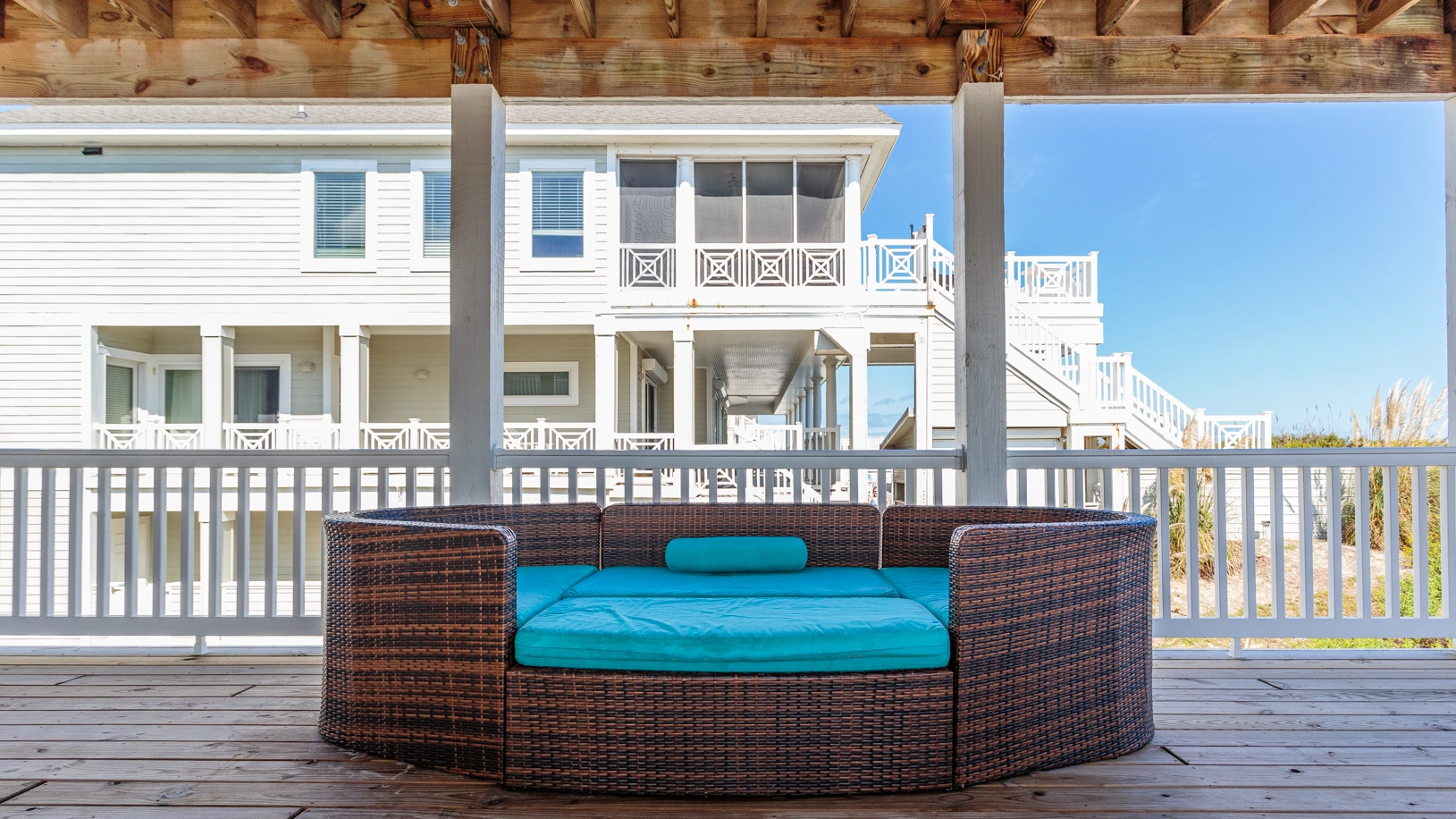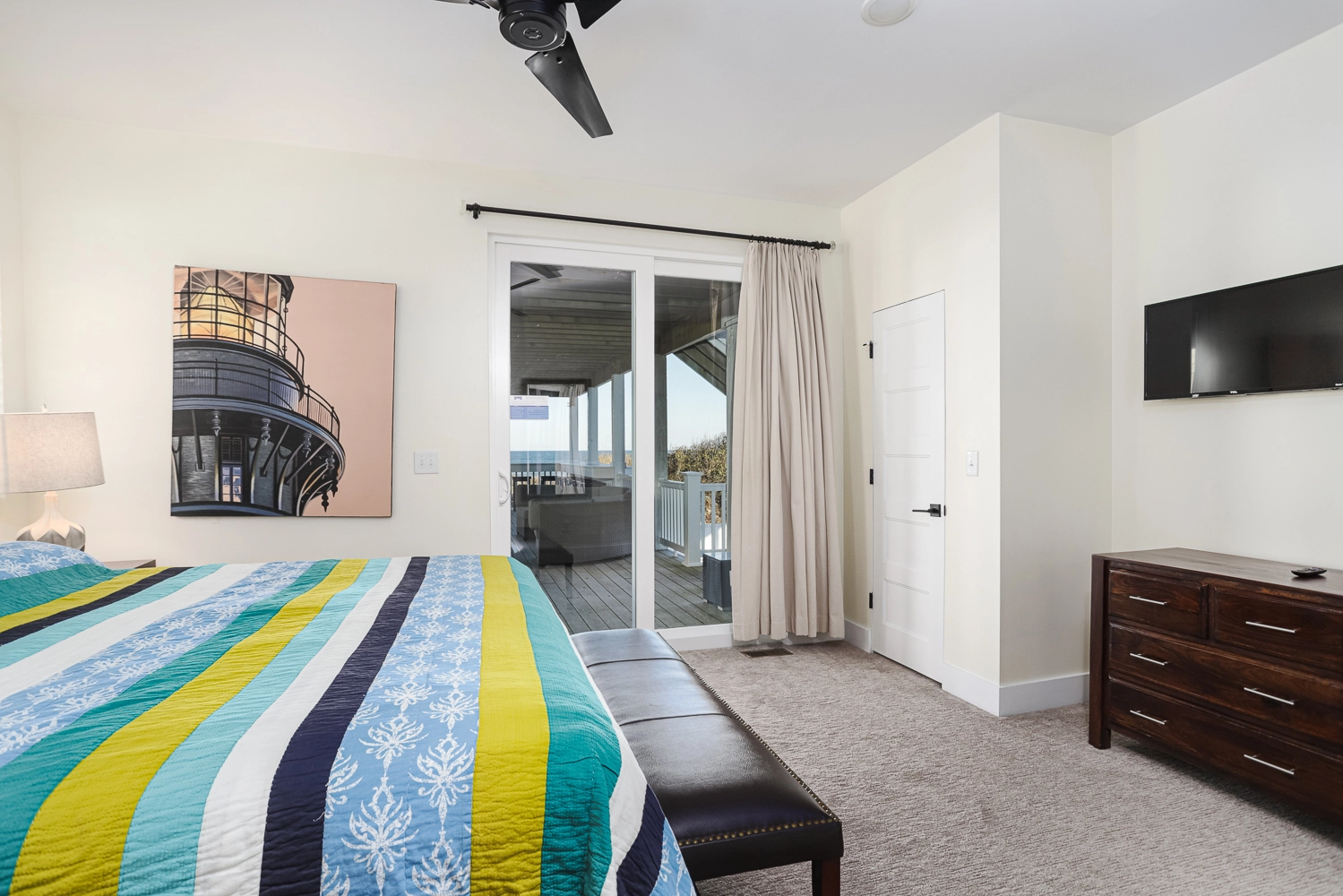 "Loved that each King Master had deck access. "Spa suite" in separate building was nice and quiet being separated from the main house. Screened in porch was a quiet retreat away from the main house. High end outdoor furniture was a huge plus. Plenty of covered outside space to enjoy alone or with the group. Hot tub was huge! Fire pit was a nice extra addition- never thought watching a fire while listening to the waves would be so relaxing."