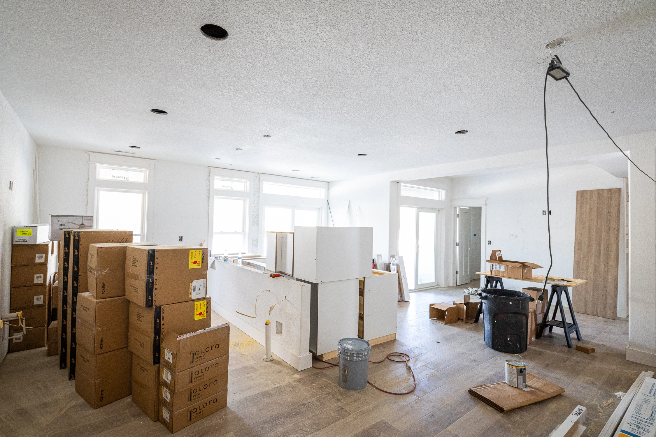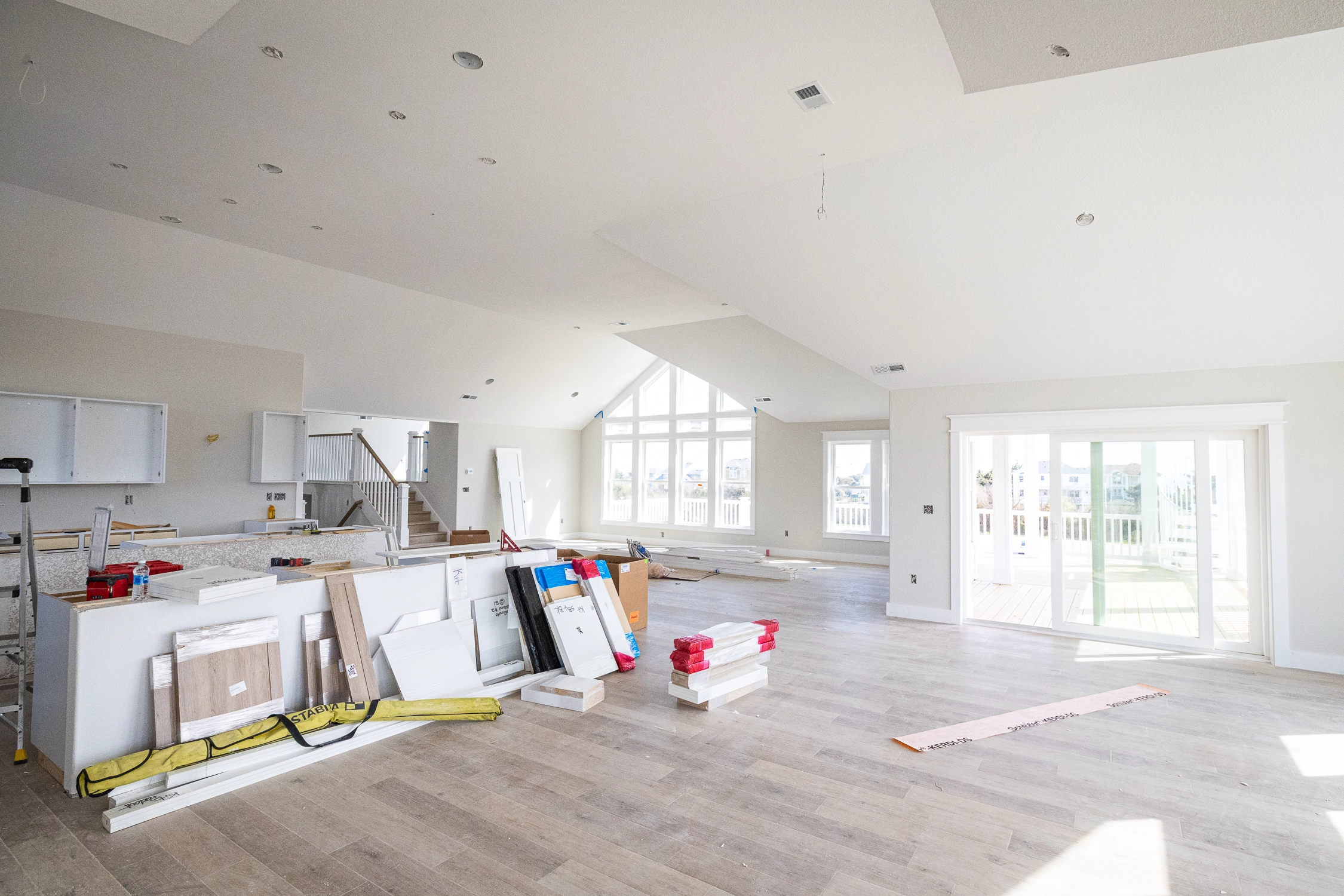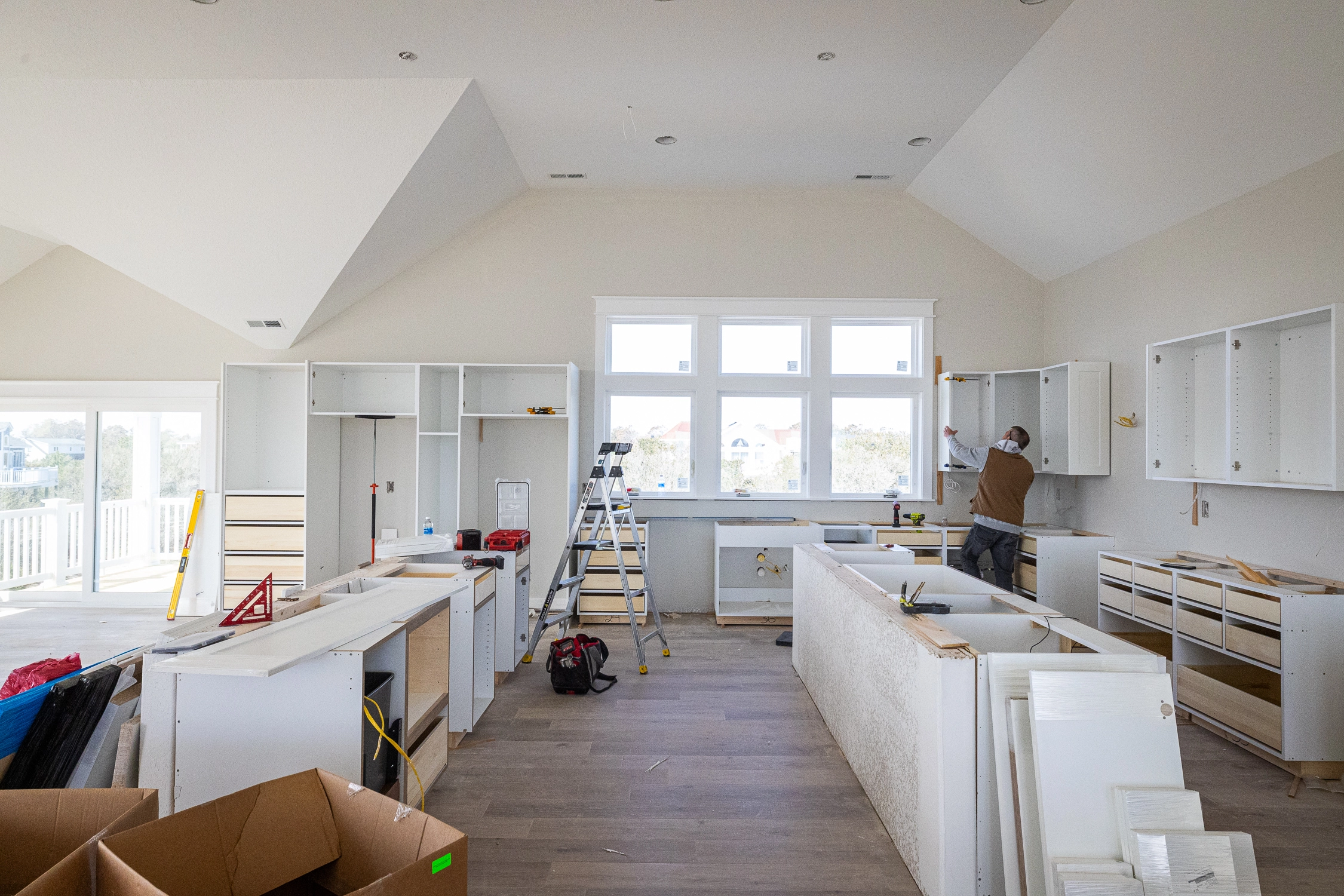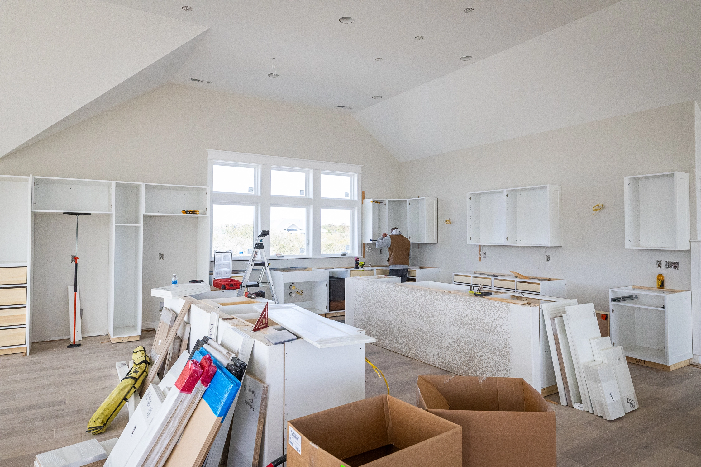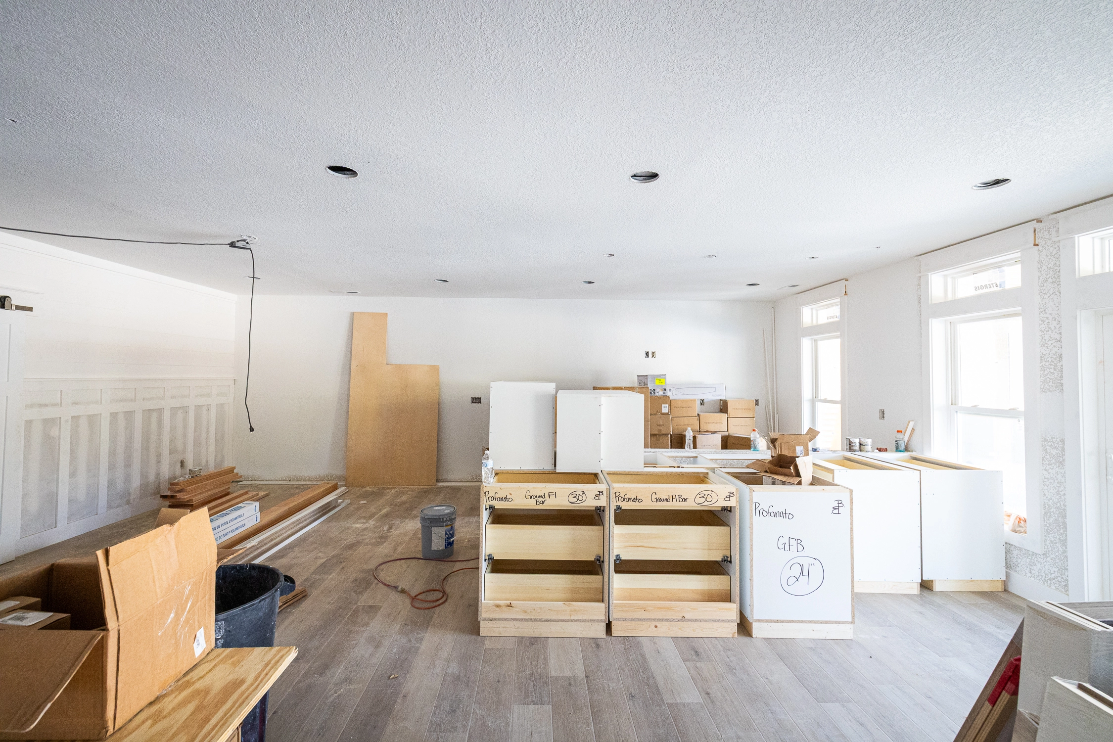 Great room; kitchen with two refrigerators, two ovens, two dishwashers; dining area.