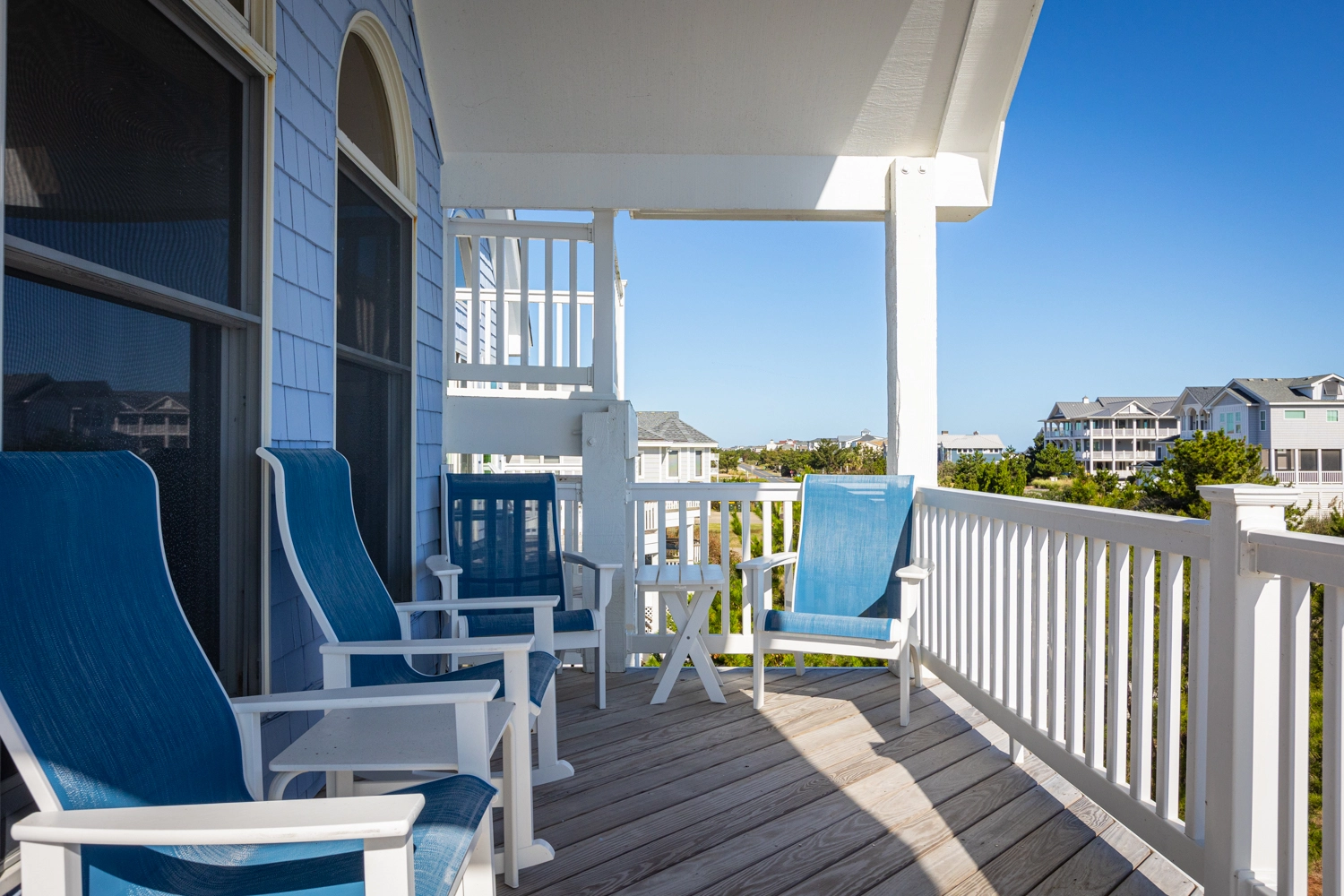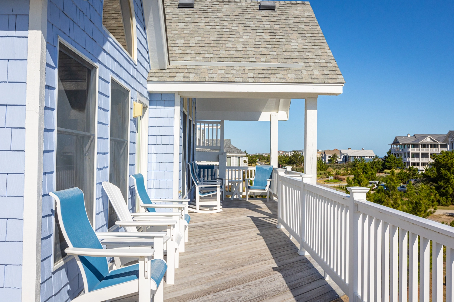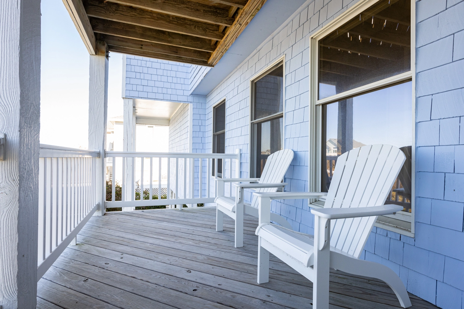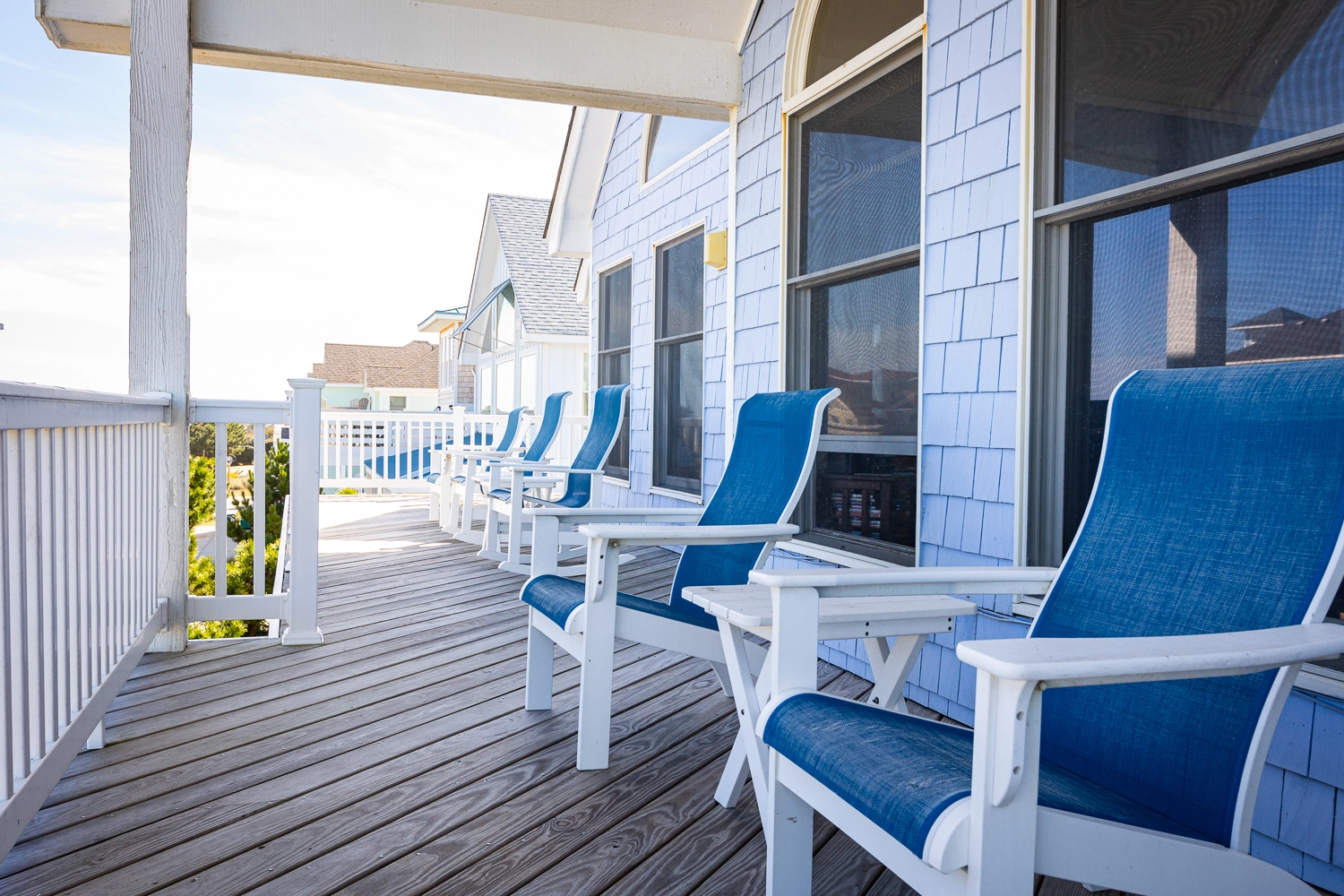"We enjoyed our week at Mother Mother Ocean. The views from the front porch were very good of the sea and the sunrise with comfortable and clean deck chairs both Adirondack and Rocking chair style. Convenient location to beach access that took us 3 minutes to reach. Interior of house was very clean upon arrival. Kitchen had new countertops and cabinets as well as flooring. Lots of work space. Back upper porch was nice to sit out on when the sun went down. Furniture in living area was comfortable. Room for improvements include updating the master bath on the main floor. Shortest toilet I have ever experienced , bed was very hard. Half bath on main level did have an upgraded toilet height👍.Multiple screens throughout the house had holes in them which allowed bugs to come in if opened. All screens and windows needed to be power washed along with the screened in porches on both floors which were filled with dead bugs in order to fully enjoy the view. Dead bugs galore in a pile outside the main door to the upper front deck(due to outdoor light being on).Again needed to be power washed every few weeks. Beach chairs are old and rusty except for one. Geared more for children than adults. Glad we brought our own. Had one issue and it was taken care of promptly that day.Overall nice house in great location with further updates could be excellent."