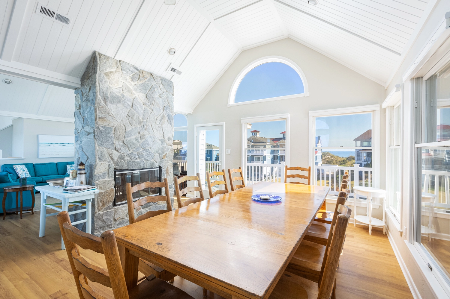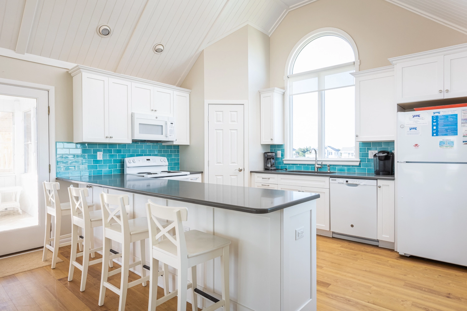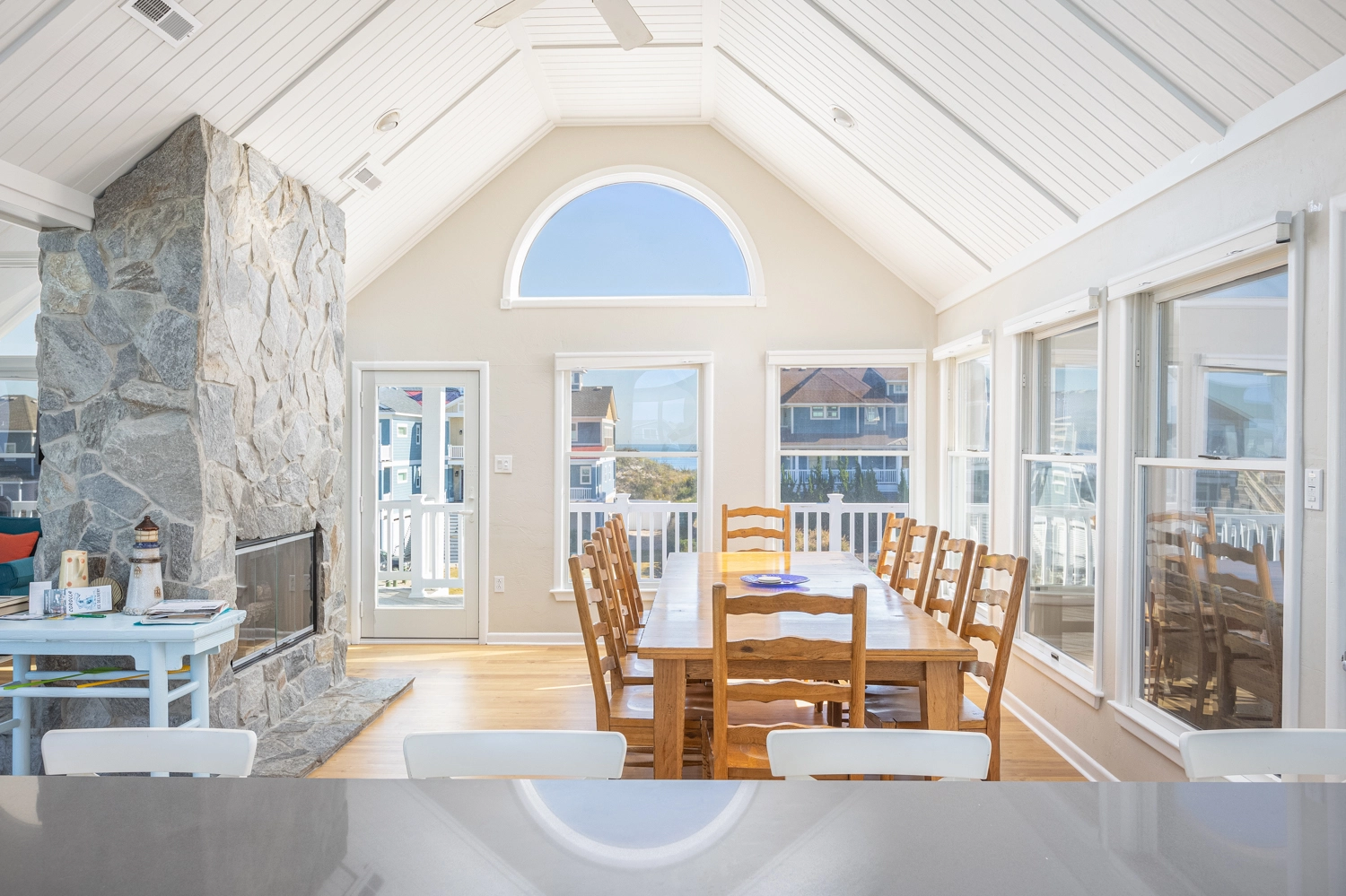 Kitchen with breakfast bar; dining area; screened porch; living room; half bath; ship's watch.