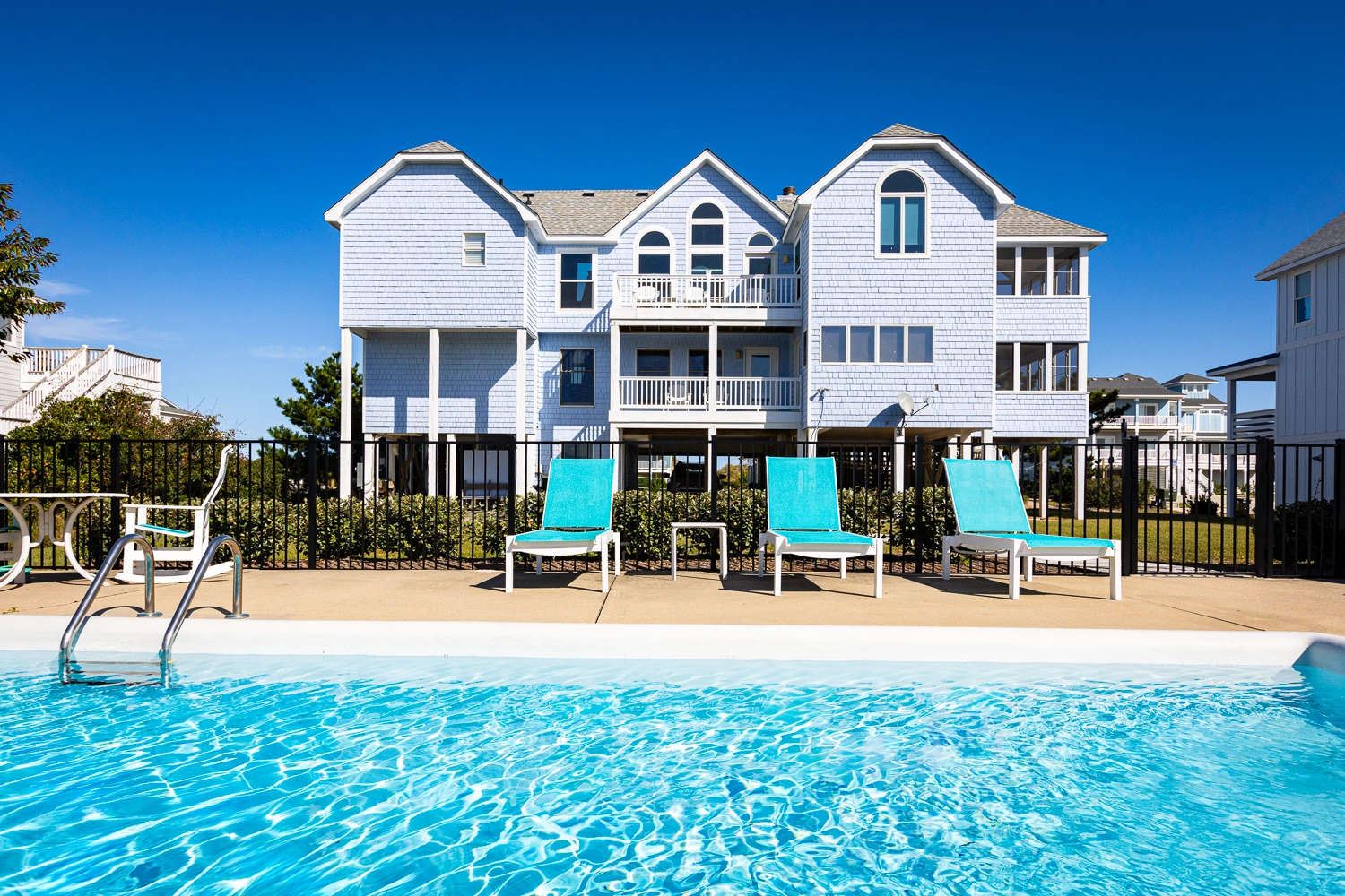 "Beautifully maintained and updated. Generous space for everyone, my granddaughter loves the little furnished nook at the top of the house. The pool is well situated to remain warm and the surrounding greenery offers a feeling of privacy. Our favorite deck faces west for the most spectacular sunsets!"